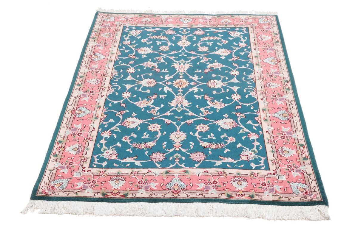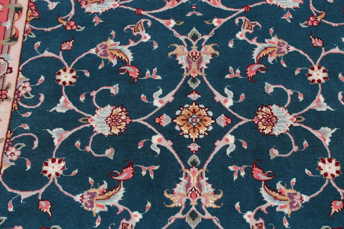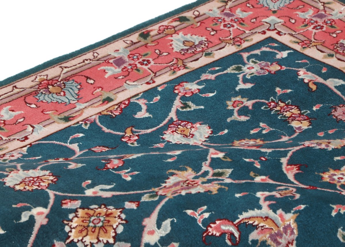 Für die besondere Eleganz des Täbriz-Flors sorgen hervorragende Materialien wie samtig anmutende Korkwolle und glänzende Seidenfäden. Die Knüpfqualität eines Täbriz-Teppichs lässt sich aus der angegebenen Raj-Zahl erschließen – je höher diese ausfällt, umso feiner ist die Knüpfdichte, die eine Million und mehr Knoten pro Quadratmeter erreichen kann. Bei besonders feingeknüpften Qualitäten kommt für die Kette statt des üblichen Baumwollgarns sogar Seide zum Einsatz.