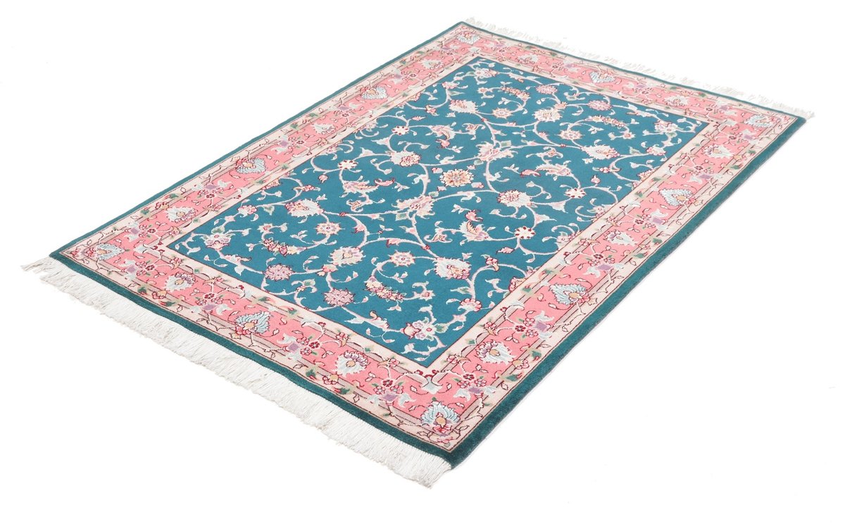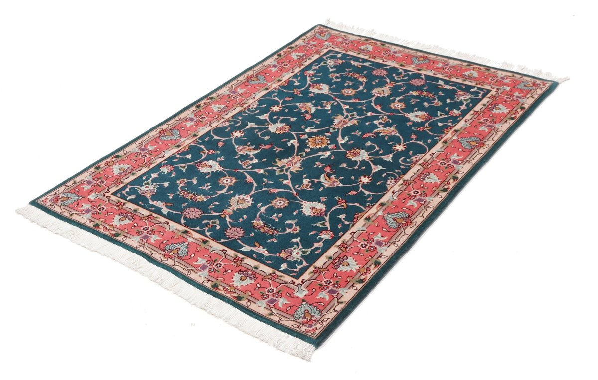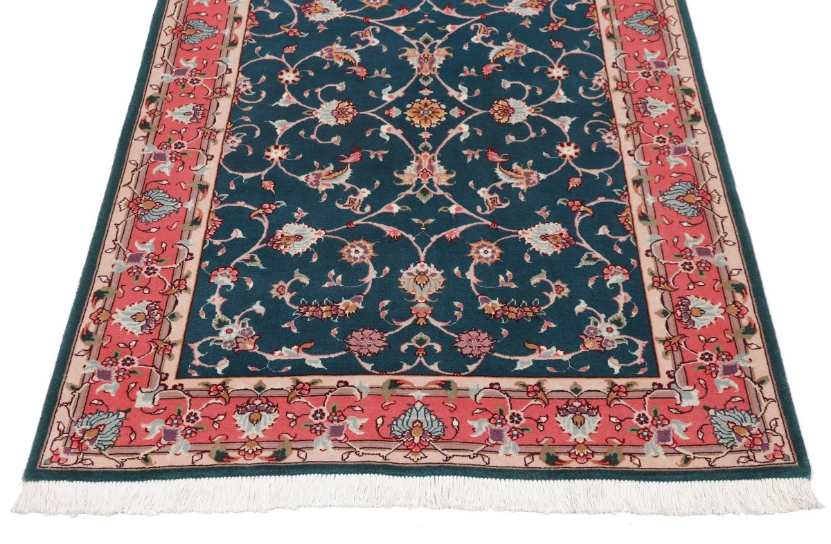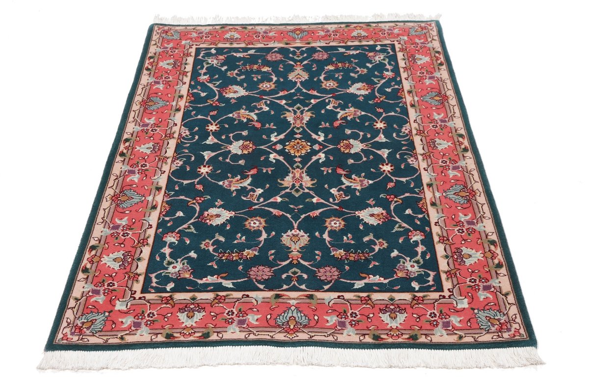 Für die besondere Eleganz des Täbriz-Flors sorgen hervorragende Materialien wie samtig anmutende Korkwolle und glänzende Seidenfäden. Die Knüpfqualität eines Täbriz-Teppichs lässt sich aus der angegebenen Raj-Zahl erschließen – je höher diese ausfällt, umso feiner ist die Knüpfdichte, die eine Million und mehr Knoten pro Quadratmeter erreichen kann. Bei besonders feingeknüpften Qualitäten kommt für die Kette statt des üblichen Baumwollgarns sogar Seide zum Einsatz.