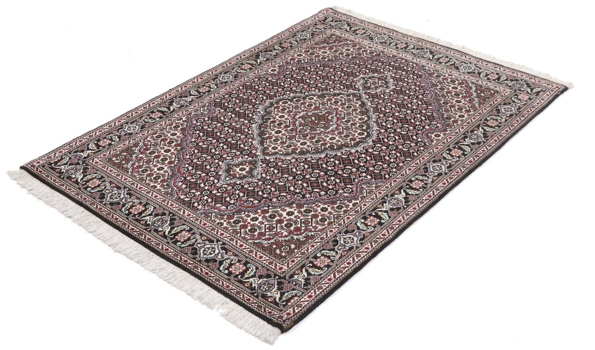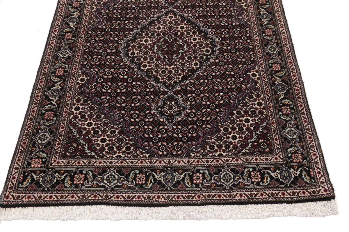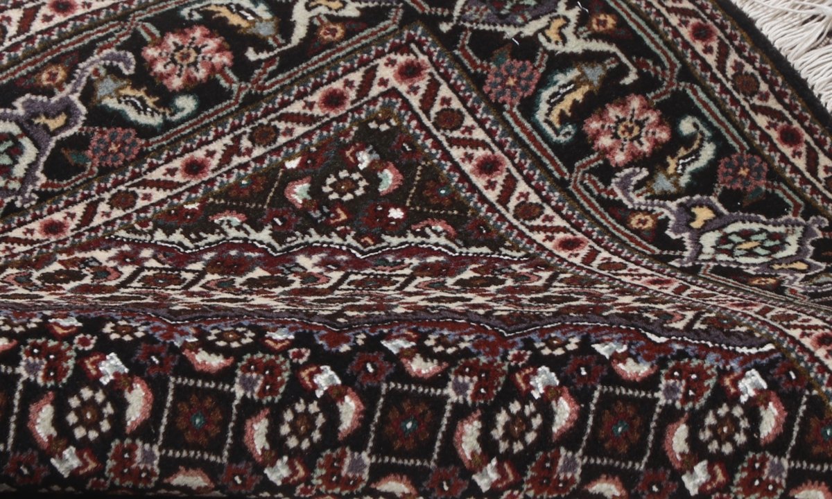 Für die besondere Eleganz des Täbriz-Flors sorgen hervorragende Materialien wie samtig anmutende Korkwolle und glänzende Seidenfäden. Die Knüpfqualität eines Täbriz-Teppichs lässt sich aus der angegebenen Raj-Zahl erschließen – je höher diese ausfällt, umso feiner ist die Knüpfdichte, die eine Million und mehr Knoten pro Quadratmeter erreichen kann. Bei besonders feingeknüpften Qualitäten kommt für die Kette statt des üblichen Baumwollgarns sogar Seide zum Einsatz.