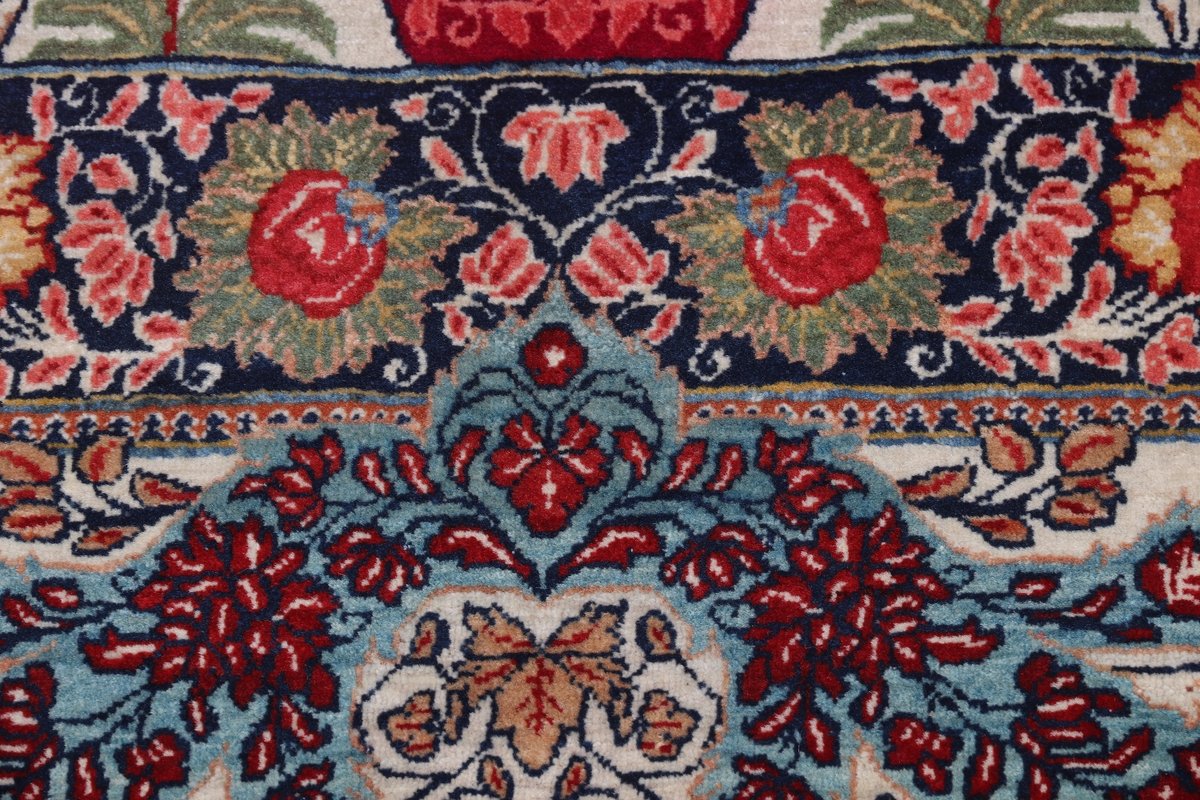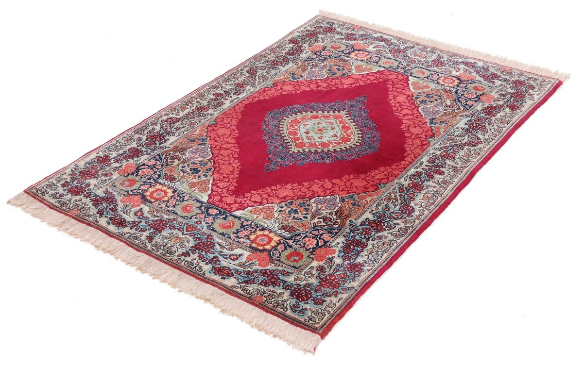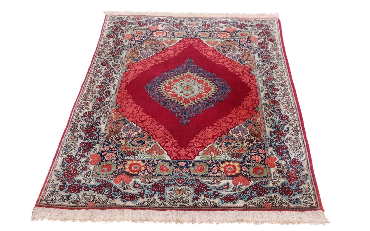 Für die besondere Eleganz des Täbriz-Flors sorgen hervorragende Materialien wie samtig anmutende Korkwolle und glänzende Seidenfäden. Die Knüpfqualität eines Täbriz-Teppichs lässt sich aus der angegebenen Raj-Zahl erschließen – je höher diese ausfällt, umso feiner ist die Knüpfdichte, die eine Million und mehr Knoten pro Quadratmeter erreichen kann. Bei besonders feingeknüpften Qualitäten kommt für die Kette statt des üblichen Baumwollgarns sogar Seide zum Einsatz.