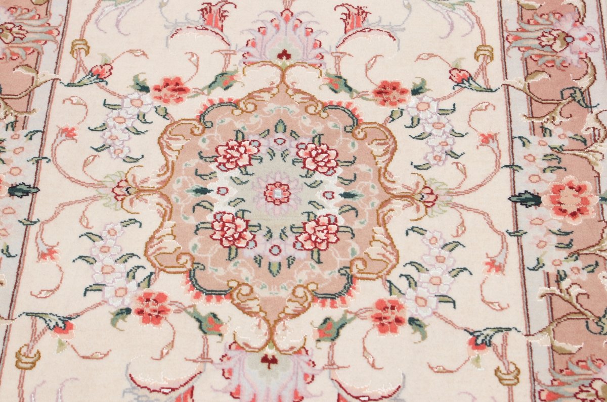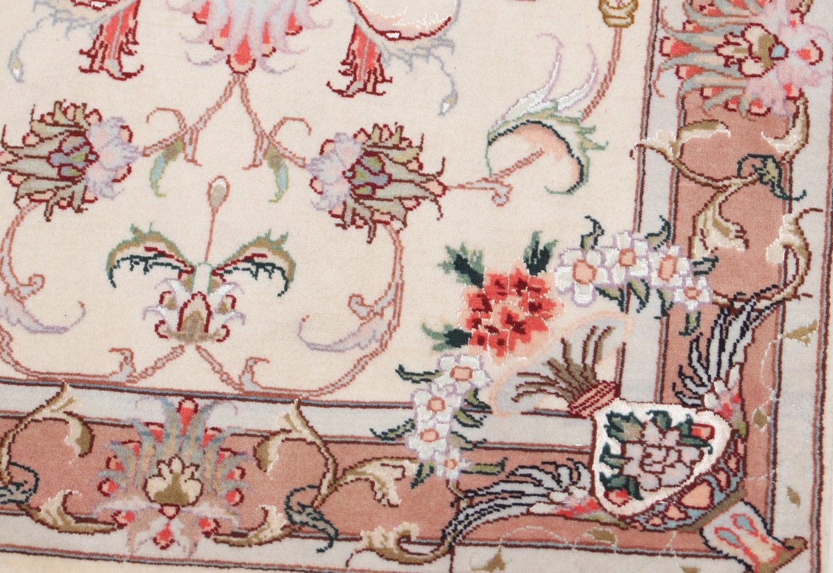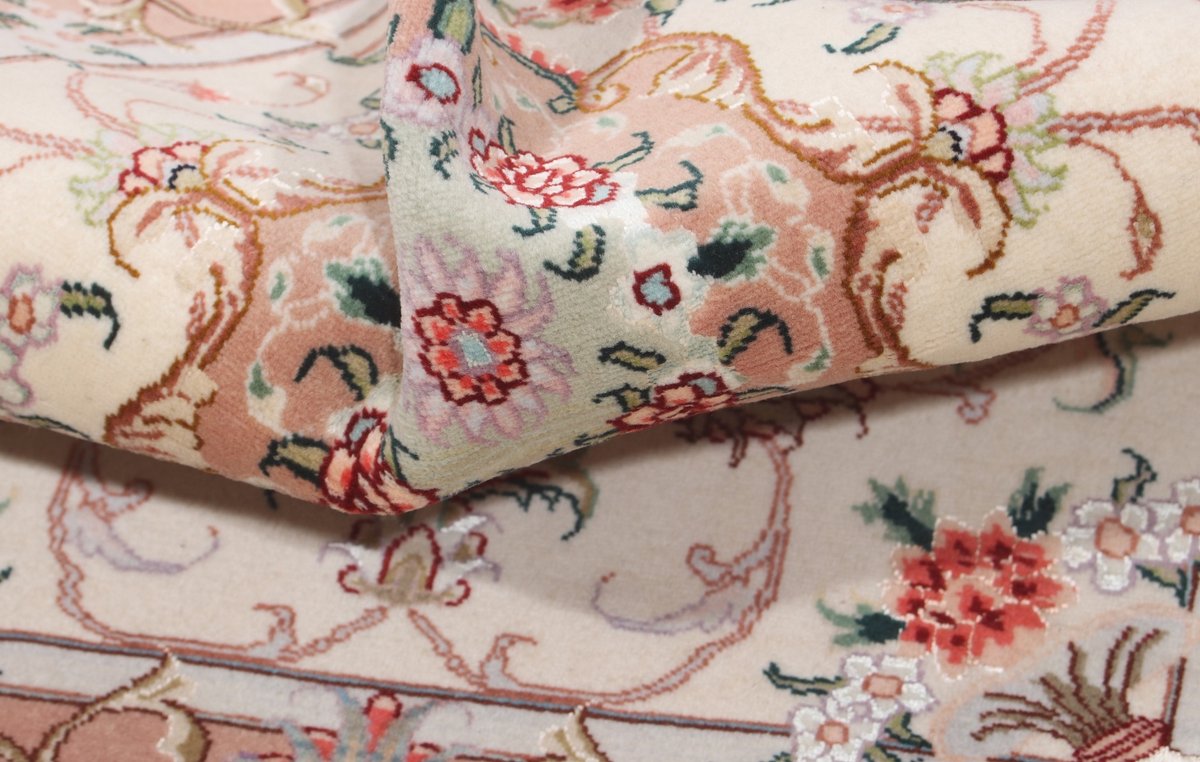 Für die besondere Eleganz des Täbriz-Flors sorgen hervorragende Materialien wie samtig anmutende Korkwolle und glänzende Seidenfäden. Die Knüpfqualität eines Täbriz-Teppichs lässt sich aus der angegebenen Raj-Zahl erschließen – je höher diese ausfällt, umso feiner ist die Knüpfdichte, die eine Million und mehr Knoten pro Quadratmeter erreichen kann. Bei besonders feingeknüpften Qualitäten kommt für die Kette statt des üblichen Baumwollgarns sogar Seide zum Einsatz.