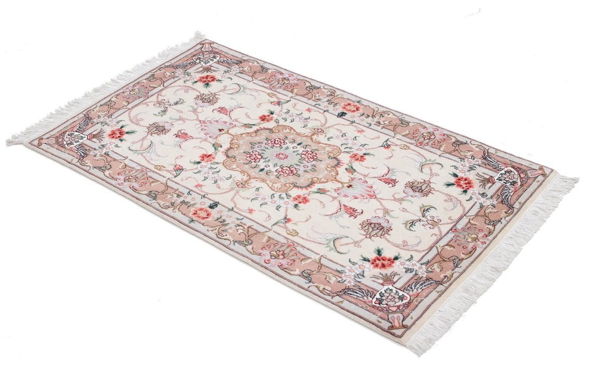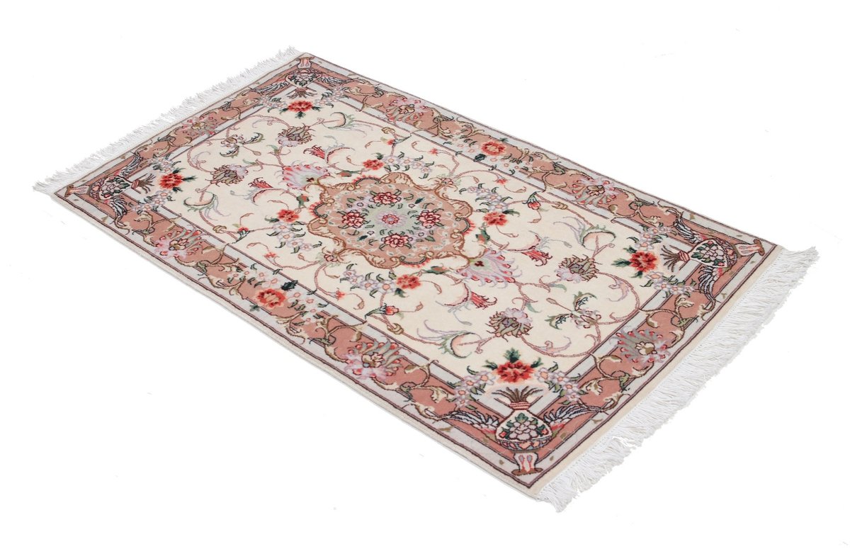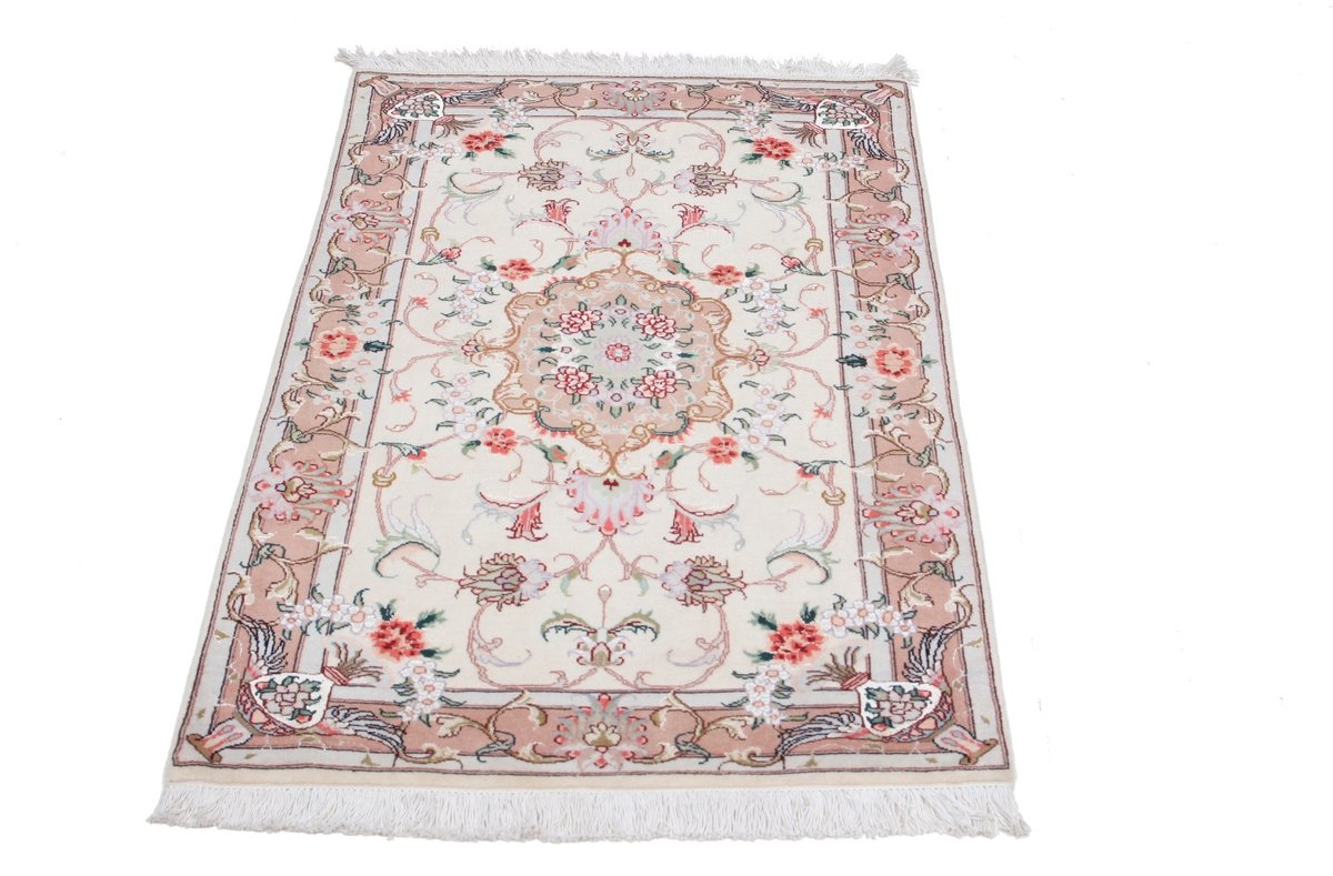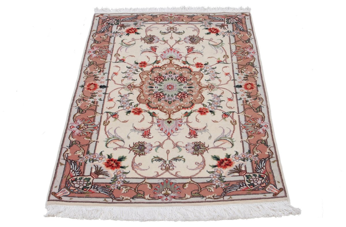Für die besondere Eleganz des Täbriz-Flors sorgen hervorragende Materialien wie samtig anmutende Korkwolle und glänzende Seidenfäden. Die Knüpfqualität eines Täbriz-Teppichs lässt sich aus der angegebenen Raj-Zahl erschließen – je höher diese ausfällt, umso feiner ist die Knüpfdichte, die eine Million und mehr Knoten pro Quadratmeter erreichen kann. Bei besonders feingeknüpften Qualitäten kommt für die Kette statt des üblichen Baumwollgarns sogar Seide zum Einsatz.
