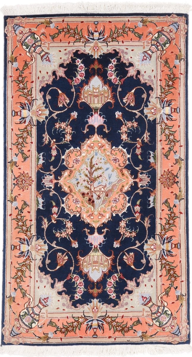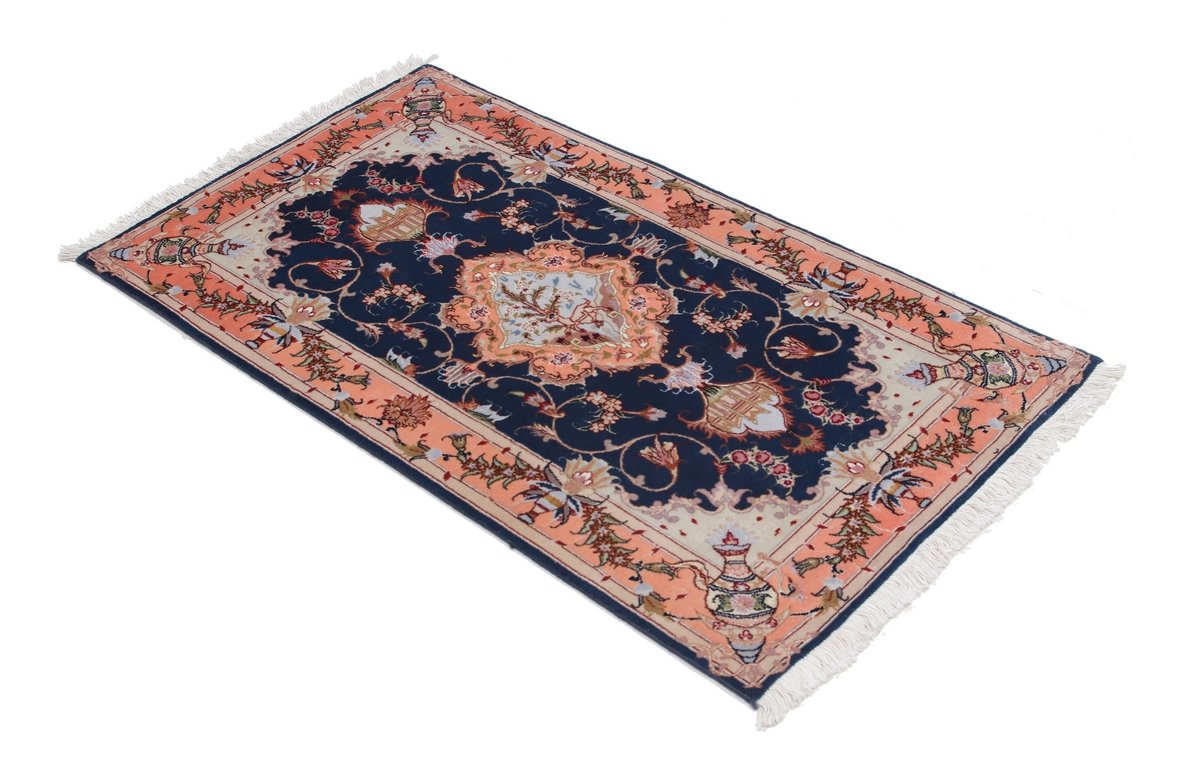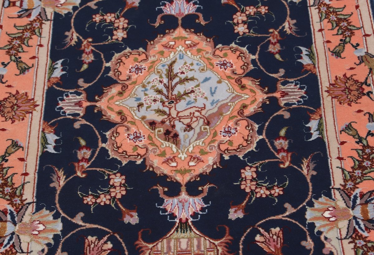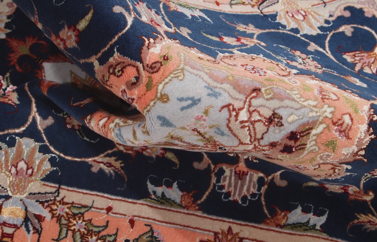 Für die besondere Eleganz des Täbriz-Flors sorgen hervorragende Materialien wie samtig anmutende Korkwolle und glänzende Seidenfäden. Die Knüpfqualität eines Täbriz-Teppichs lässt sich aus der angegebenen Raj-Zahl erschließen – je höher diese ausfällt, umso feiner ist die Knüpfdichte, die eine Million und mehr Knoten pro Quadratmeter erreichen kann. Bei besonders feingeknüpften Qualitäten kommt für die Kette statt des üblichen Baumwollgarns sogar Seide zum Einsatz.