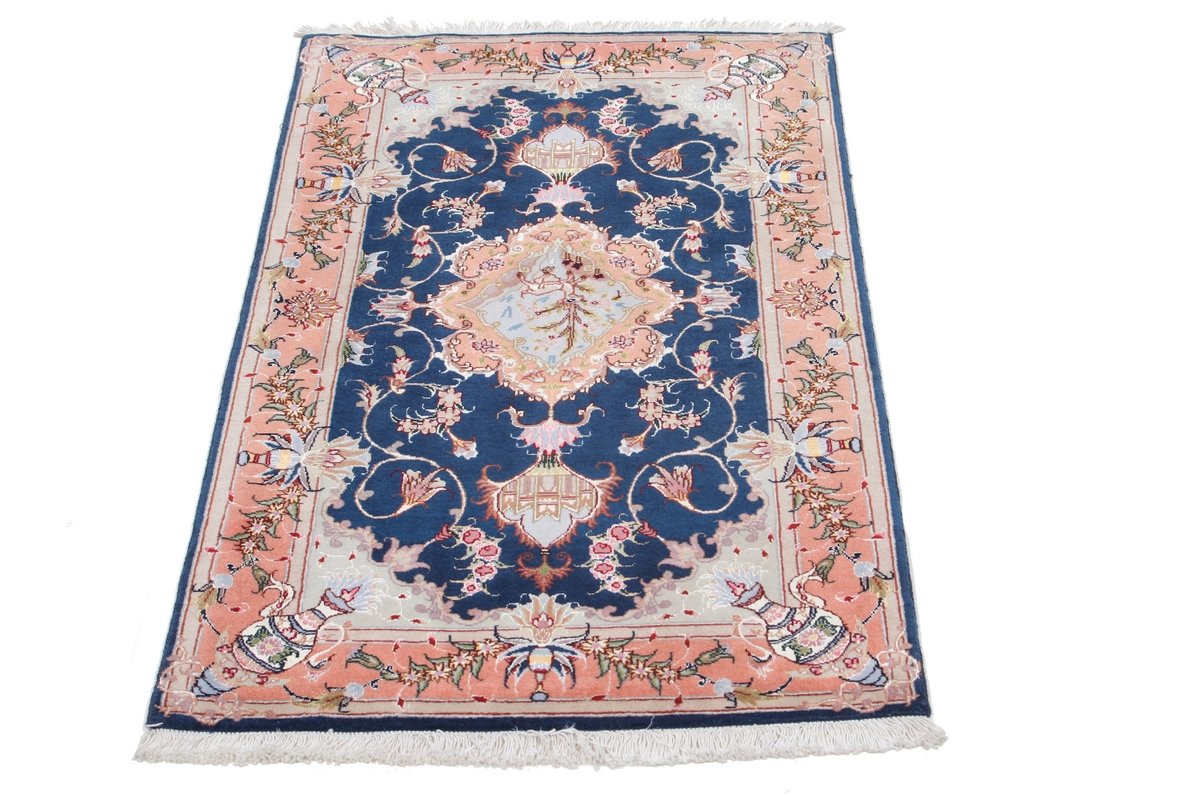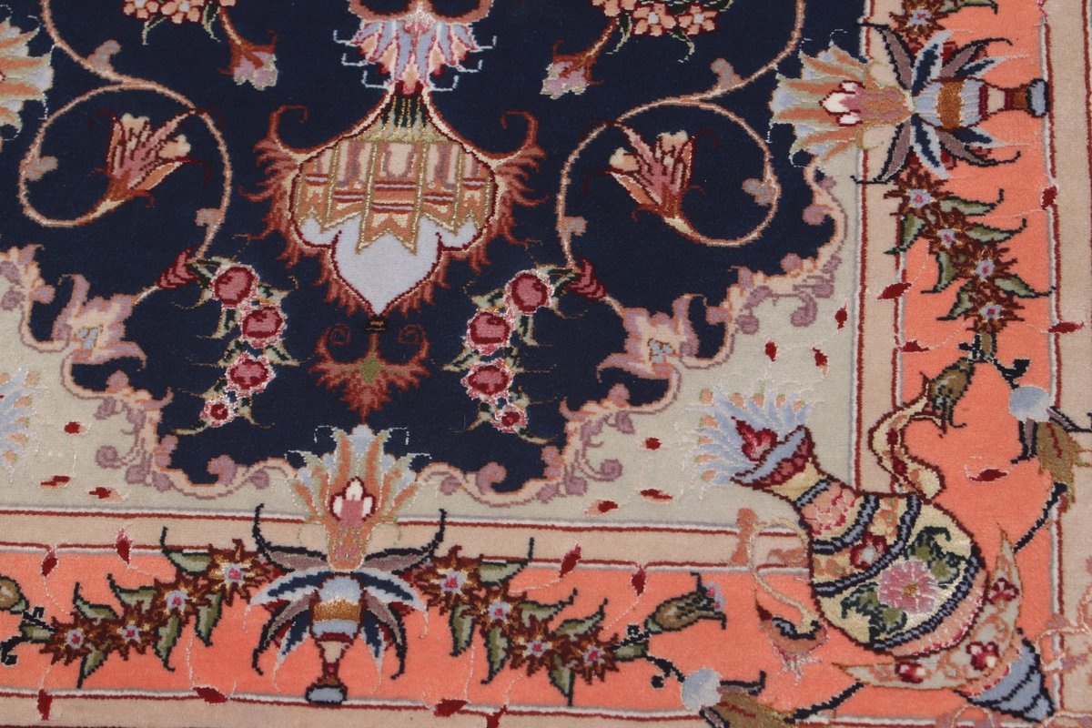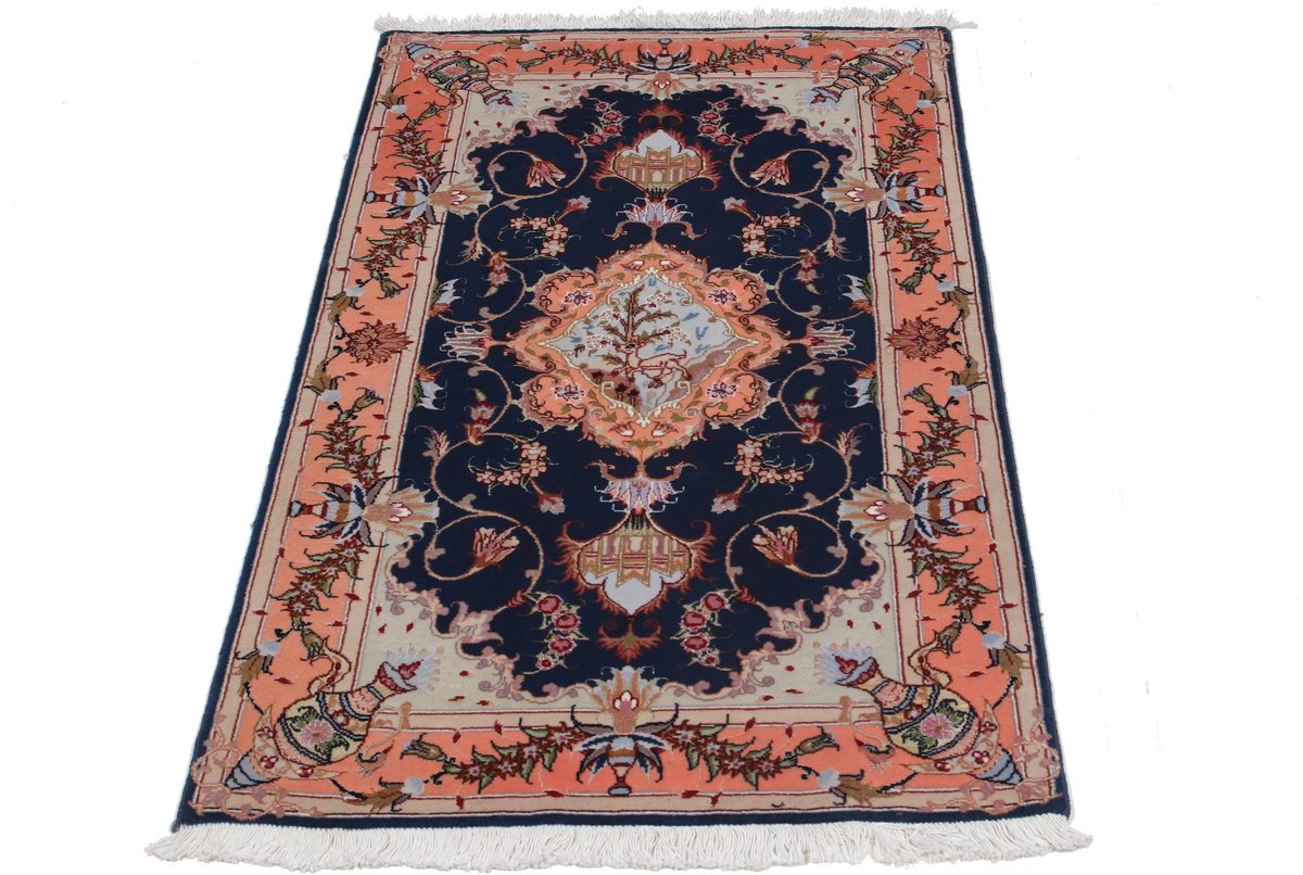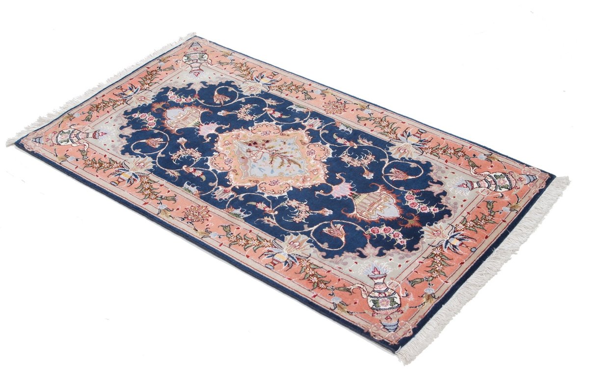 Für die besondere Eleganz des Täbriz-Flors sorgen hervorragende Materialien wie samtig anmutende Korkwolle und glänzende Seidenfäden. Die Knüpfqualität eines Täbriz-Teppichs lässt sich aus der angegebenen Raj-Zahl erschließen – je höher diese ausfällt, umso feiner ist die Knüpfdichte, die eine Million und mehr Knoten pro Quadratmeter erreichen kann. Bei besonders feingeknüpften Qualitäten kommt für die Kette statt des üblichen Baumwollgarns sogar Seide zum Einsatz.
