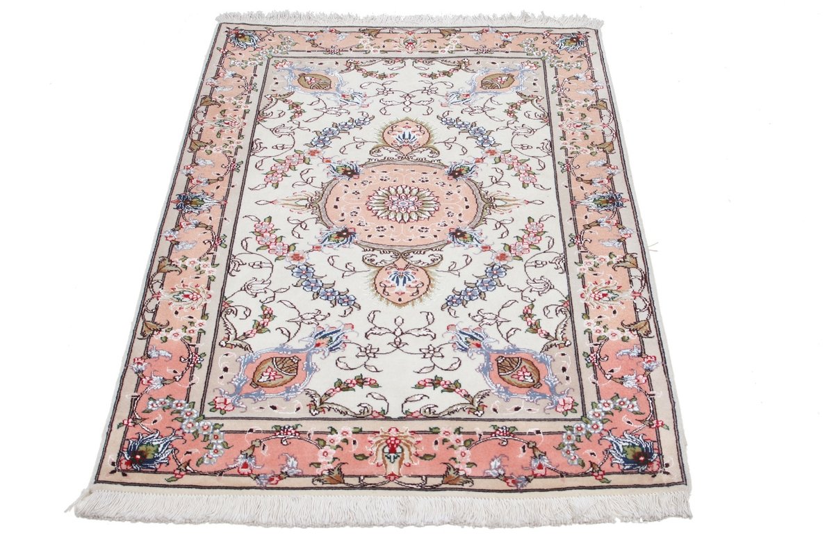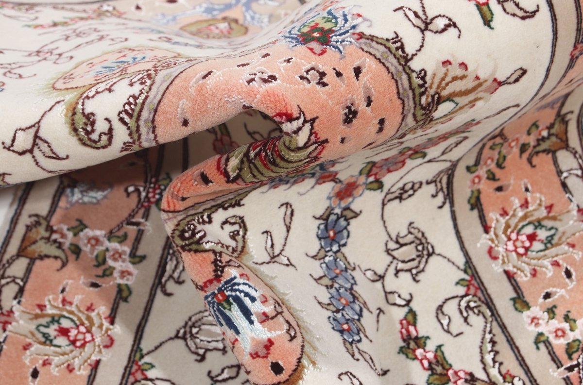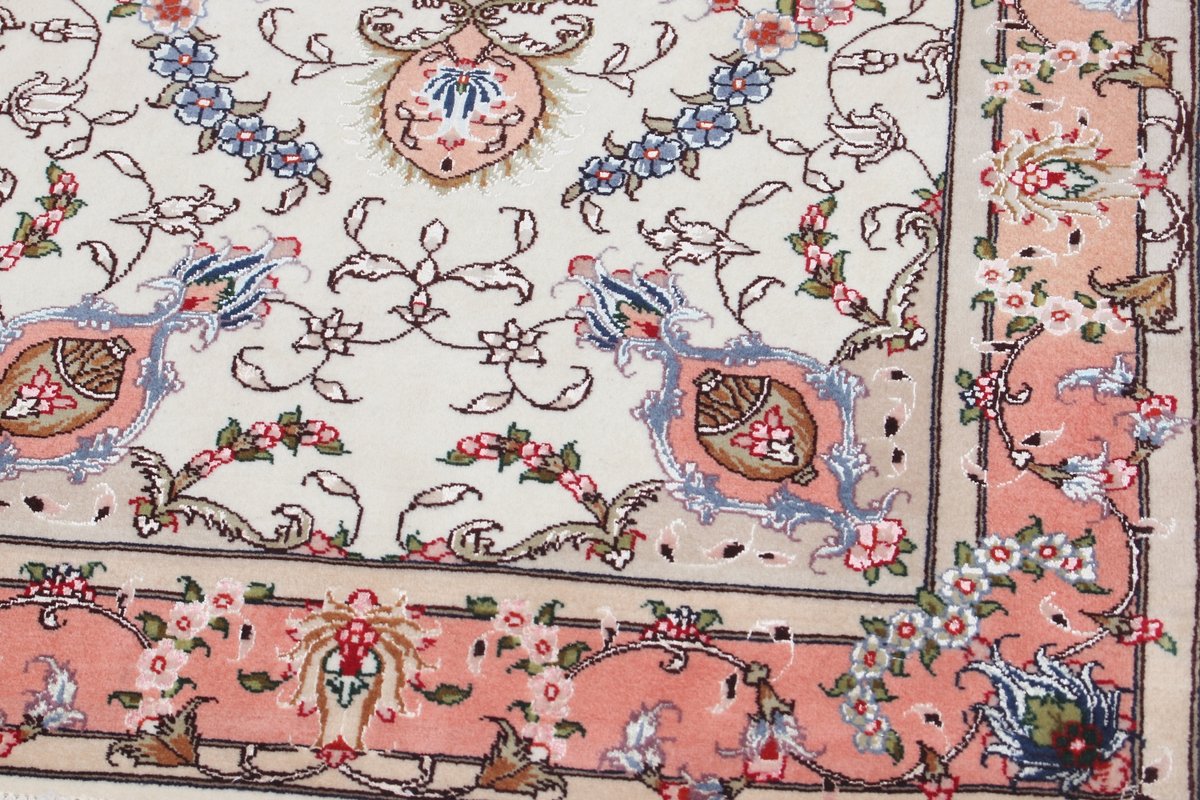 Für die besondere Eleganz des Täbriz-Flors sorgen hervorragende Materialien wie samtig anmutende Korkwolle und glänzende Seidenfäden. Die Knüpfqualität eines Täbriz-Teppichs lässt sich aus der angegebenen Raj-Zahl erschließen – je höher diese ausfällt, umso feiner ist die Knüpfdichte, die eine Million und mehr Knoten pro Quadratmeter erreichen kann. Bei besonders feingeknüpften Qualitäten kommt für die Kette statt des üblichen Baumwollgarns sogar Seide zum Einsatz.