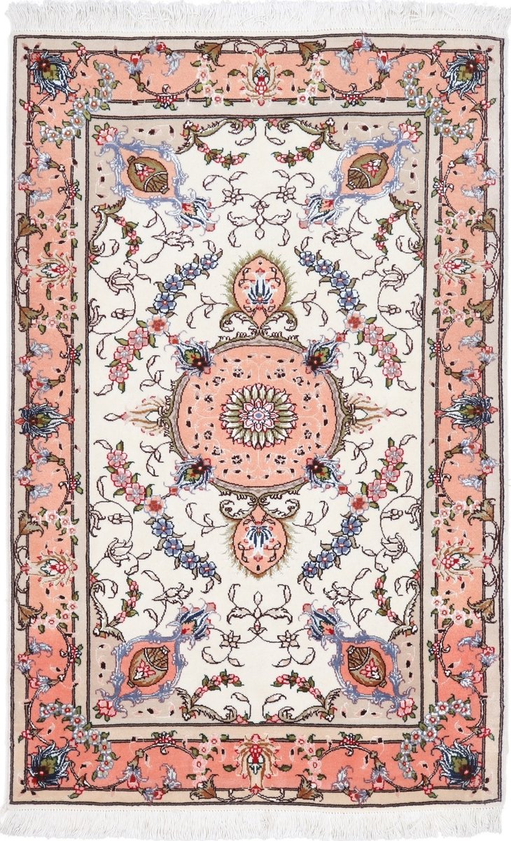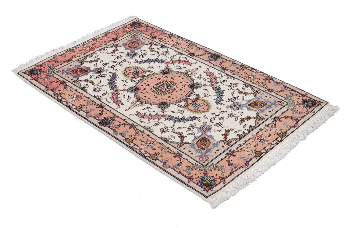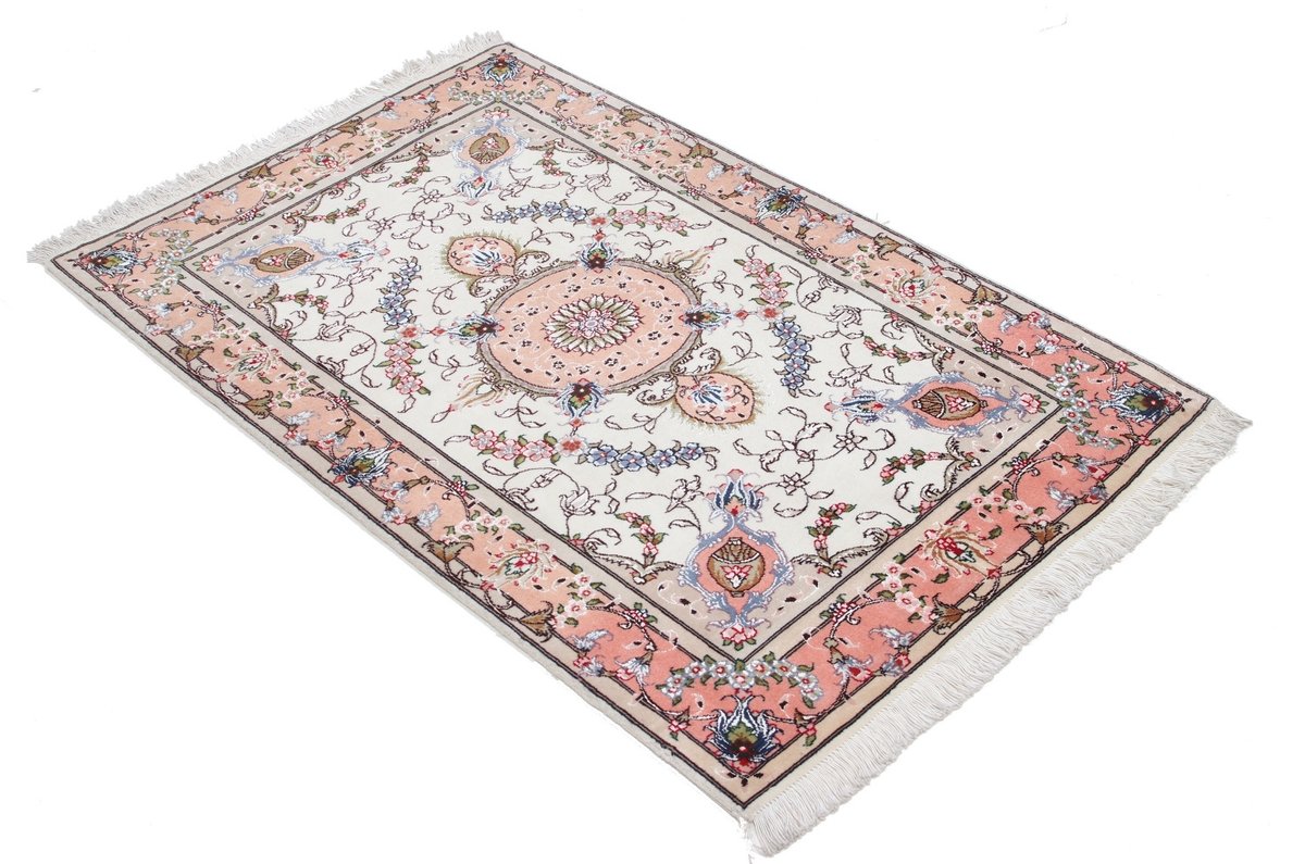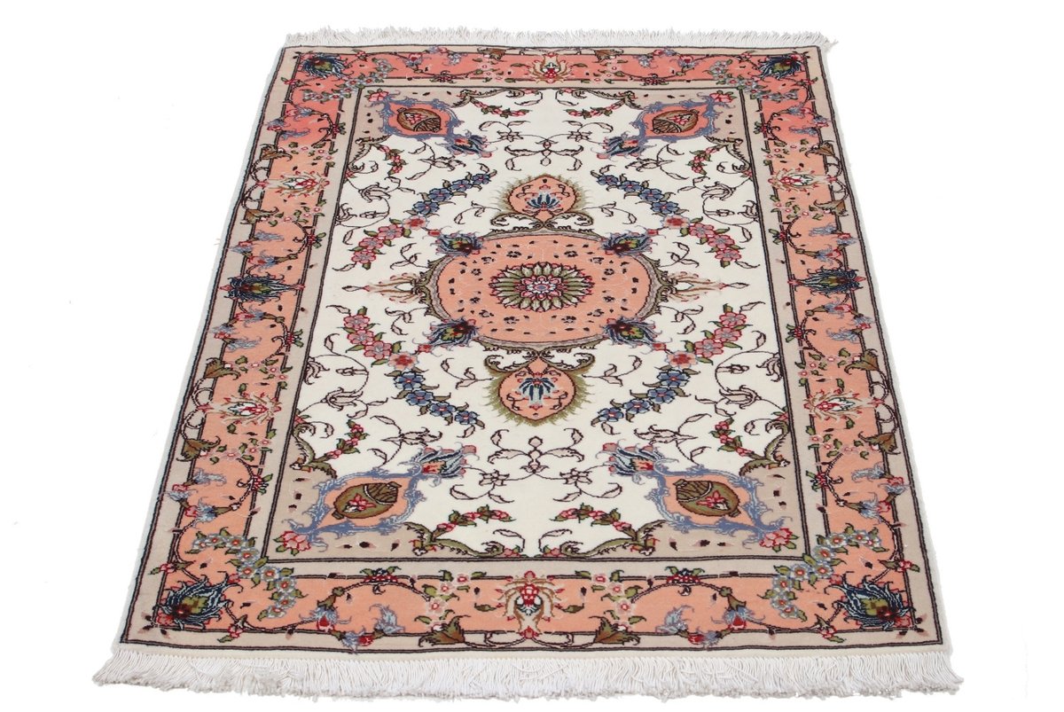 Für die besondere Eleganz des Täbriz-Flors sorgen hervorragende Materialien wie samtig anmutende Korkwolle und glänzende Seidenfäden. Die Knüpfqualität eines Täbriz-Teppichs lässt sich aus der angegebenen Raj-Zahl erschließen – je höher diese ausfällt, umso feiner ist die Knüpfdichte, die eine Million und mehr Knoten pro Quadratmeter erreichen kann. Bei besonders feingeknüpften Qualitäten kommt für die Kette statt des üblichen Baumwollgarns sogar Seide zum Einsatz.