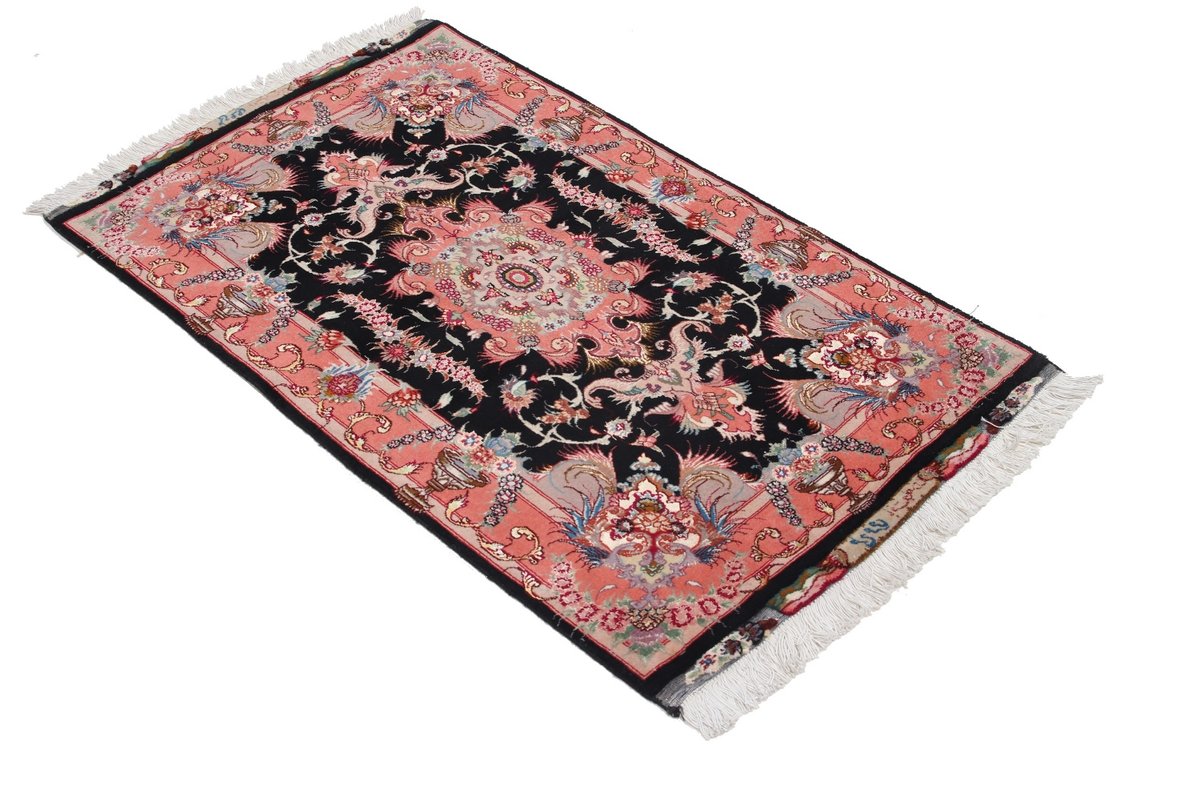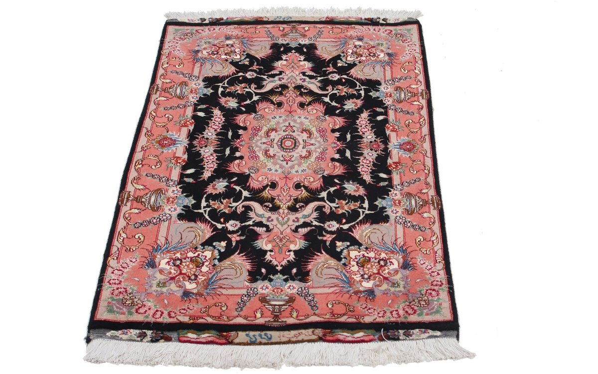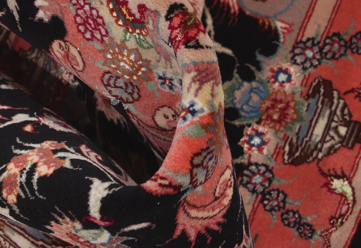 Für die besondere Eleganz des Täbriz-Flors sorgen hervorragende Materialien wie samtig anmutende Korkwolle und glänzende Seidenfäden. Die Knüpfqualität eines Täbriz-Teppichs lässt sich aus der angegebenen Raj-Zahl erschließen – je höher diese ausfällt, umso feiner ist die Knüpfdichte, die eine Million und mehr Knoten pro Quadratmeter erreichen kann. Bei besonders feingeknüpften Qualitäten kommt für die Kette statt des üblichen Baumwollgarns sogar Seide zum Einsatz.