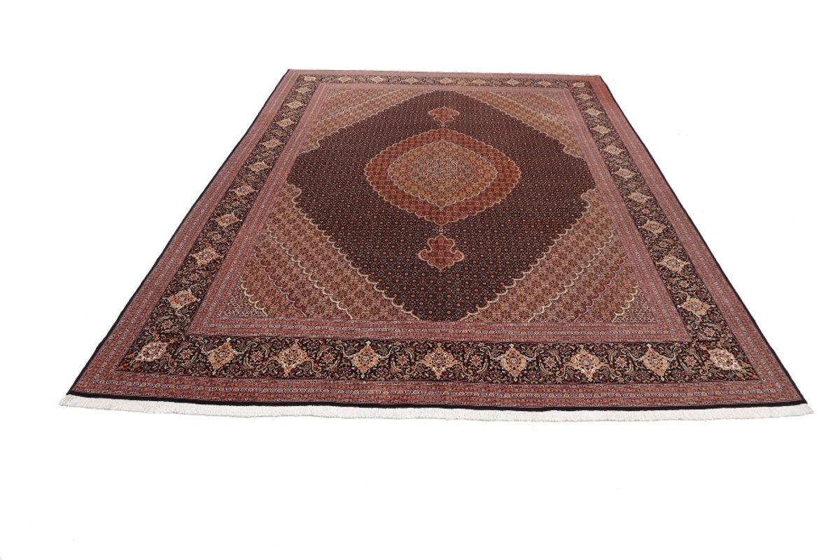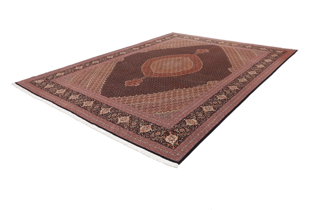 Für die besondere Eleganz des Täbriz-Flors sorgen hervorragende Materialien wie samtig anmutende Korkwolle und glänzende Seidenfäden. Die Knüpfqualität eines Täbriz-Teppichs lässt sich aus der angegebenen Raj-Zahl erschließen – je höher diese ausfällt, umso feiner ist die Knüpfdichte, die eine Million und mehr Knoten pro Quadratmeter erreichen kann. Bei besonders feingeknüpften Qualitäten kommt für die Kette statt des üblichen Baumwollgarns sogar Seide zum Einsatz.