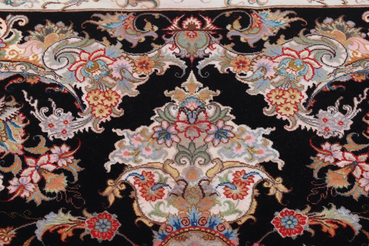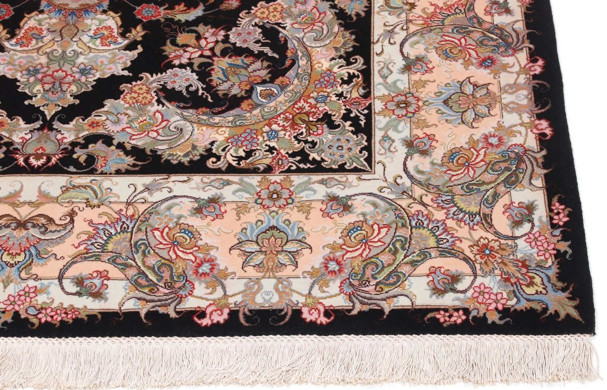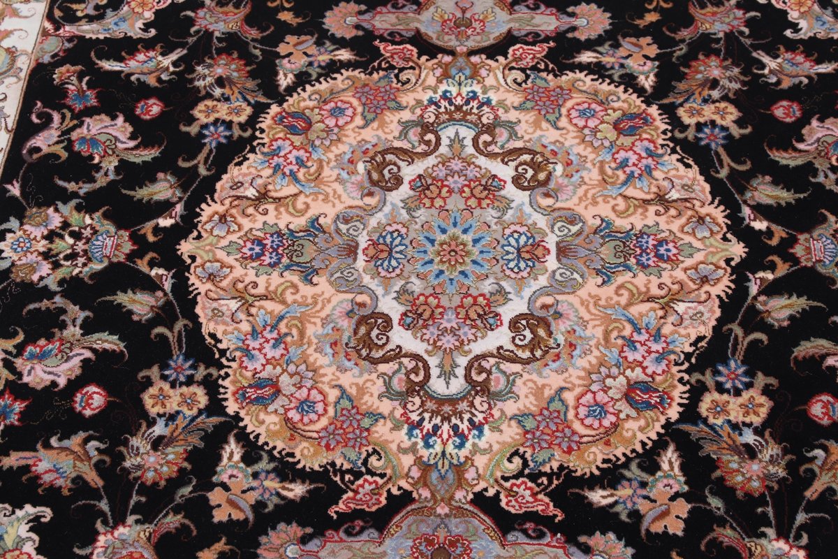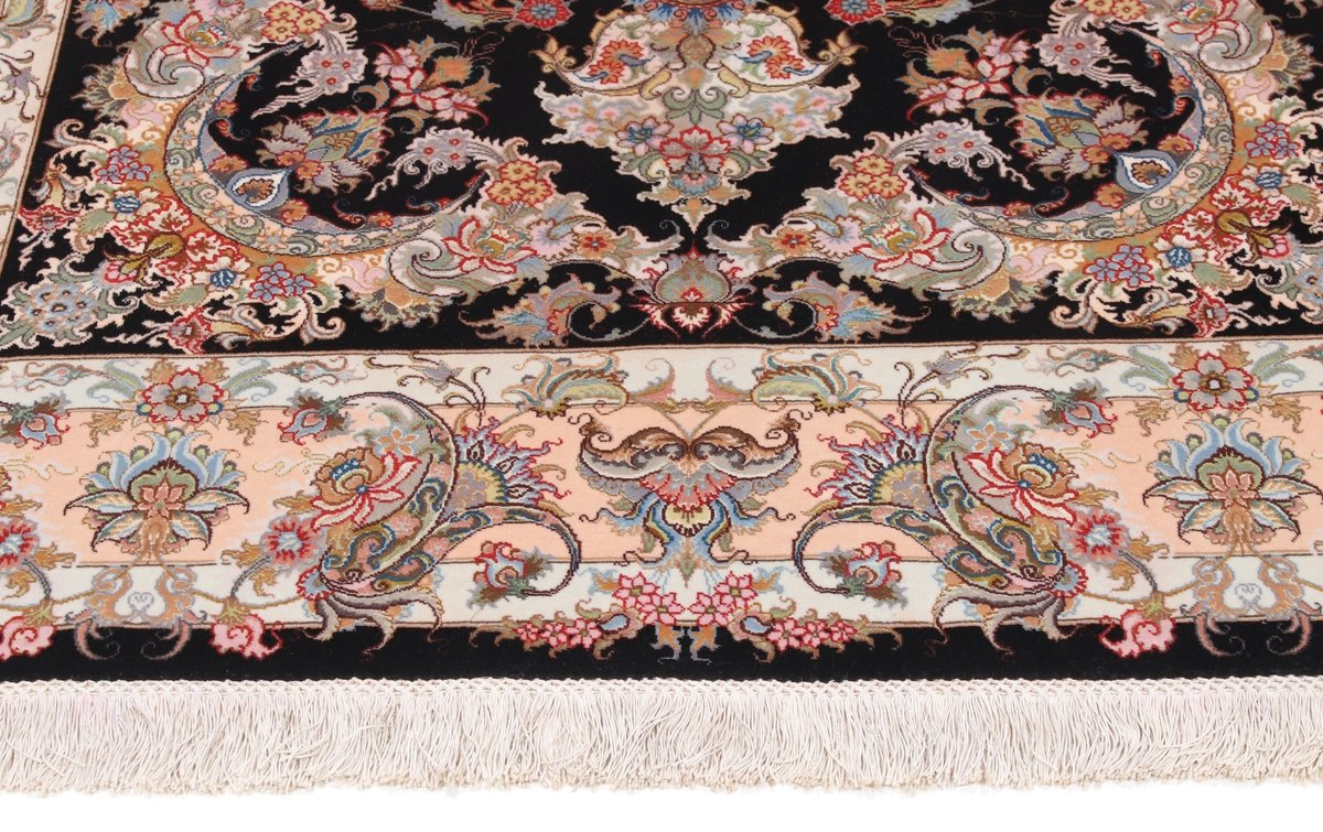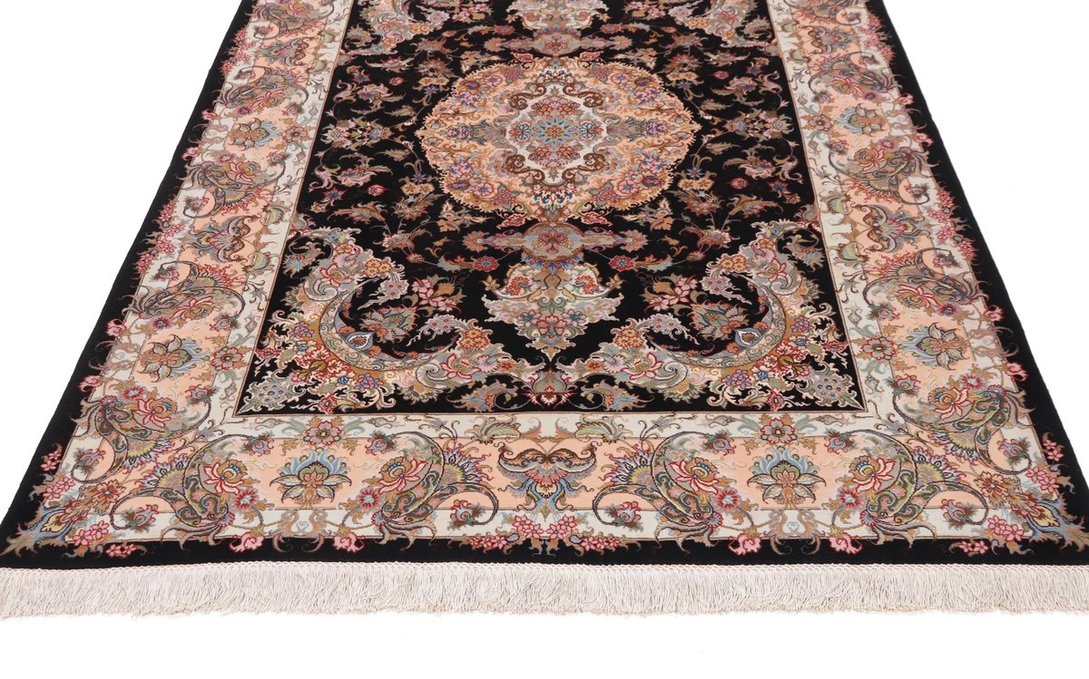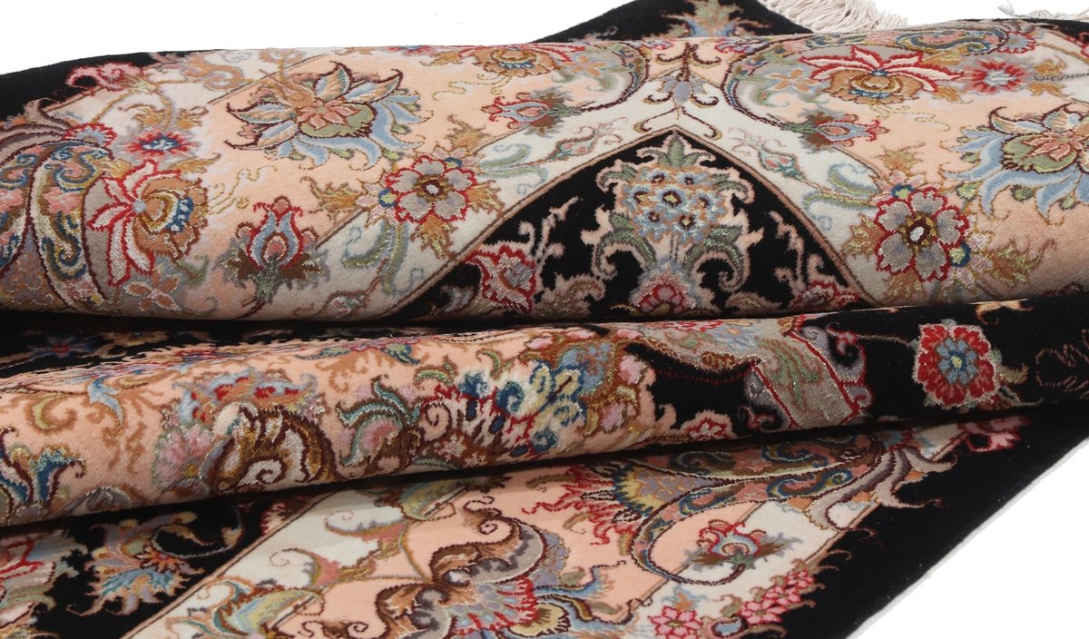 Für die besondere Eleganz des Täbriz-Flors sorgen hervorragende Materialien wie samtig anmutende Korkwolle und glänzende Seidenfäden. Die Knüpfqualität eines Täbriz-Teppichs lässt sich aus der angegebenen Raj-Zahl erschließen – je höher diese ausfällt, umso feiner ist die Knüpfdichte, die eine Million und mehr Knoten pro Quadratmeter erreichen kann. Bei besonders feingeknüpften Qualitäten kommt für die Kette statt des üblichen Baumwollgarns sogar Seide zum Einsatz.