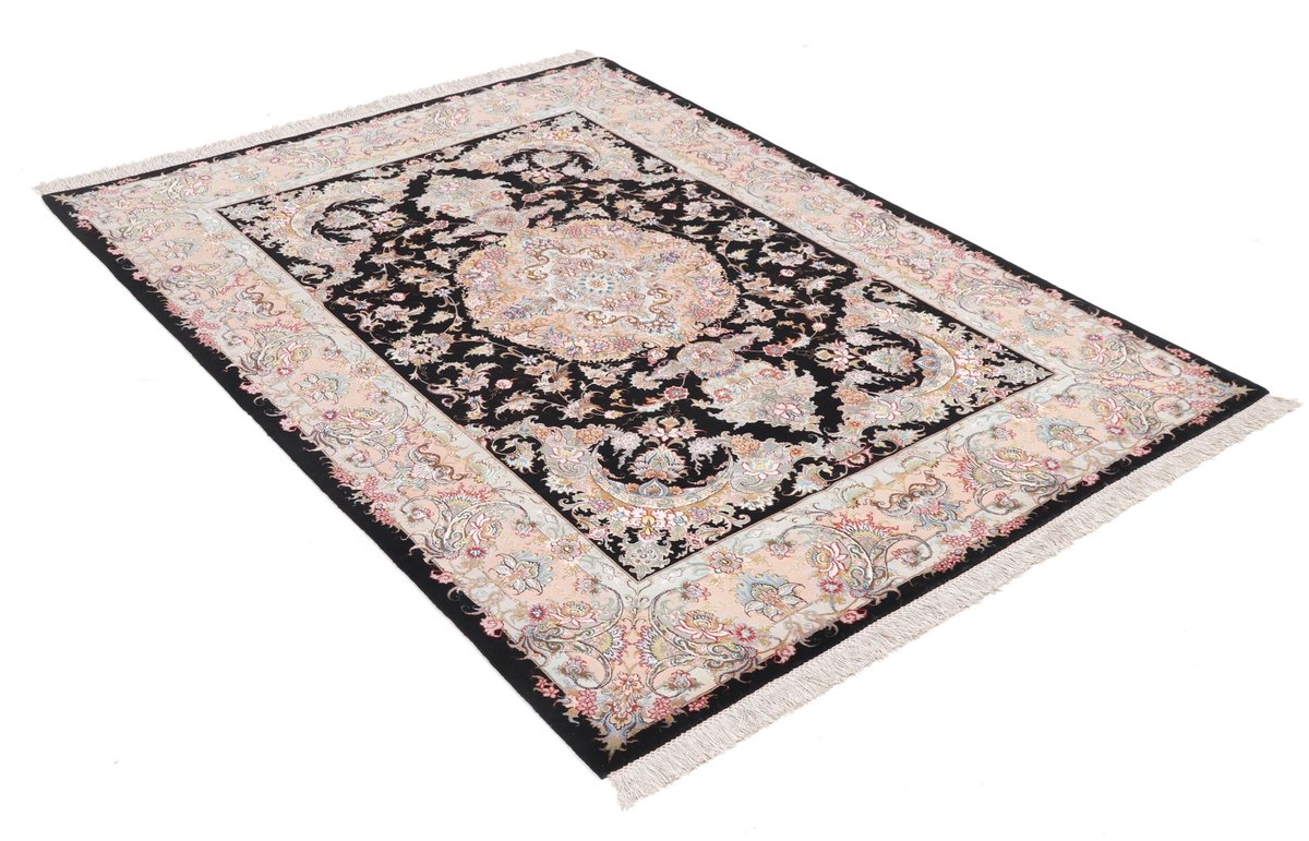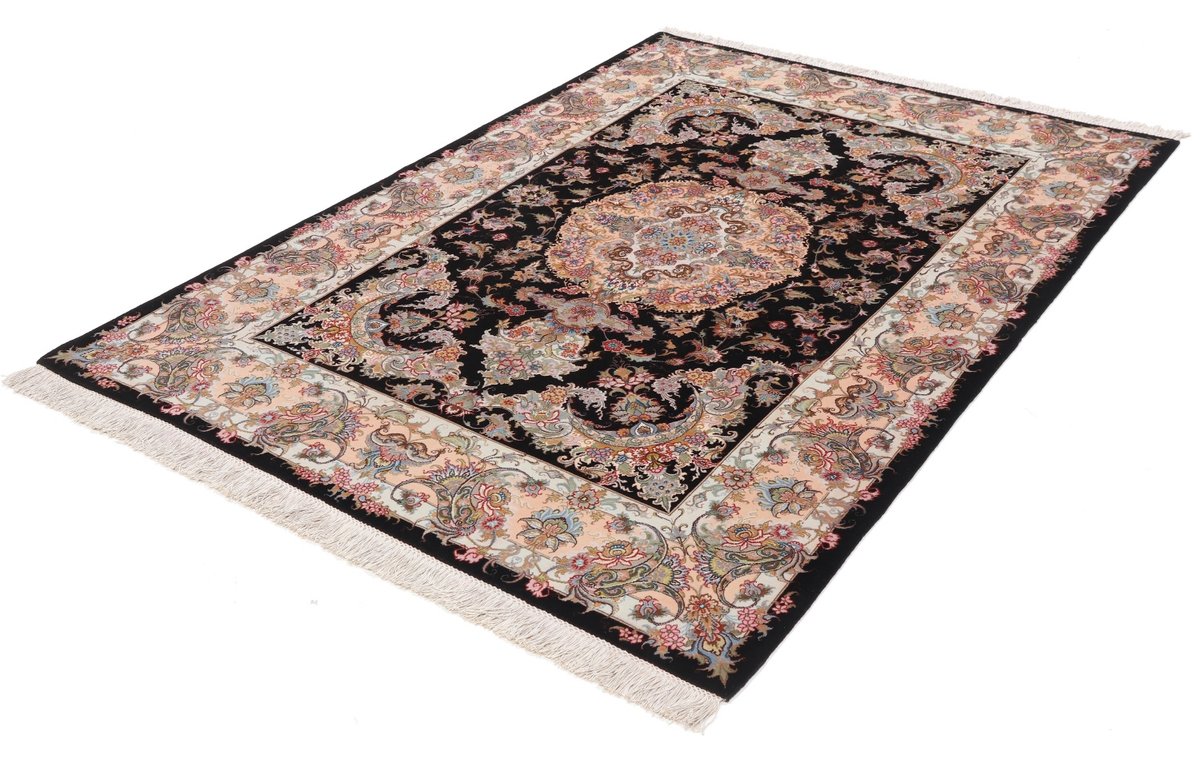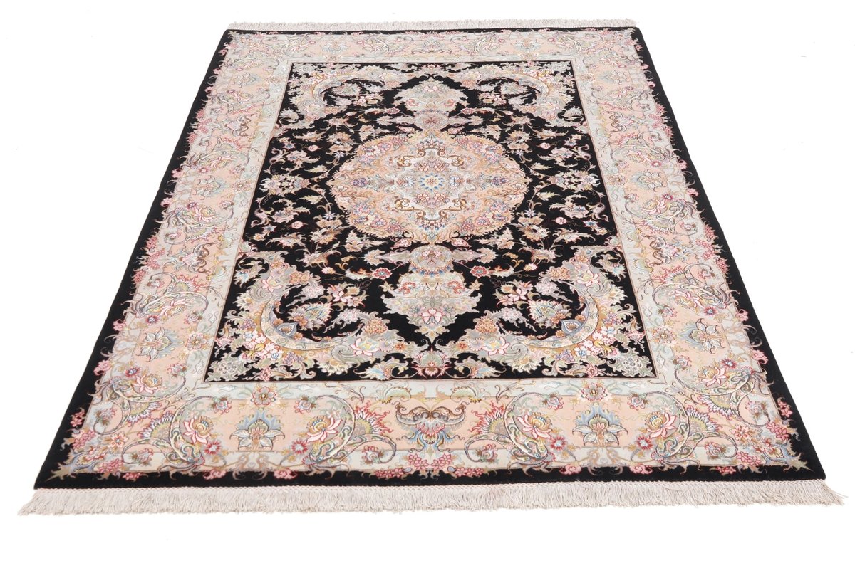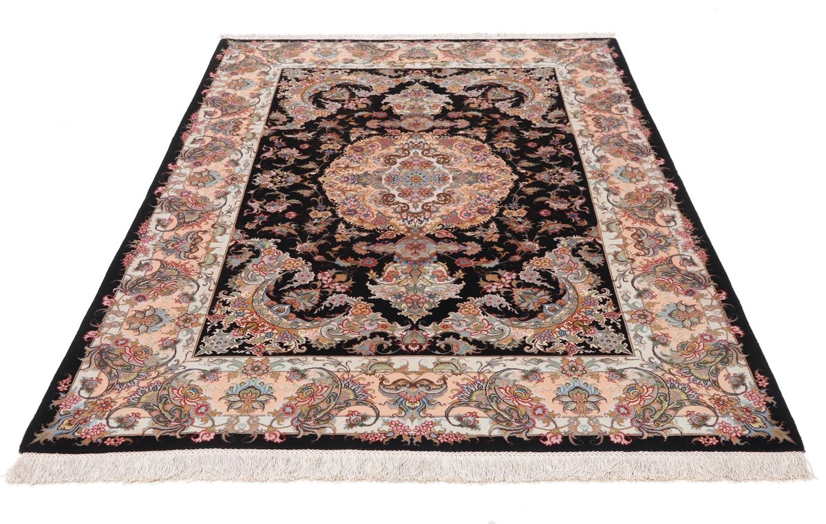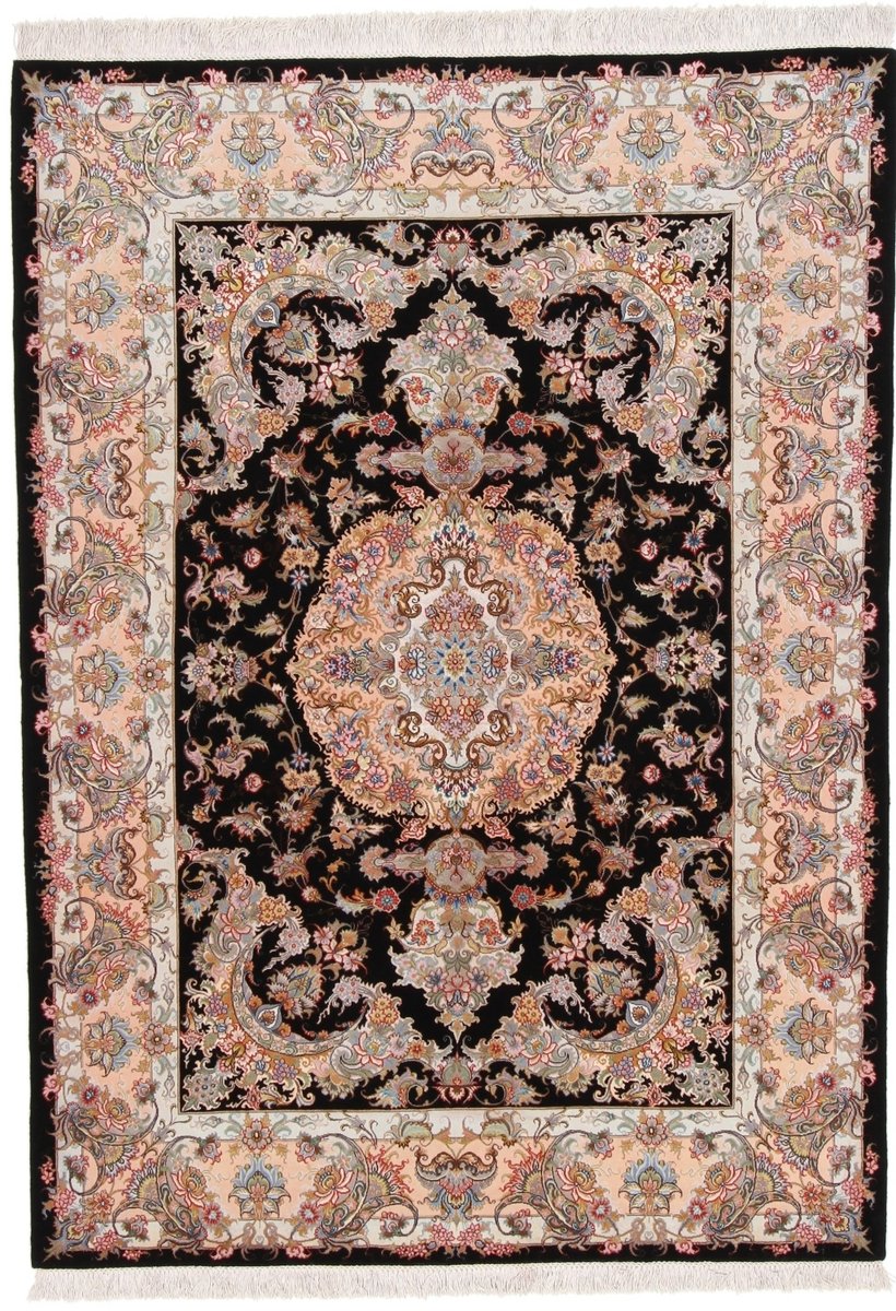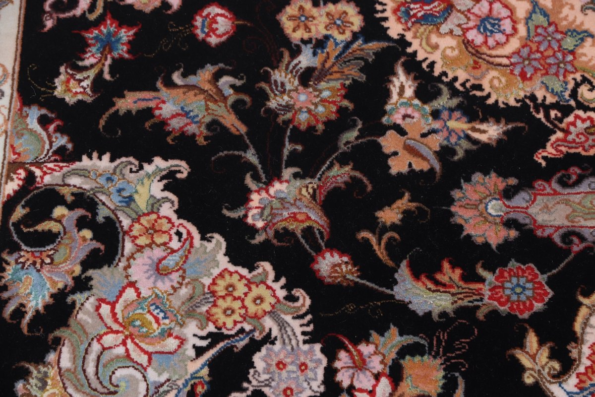 Für die besondere Eleganz des Täbriz-Flors sorgen hervorragende Materialien wie samtig anmutende Korkwolle und glänzende Seidenfäden. Die Knüpfqualität eines Täbriz-Teppichs lässt sich aus der angegebenen Raj-Zahl erschließen – je höher diese ausfällt, umso feiner ist die Knüpfdichte, die eine Million und mehr Knoten pro Quadratmeter erreichen kann. Bei besonders feingeknüpften Qualitäten kommt für die Kette statt des üblichen Baumwollgarns sogar Seide zum Einsatz.