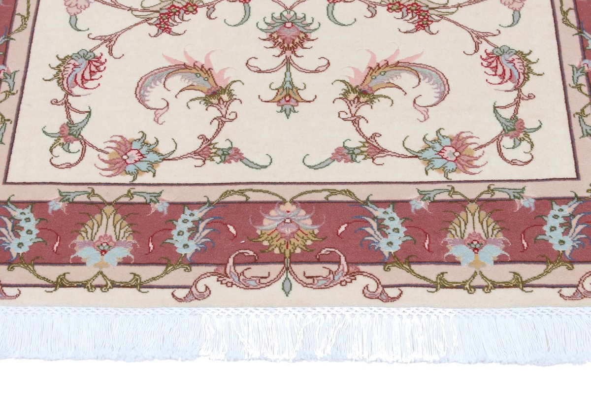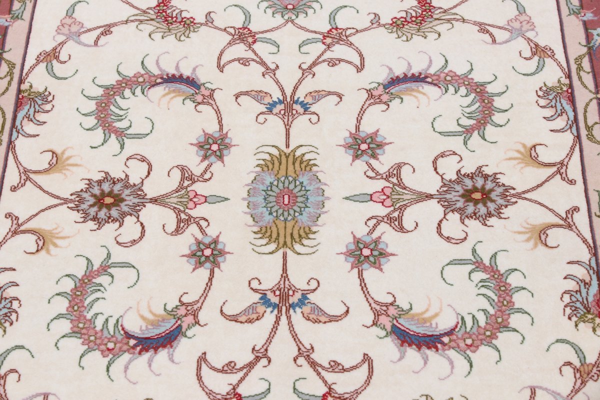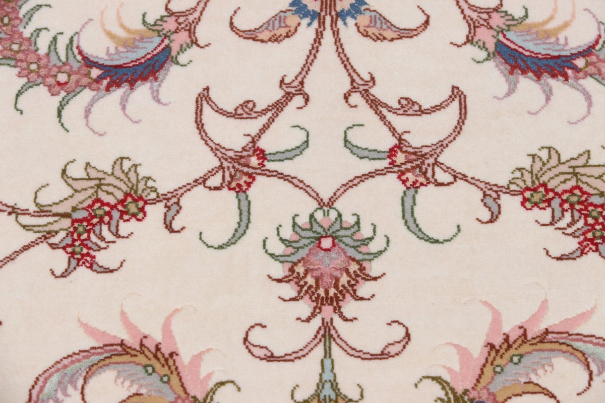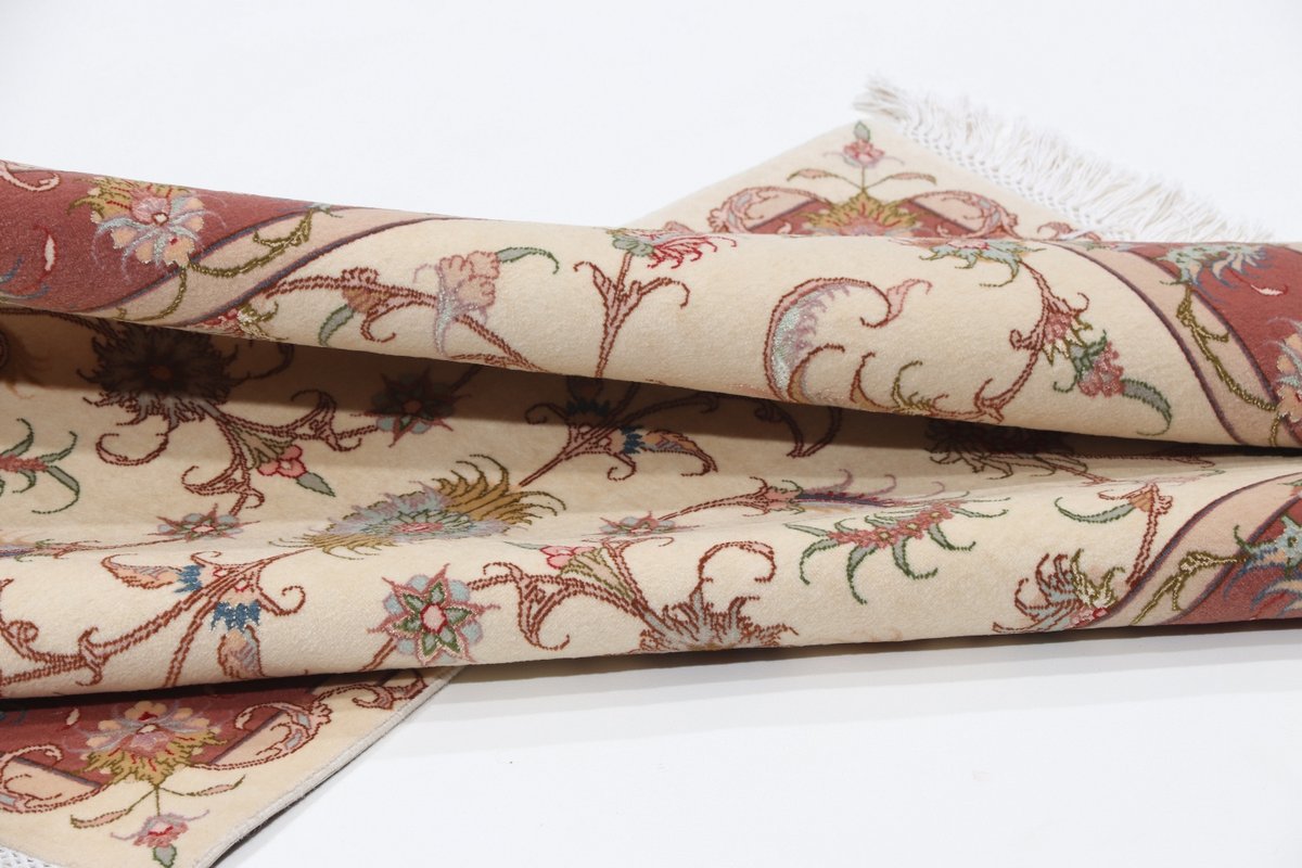 Für die besondere Eleganz des Täbriz-Flors sorgen hervorragende Materialien wie samtig anmutende Korkwolle und glänzende Seidenfäden. Die Knüpfqualität eines Täbriz-Teppichs lässt sich aus der angegebenen Raj-Zahl erschließen – je höher diese ausfällt, umso feiner ist die Knüpfdichte, die eine Million und mehr Knoten pro Quadratmeter erreichen kann. Bei besonders feingeknüpften Qualitäten kommt für die Kette statt des üblichen Baumwollgarns sogar Seide zum Einsatz.