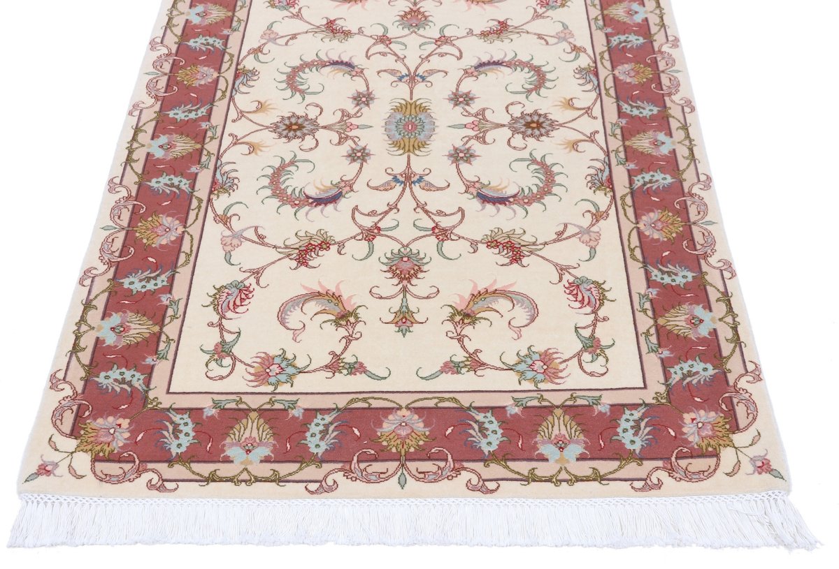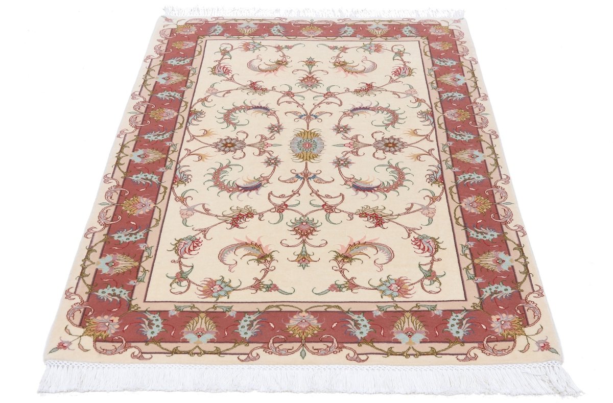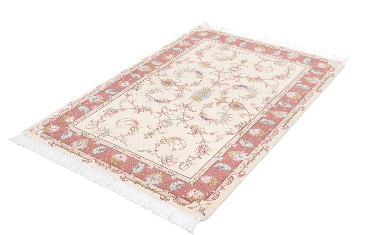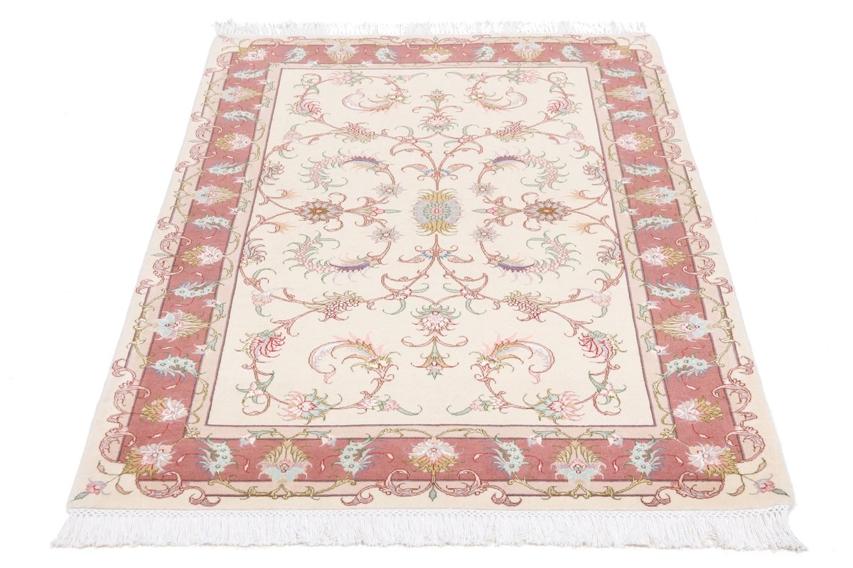 Für die besondere Eleganz des Täbriz-Flors sorgen hervorragende Materialien wie samtig anmutende Korkwolle und glänzende Seidenfäden. Die Knüpfqualität eines Täbriz-Teppichs lässt sich aus der angegebenen Raj-Zahl erschließen – je höher diese ausfällt, umso feiner ist die Knüpfdichte, die eine Million und mehr Knoten pro Quadratmeter erreichen kann. Bei besonders feingeknüpften Qualitäten kommt für die Kette statt des üblichen Baumwollgarns sogar Seide zum Einsatz.