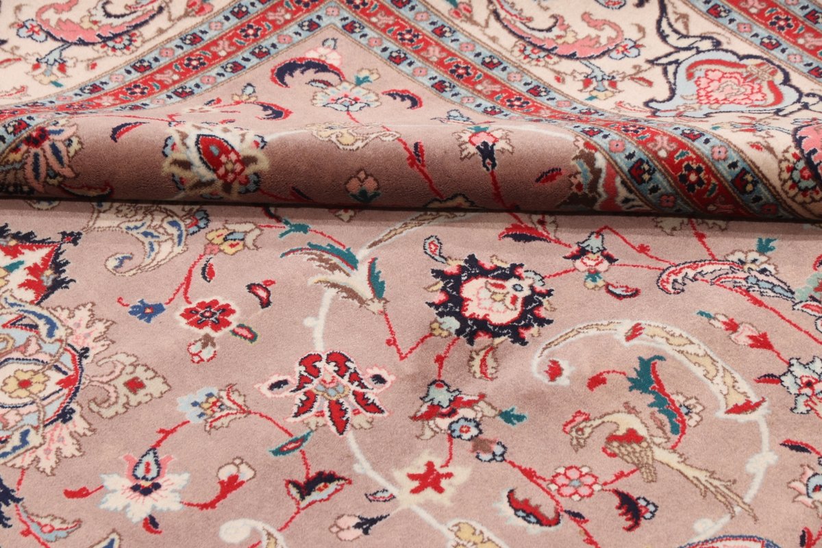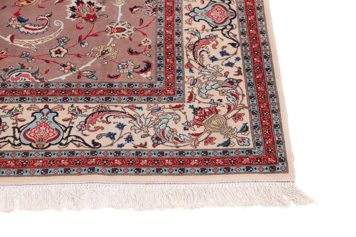 Für die besondere Eleganz des Täbriz-Flors sorgen hervorragende Materialien wie samtig anmutende Korkwolle und glänzende Seidenfäden. Die Knüpfqualität eines Täbriz-Teppichs lässt sich aus der angegebenen Raj-Zahl erschließen – je höher diese ausfällt, umso feiner ist die Knüpfdichte, die eine Million und mehr Knoten pro Quadratmeter erreichen kann. Bei besonders feingeknüpften Qualitäten kommt für die Kette statt des üblichen Baumwollgarns sogar Seide zum Einsatz.
