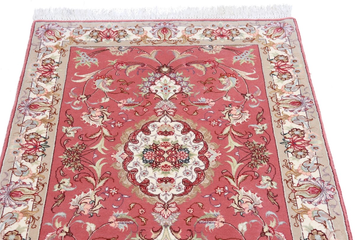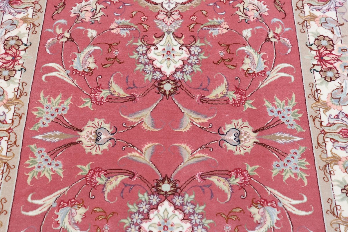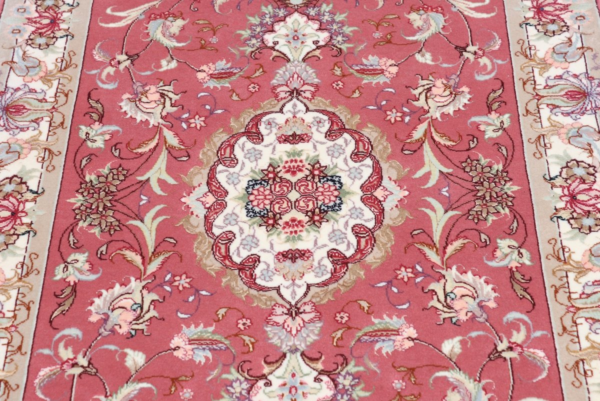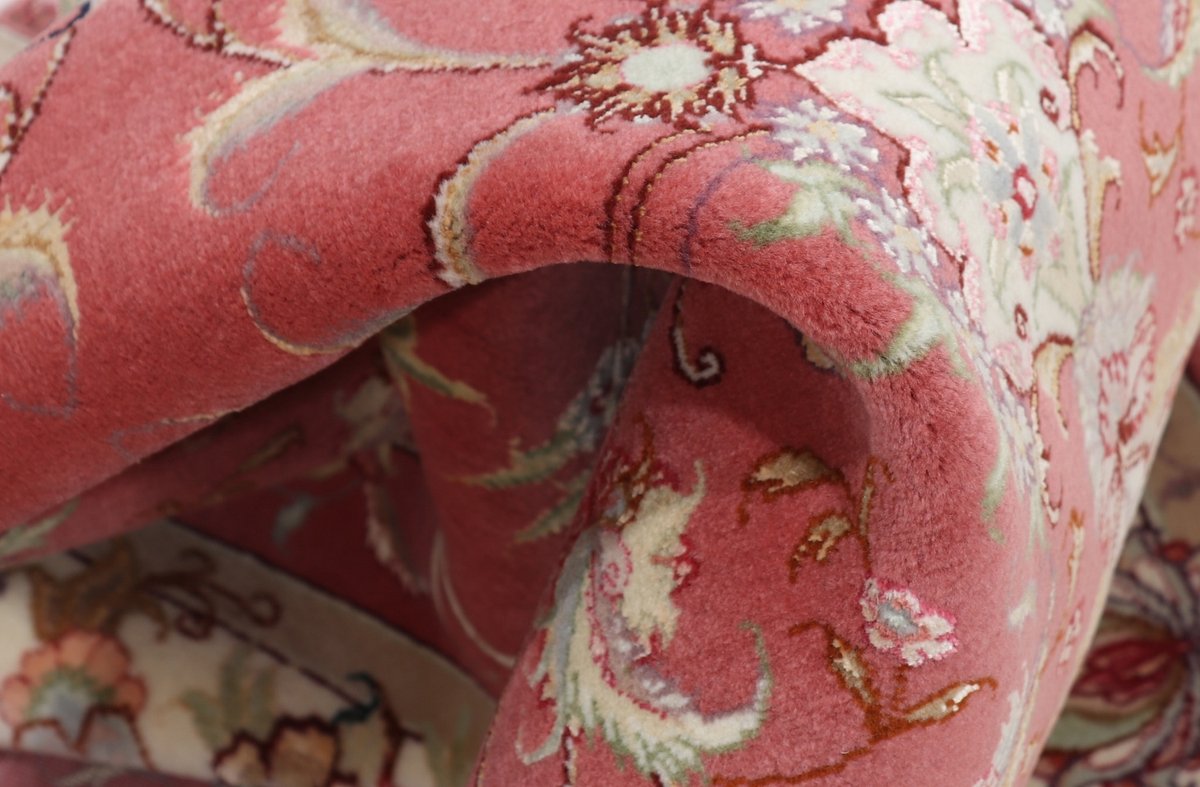 Für die besondere Eleganz des Täbriz-Flors sorgen hervorragende Materialien wie samtig anmutende Korkwolle und glänzende Seidenfäden. Die Knüpfqualität eines Täbriz-Teppichs lässt sich aus der angegebenen Raj-Zahl erschließen – je höher diese ausfällt, umso feiner ist die Knüpfdichte, die eine Million und mehr Knoten pro Quadratmeter erreichen kann. Bei besonders feingeknüpften Qualitäten kommt für die Kette statt des üblichen Baumwollgarns sogar Seide zum Einsatz.