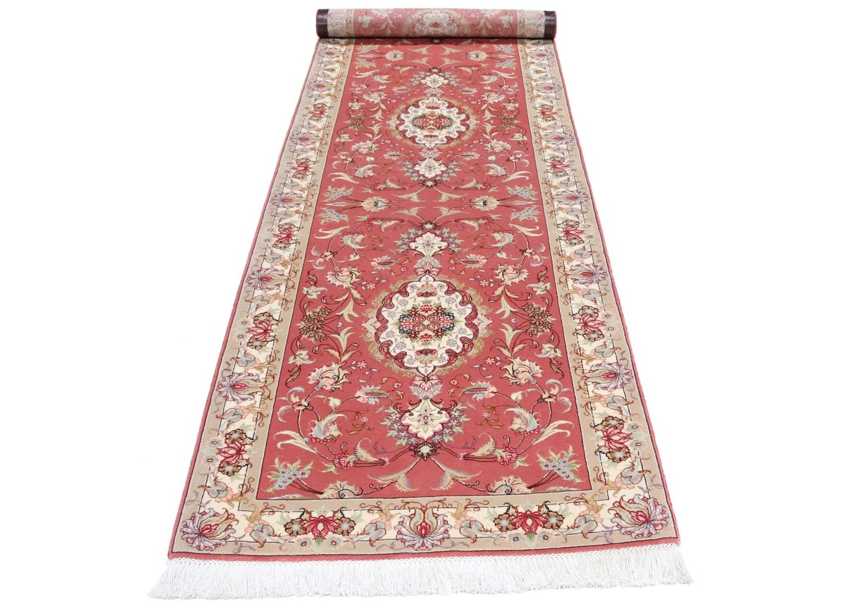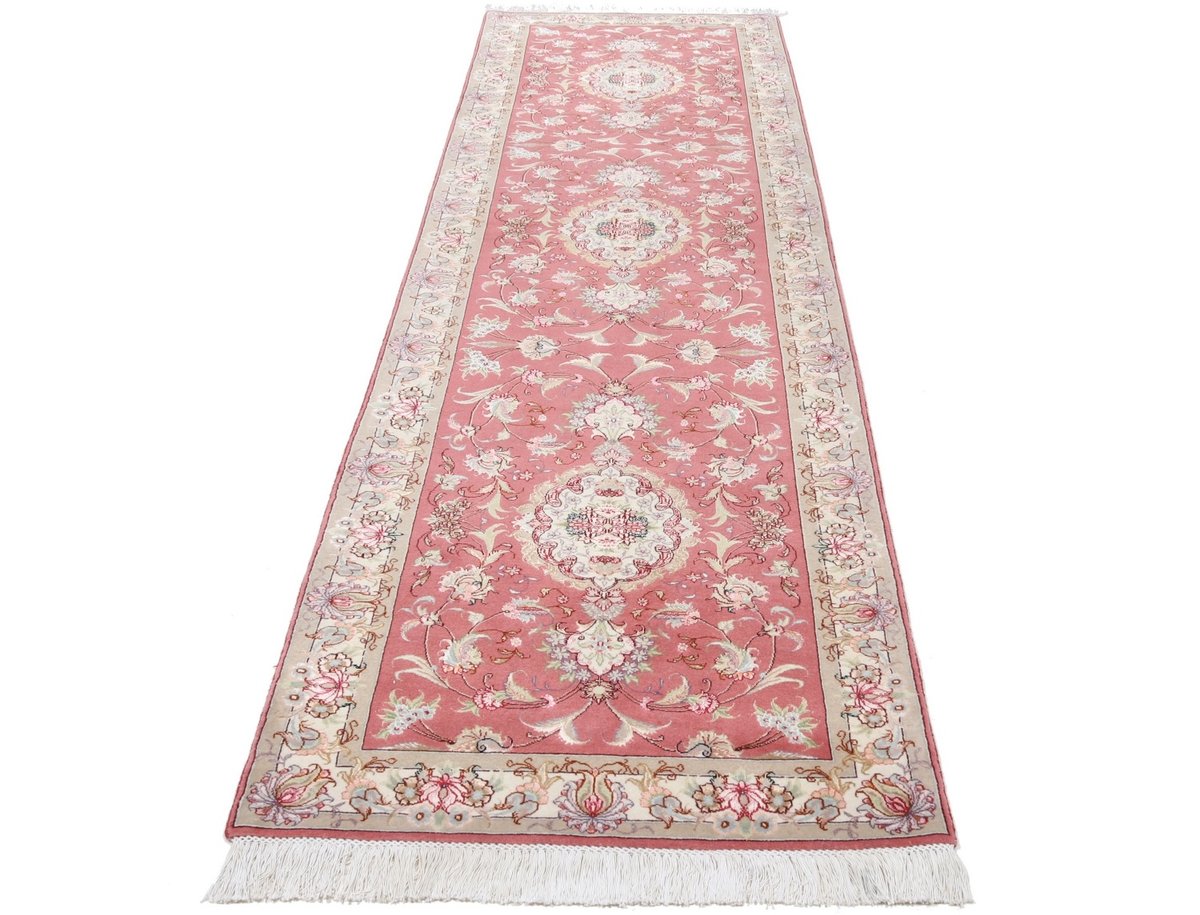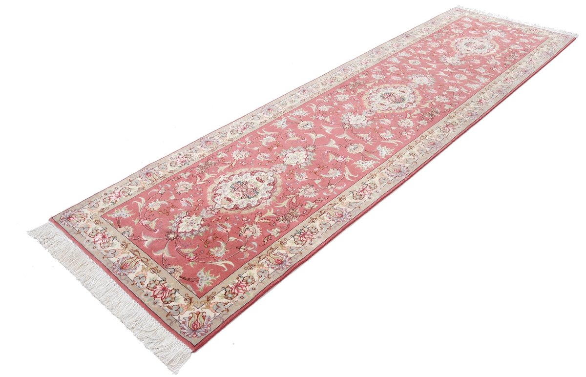 Für die besondere Eleganz des Täbriz-Flors sorgen hervorragende Materialien wie samtig anmutende Korkwolle und glänzende Seidenfäden. Die Knüpfqualität eines Täbriz-Teppichs lässt sich aus der angegebenen Raj-Zahl erschließen – je höher diese ausfällt, umso feiner ist die Knüpfdichte, die eine Million und mehr Knoten pro Quadratmeter erreichen kann. Bei besonders feingeknüpften Qualitäten kommt für die Kette statt des üblichen Baumwollgarns sogar Seide zum Einsatz.