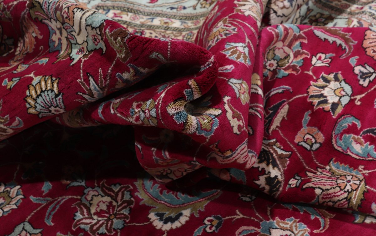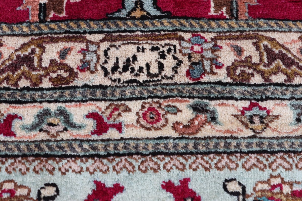 Für die besondere Eleganz des Täbriz-Flors sorgen hervorragende Materialien wie samtig anmutende Korkwolle und glänzende Seidenfäden. Die Knüpfqualität eines Täbriz-Teppichs lässt sich aus der angegebenen Raj-Zahl erschließen – je höher diese ausfällt, umso feiner ist die Knüpfdichte, die eine Million und mehr Knoten pro Quadratmeter erreichen kann. Bei besonders feingeknüpften Qualitäten kommt für die Kette statt des üblichen Baumwollgarns sogar Seide zum Einsatz.