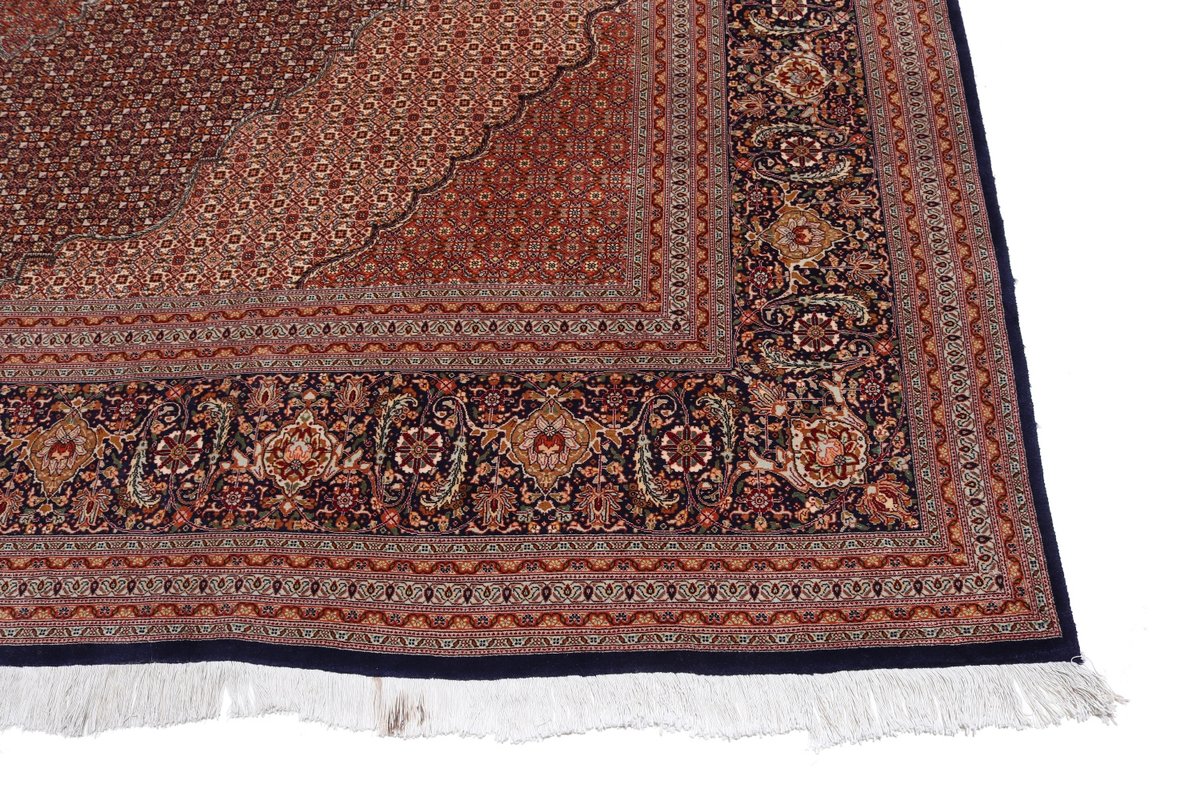 Für die besondere Eleganz des Täbriz-Flors sorgen hervorragende Materialien wie samtig anmutende Korkwolle und glänzende Seidenfäden. Die Knüpfqualität eines Täbriz-Teppichs lässt sich aus der angegebenen Raj-Zahl erschließen – je höher diese ausfällt, umso feiner ist die Knüpfdichte, die eine Million und mehr Knoten pro Quadratmeter erreichen kann. Bei besonders feingeknüpften Qualitäten kommt für die Kette statt des üblichen Baumwollgarns sogar Seide zum Einsatz.