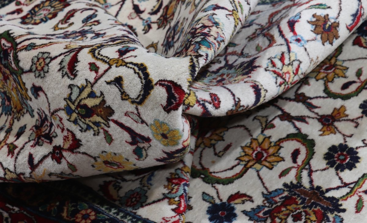 Für die besondere Eleganz des Täbriz-Flors sorgen hervorragende Materialien wie samtig anmutende Korkwolle und glänzende Seidenfäden. Die Knüpfqualität eines Täbriz-Teppichs lässt sich aus der angegebenen Raj-Zahl erschließen – je höher diese ausfällt, umso feiner ist die Knüpfdichte, die eine Million und mehr Knoten pro Quadratmeter erreichen kann. Bei besonders feingeknüpften Qualitäten kommt für die Kette statt des üblichen Baumwollgarns sogar Seide zum Einsatz.