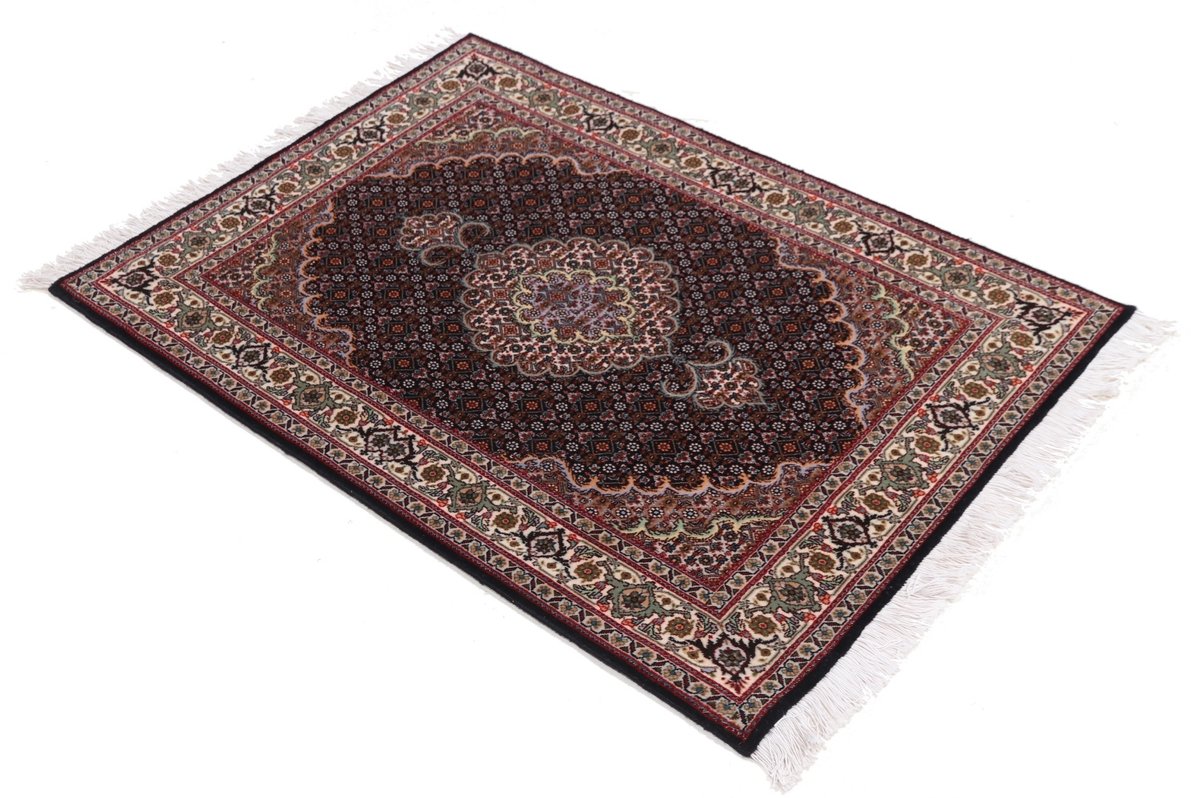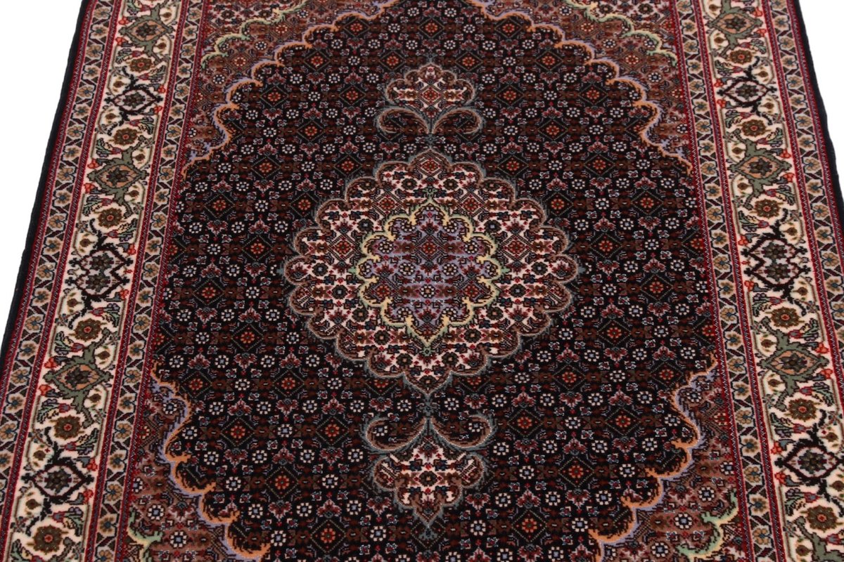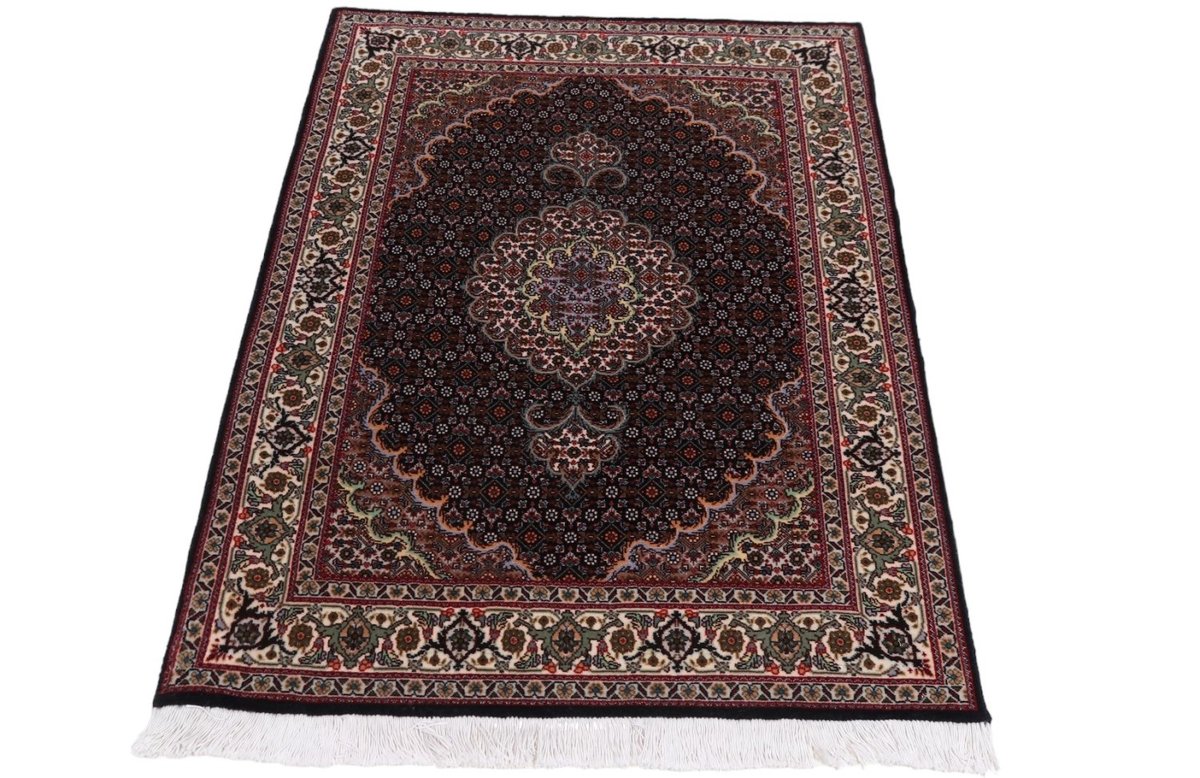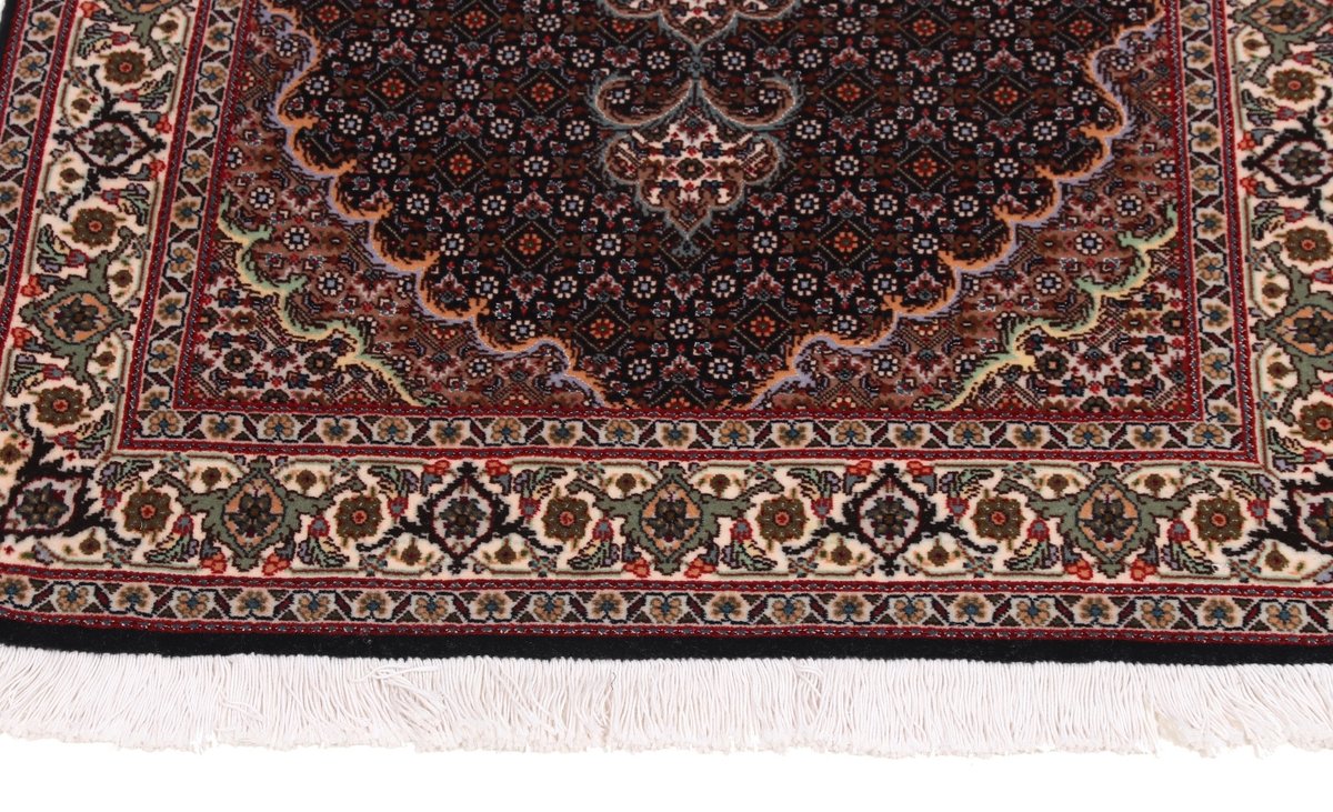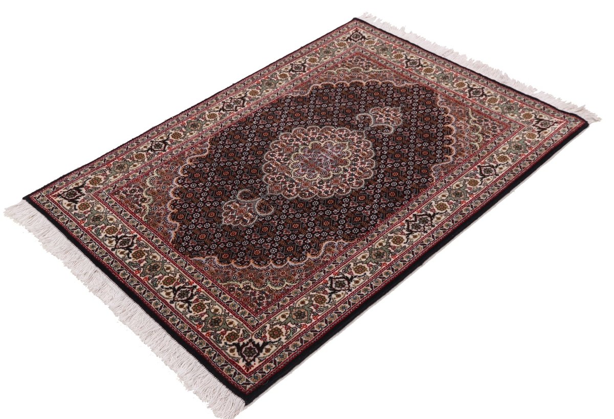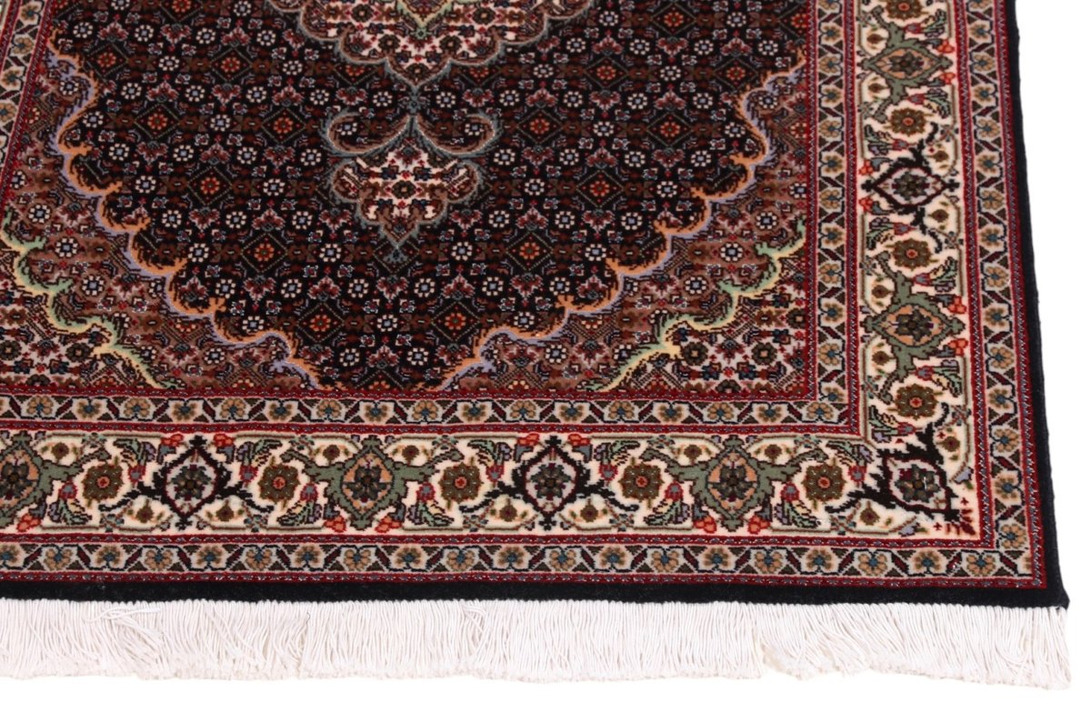 Für die besondere Eleganz des Täbriz-Flors sorgen hervorragende Materialien wie samtig anmutende Korkwolle und glänzende Seidenfäden. Die Knüpfqualität eines Täbriz-Teppichs lässt sich aus der angegebenen Raj-Zahl erschließen – je höher diese ausfällt, umso feiner ist die Knüpfdichte, die eine Million und mehr Knoten pro Quadratmeter erreichen kann. Bei besonders feingeknüpften Qualitäten kommt für die Kette statt des üblichen Baumwollgarns sogar Seide zum Einsatz.