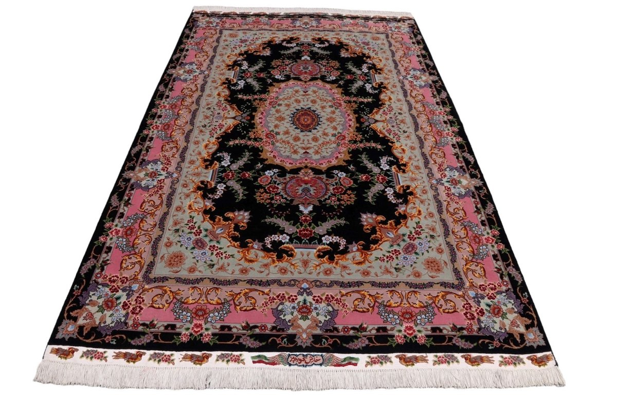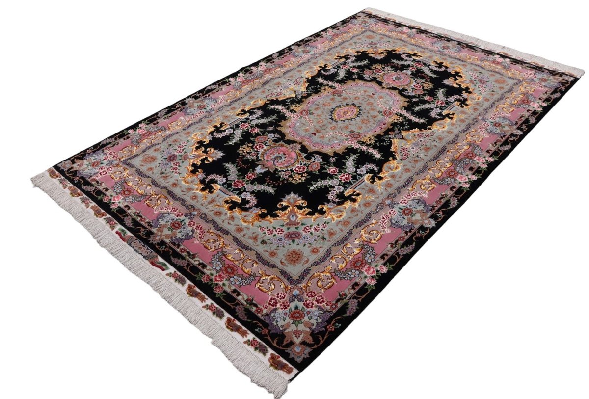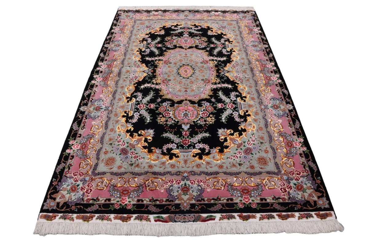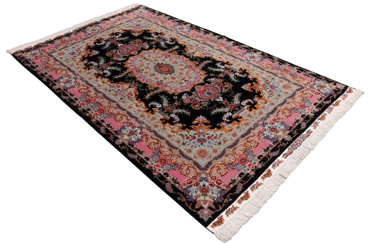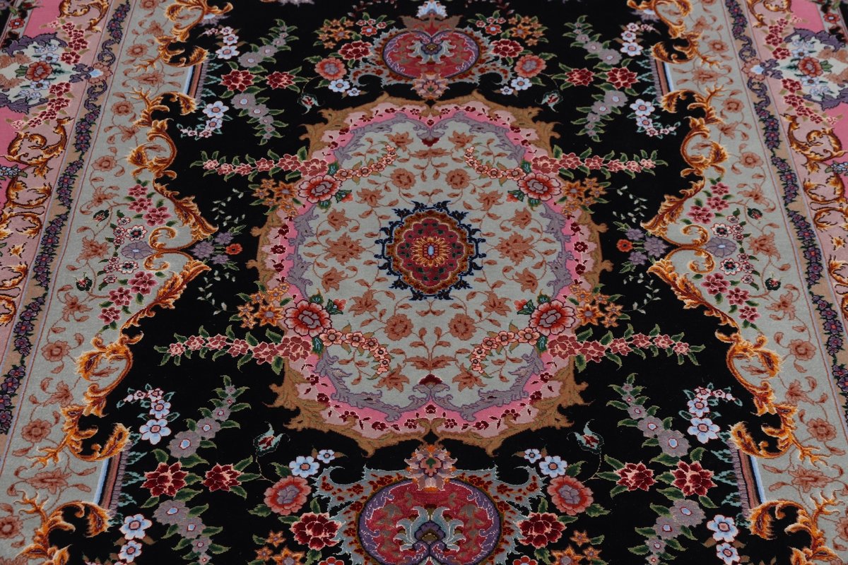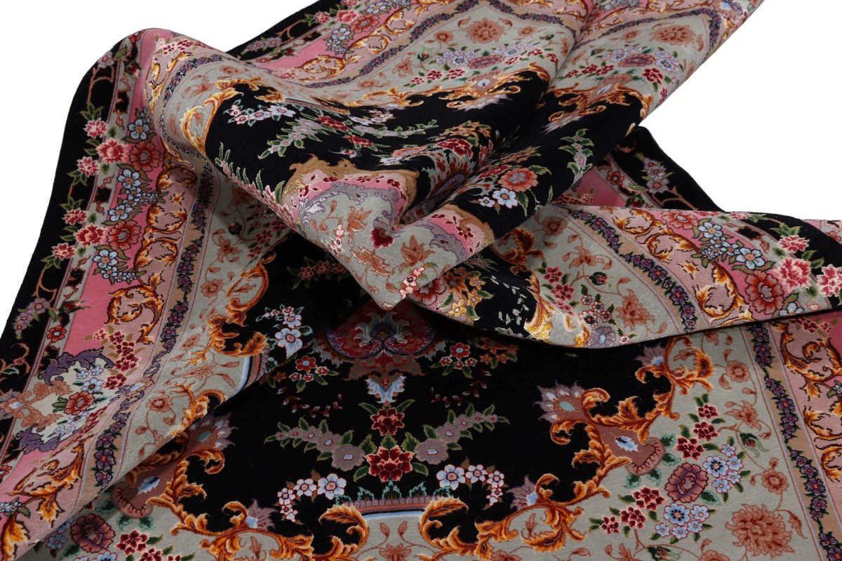 Für die besondere Eleganz des Täbriz-Flors sorgen hervorragende Materialien wie samtig anmutende Korkwolle und glänzende Seidenfäden. Die Knüpfqualität eines Täbriz-Teppichs lässt sich aus der angegebenen Raj-Zahl erschließen – je höher diese ausfällt, umso feiner ist die Knüpfdichte, die eine Million und mehr Knoten pro Quadratmeter erreichen kann. Bei besonders feingeknüpften Qualitäten kommt für die Kette statt des üblichen Baumwollgarns sogar Seide zum Einsatz.