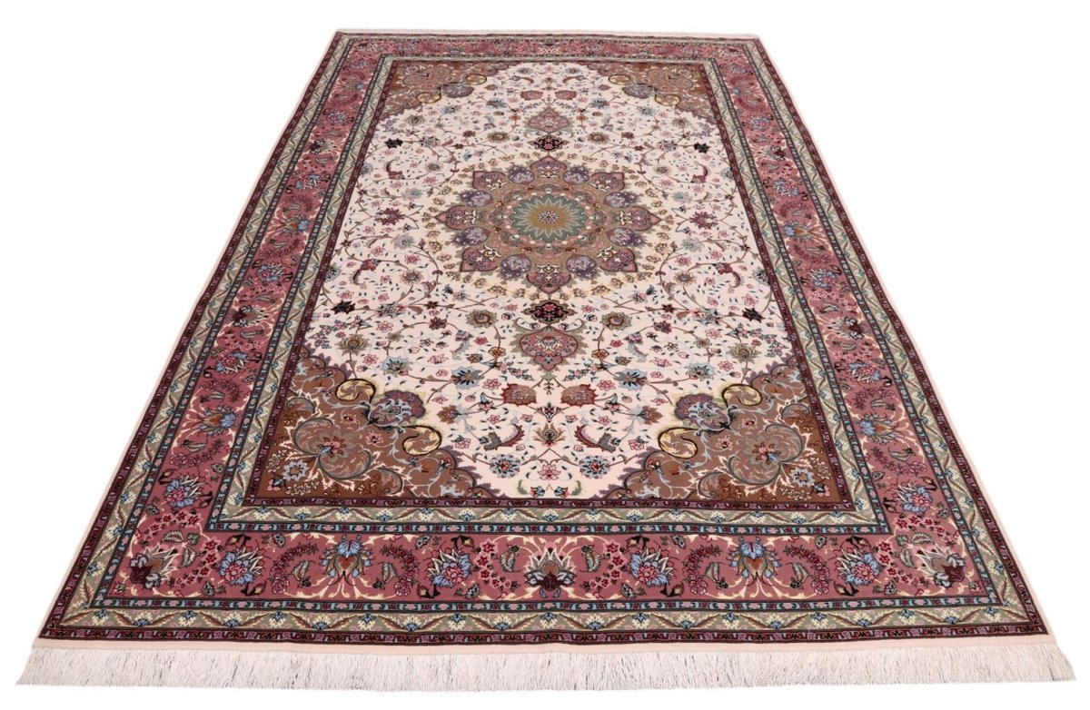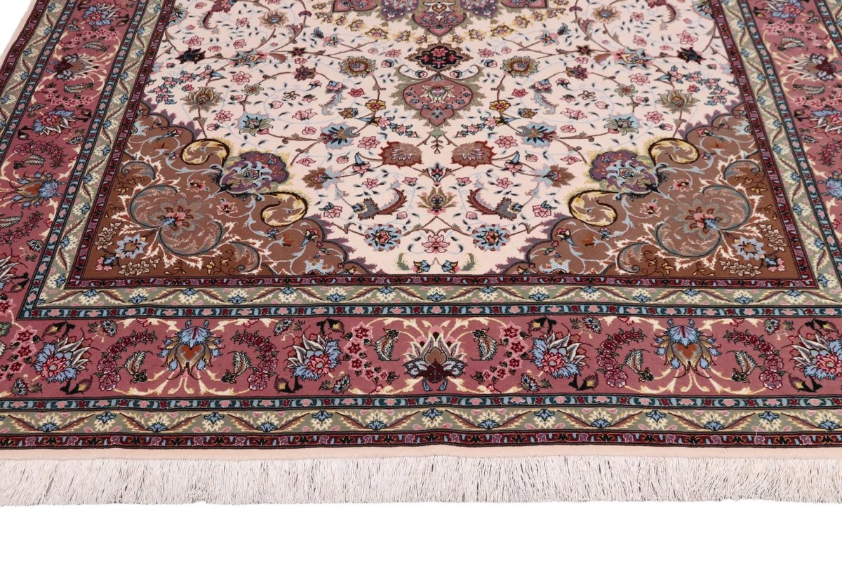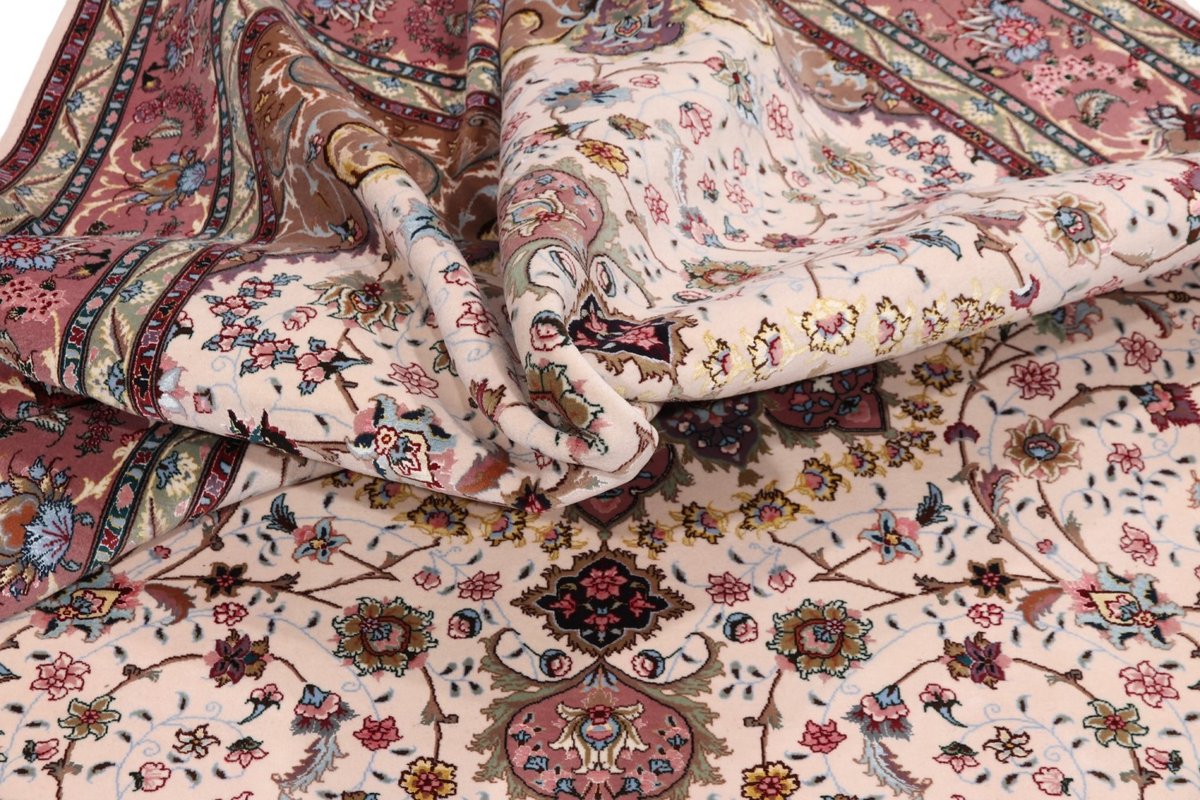 Für die besondere Eleganz des Täbriz-Flors sorgen hervorragende Materialien wie samtig anmutende Korkwolle und glänzende Seidenfäden. Die Knüpfqualität eines Täbriz-Teppichs lässt sich aus der angegebenen Raj-Zahl erschließen – je höher diese ausfällt, umso feiner ist die Knüpfdichte, die eine Million und mehr Knoten pro Quadratmeter erreichen kann. Bei besonders feingeknüpften Qualitäten kommt für die Kette statt des üblichen Baumwollgarns sogar Seide zum Einsatz.