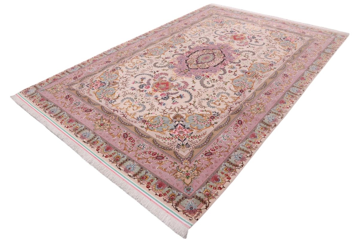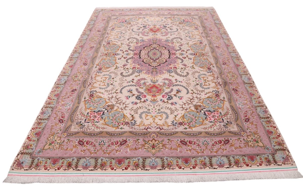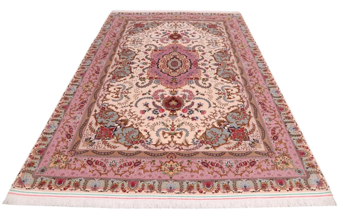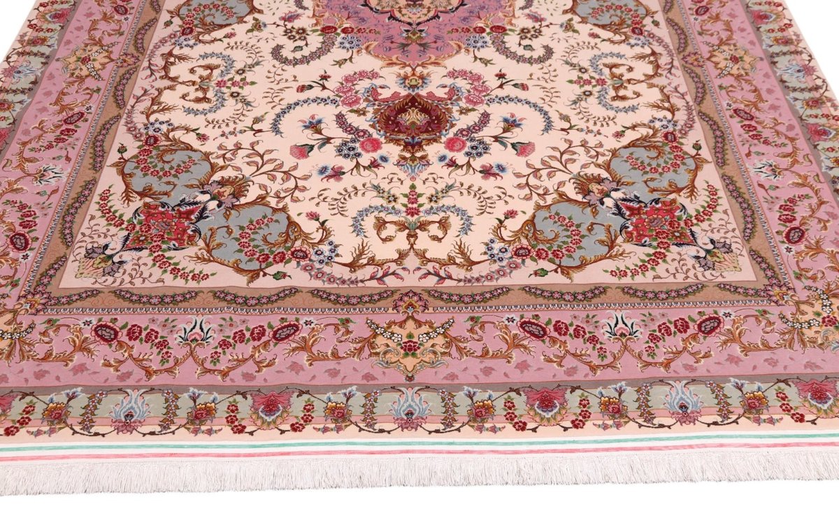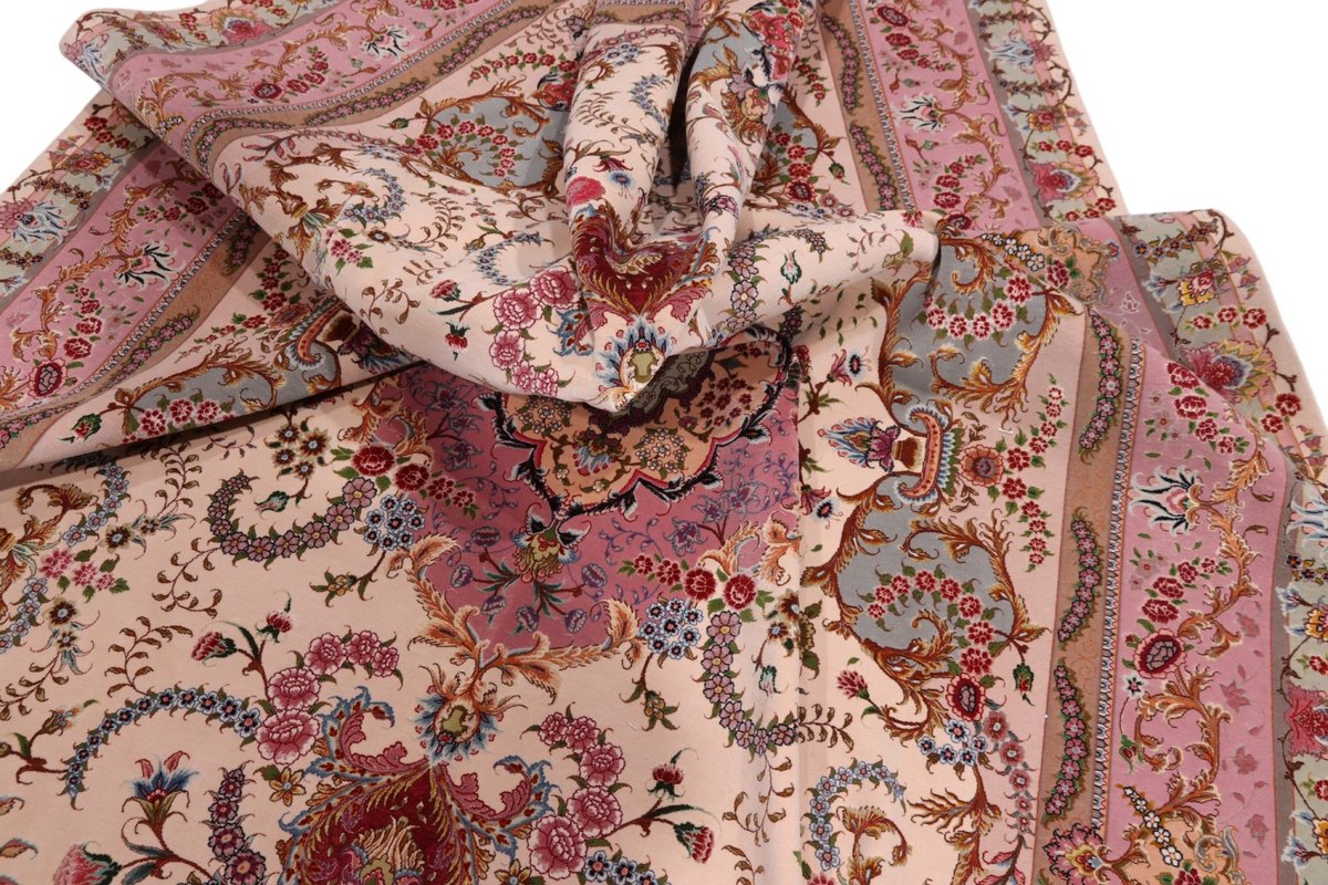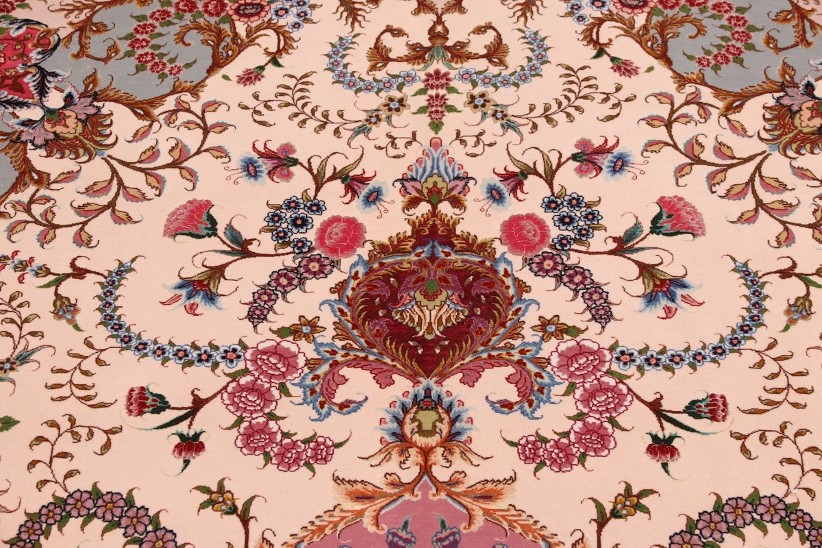 Für die besondere Eleganz des Täbriz-Flors sorgen hervorragende Materialien wie samtig anmutende Korkwolle und glänzende Seidenfäden. Die Knüpfqualität eines Täbriz-Teppichs lässt sich aus der angegebenen Raj-Zahl erschließen – je höher diese ausfällt, umso feiner ist die Knüpfdichte, die eine Million und mehr Knoten pro Quadratmeter erreichen kann. Bei besonders feingeknüpften Qualitäten kommt für die Kette statt des üblichen Baumwollgarns sogar Seide zum Einsatz.