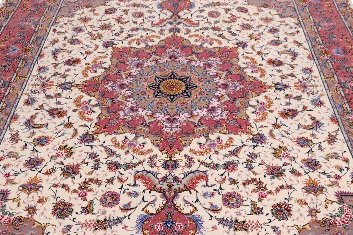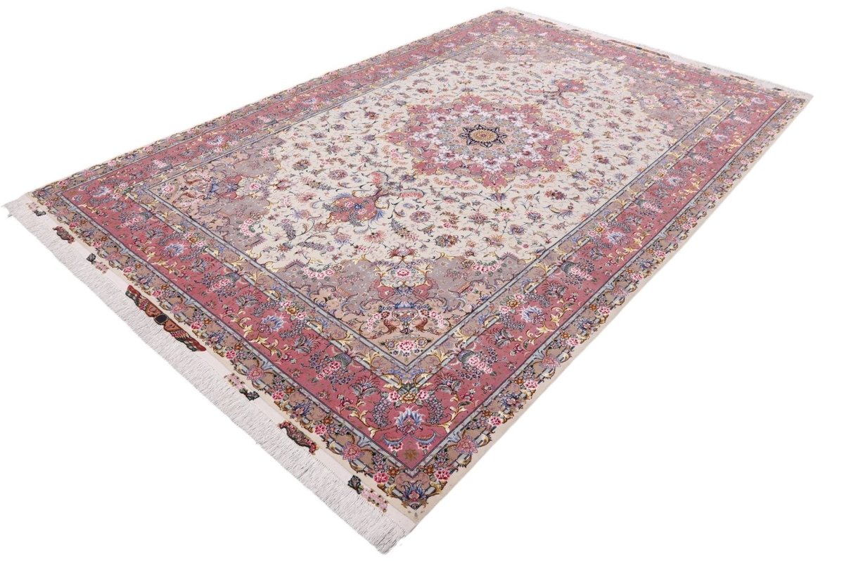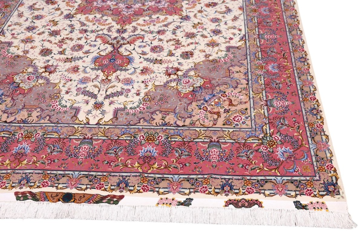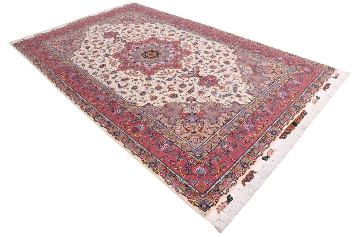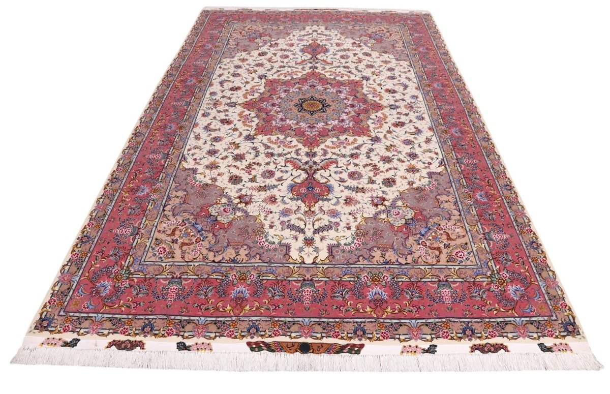 Für die besondere Eleganz des Täbriz-Flors sorgen hervorragende Materialien wie samtig anmutende Korkwolle und glänzende Seidenfäden. Die Knüpfqualität eines Täbriz-Teppichs lässt sich aus der angegebenen Raj-Zahl erschließen – je höher diese ausfällt, umso feiner ist die Knüpfdichte, die eine Million und mehr Knoten pro Quadratmeter erreichen kann. Bei besonders feingeknüpften Qualitäten kommt für die Kette statt des üblichen Baumwollgarns sogar Seide zum Einsatz.