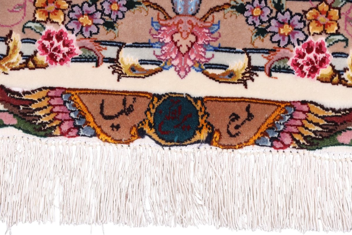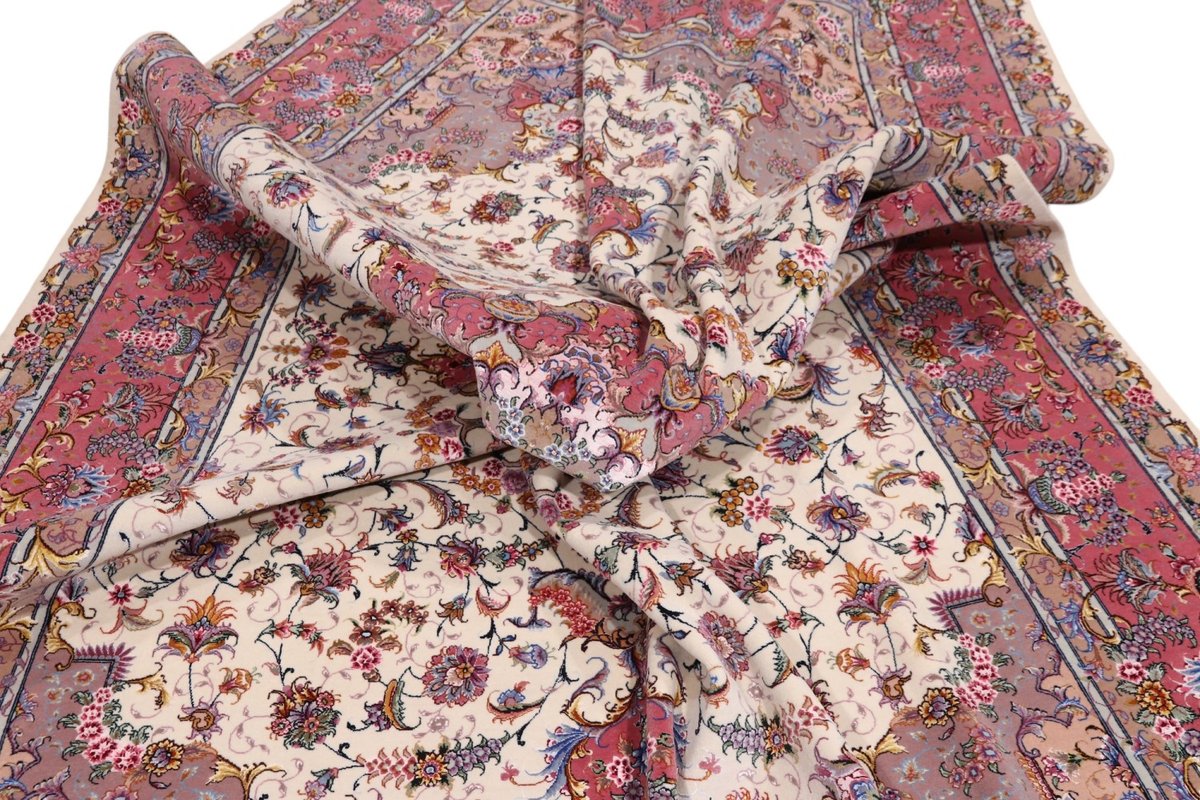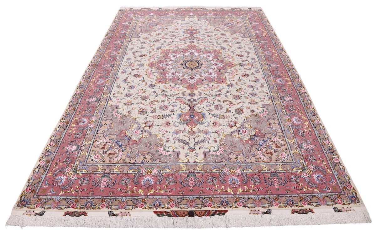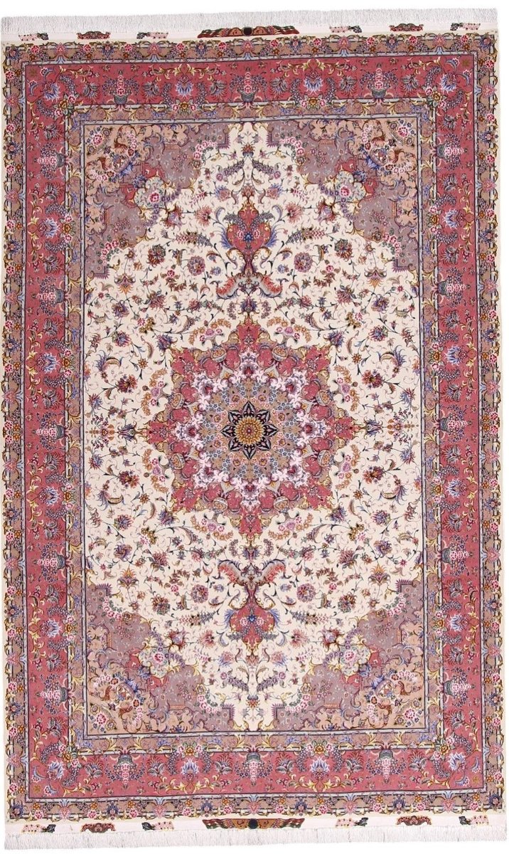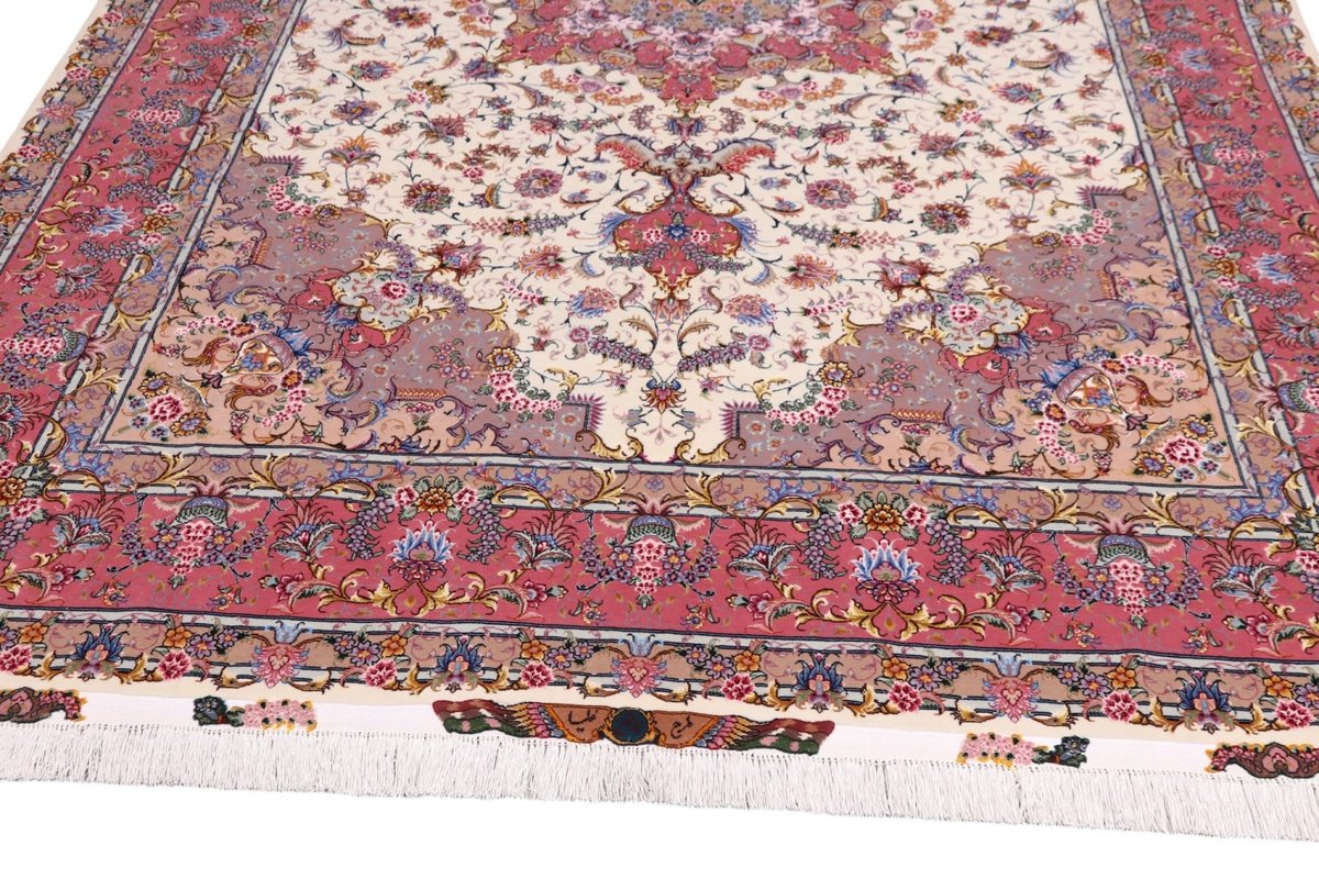 Für die besondere Eleganz des Täbriz-Flors sorgen hervorragende Materialien wie samtig anmutende Korkwolle und glänzende Seidenfäden. Die Knüpfqualität eines Täbriz-Teppichs lässt sich aus der angegebenen Raj-Zahl erschließen – je höher diese ausfällt, umso feiner ist die Knüpfdichte, die eine Million und mehr Knoten pro Quadratmeter erreichen kann. Bei besonders feingeknüpften Qualitäten kommt für die Kette statt des üblichen Baumwollgarns sogar Seide zum Einsatz.