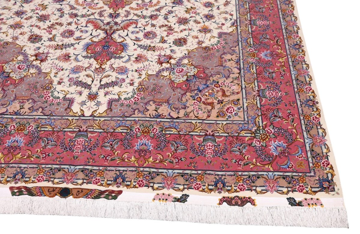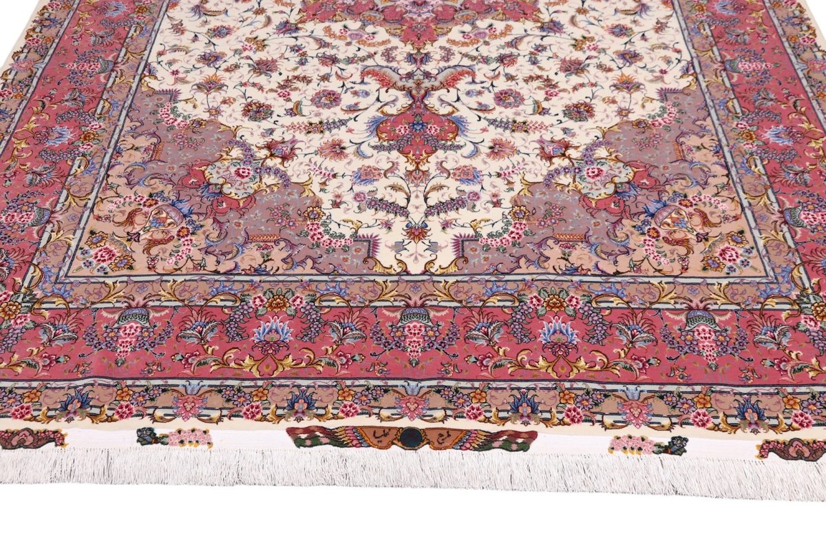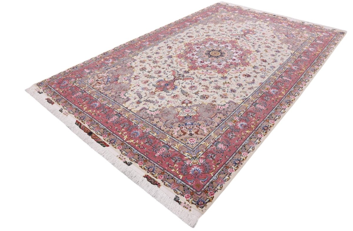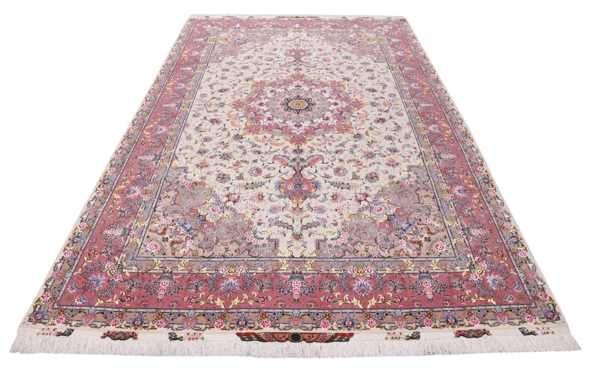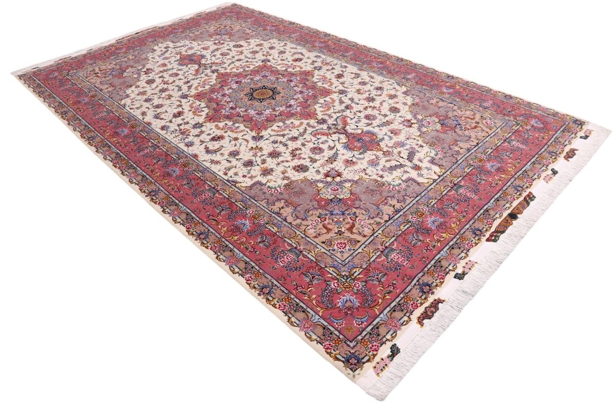 Für die besondere Eleganz des Täbriz-Flors sorgen hervorragende Materialien wie samtig anmutende Korkwolle und glänzende Seidenfäden. Die Knüpfqualität eines Täbriz-Teppichs lässt sich aus der angegebenen Raj-Zahl erschließen – je höher diese ausfällt, umso feiner ist die Knüpfdichte, die eine Million und mehr Knoten pro Quadratmeter erreichen kann. Bei besonders feingeknüpften Qualitäten kommt für die Kette statt des üblichen Baumwollgarns sogar Seide zum Einsatz.