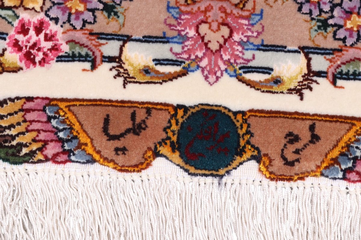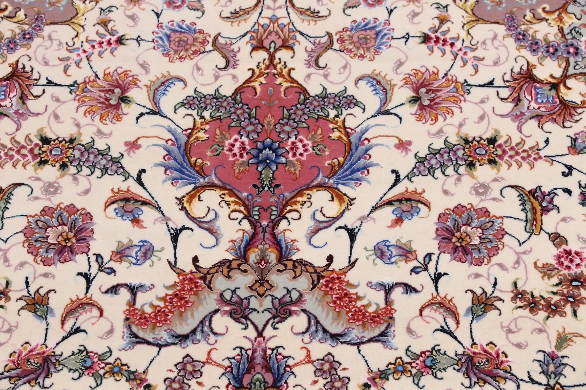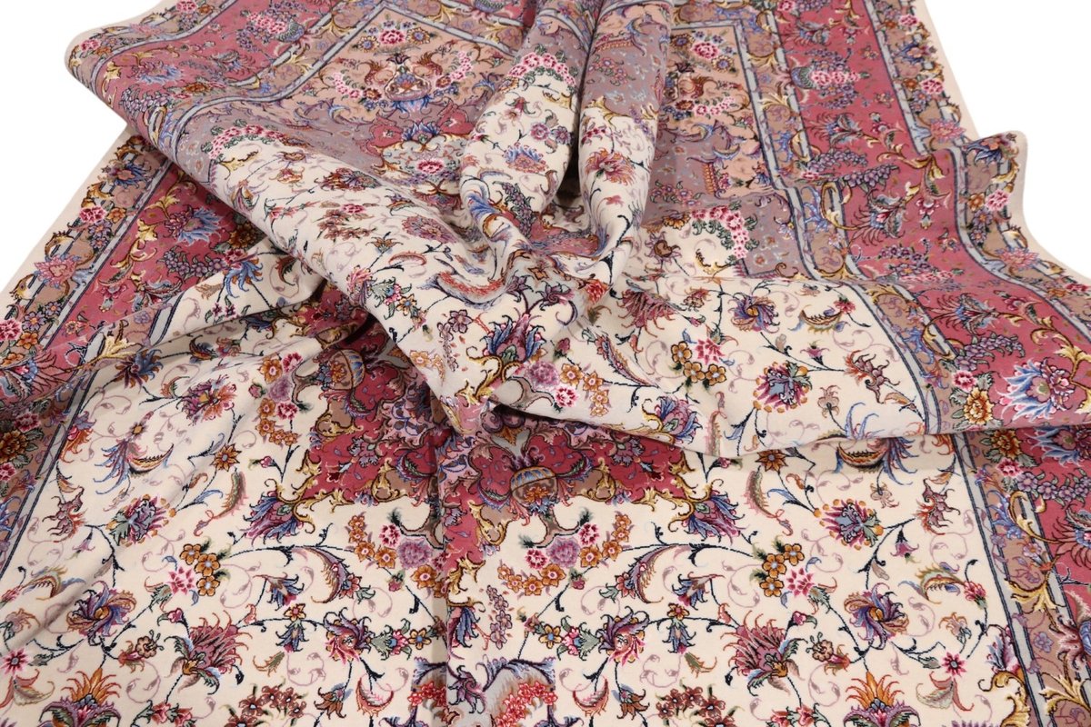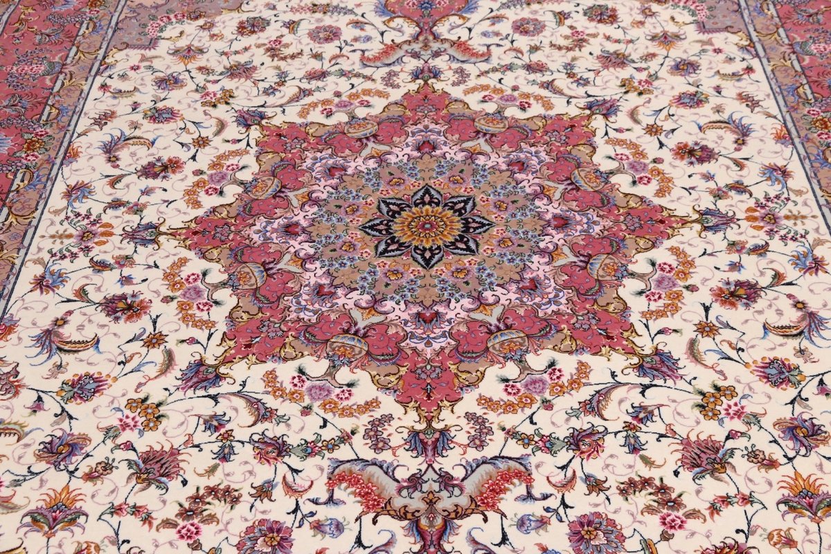 Für die besondere Eleganz des Täbriz-Flors sorgen hervorragende Materialien wie samtig anmutende Korkwolle und glänzende Seidenfäden. Die Knüpfqualität eines Täbriz-Teppichs lässt sich aus der angegebenen Raj-Zahl erschließen – je höher diese ausfällt, umso feiner ist die Knüpfdichte, die eine Million und mehr Knoten pro Quadratmeter erreichen kann. Bei besonders feingeknüpften Qualitäten kommt für die Kette statt des üblichen Baumwollgarns sogar Seide zum Einsatz.