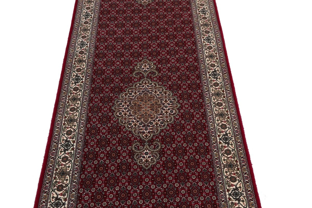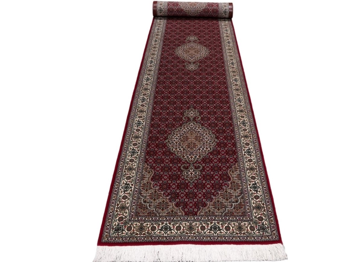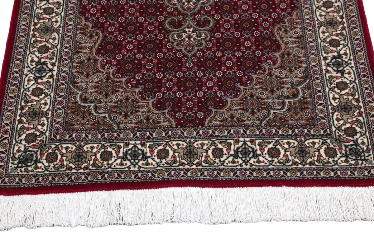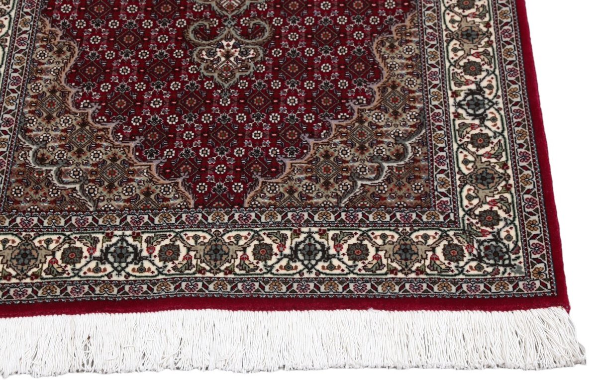 Für die besondere Eleganz des Täbriz-Flors sorgen hervorragende Materialien wie samtig anmutende Korkwolle und glänzende Seidenfäden. Die Knüpfqualität eines Täbriz-Teppichs lässt sich aus der angegebenen Raj-Zahl erschließen – je höher diese ausfällt, umso feiner ist die Knüpfdichte, die eine Million und mehr Knoten pro Quadratmeter erreichen kann. Bei besonders feingeknüpften Qualitäten kommt für die Kette statt des üblichen Baumwollgarns sogar Seide zum Einsatz.