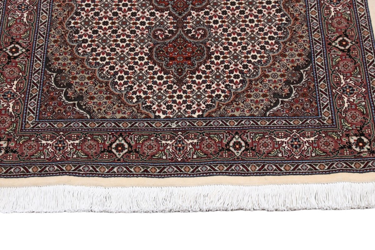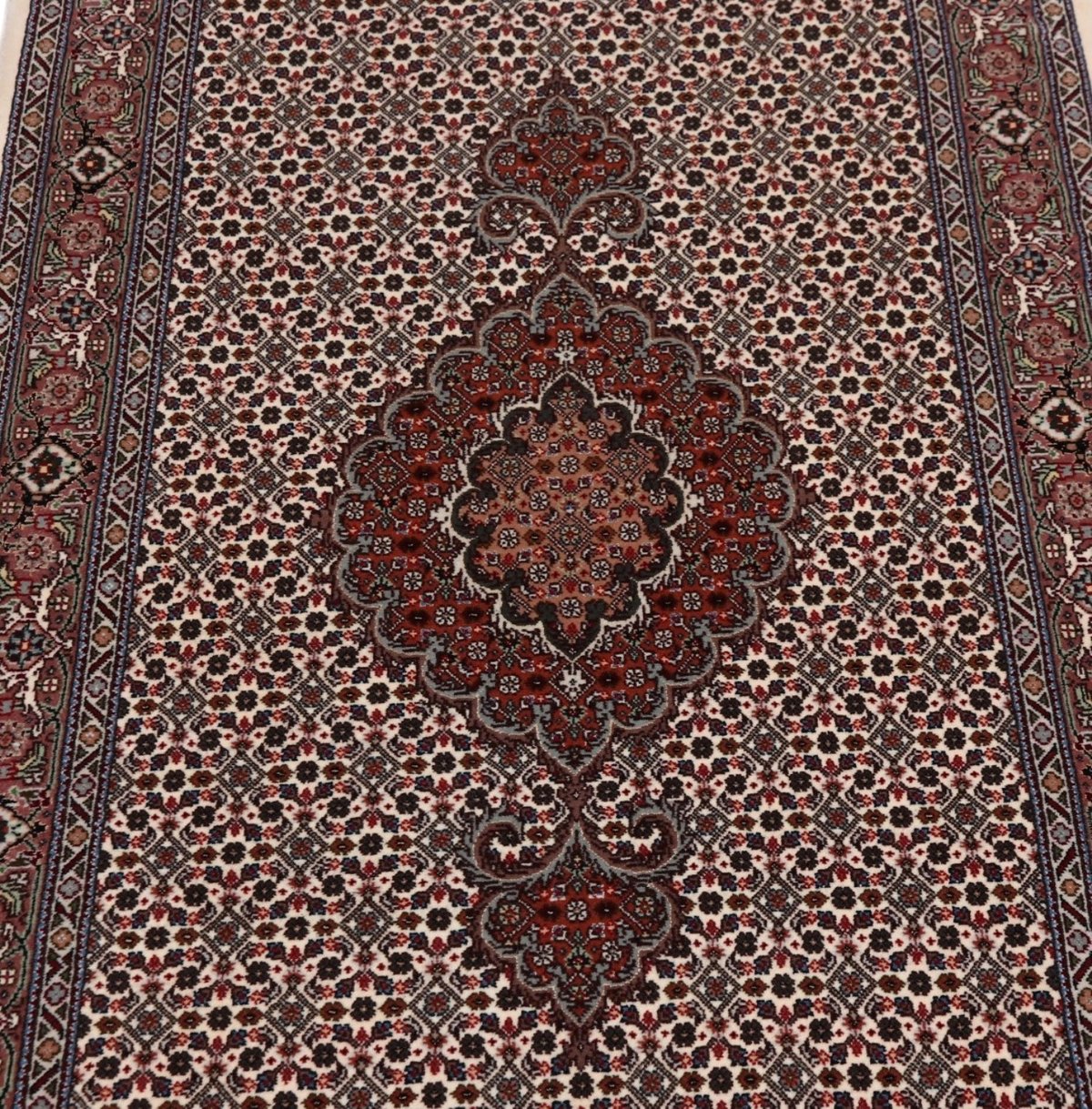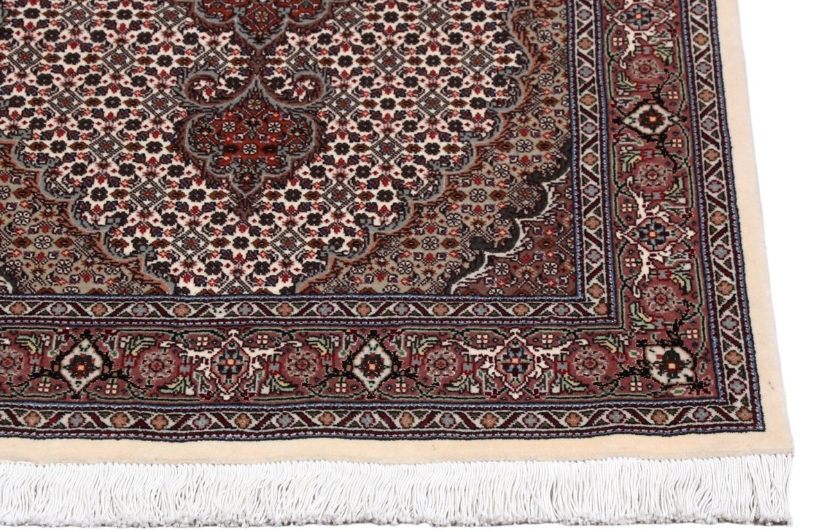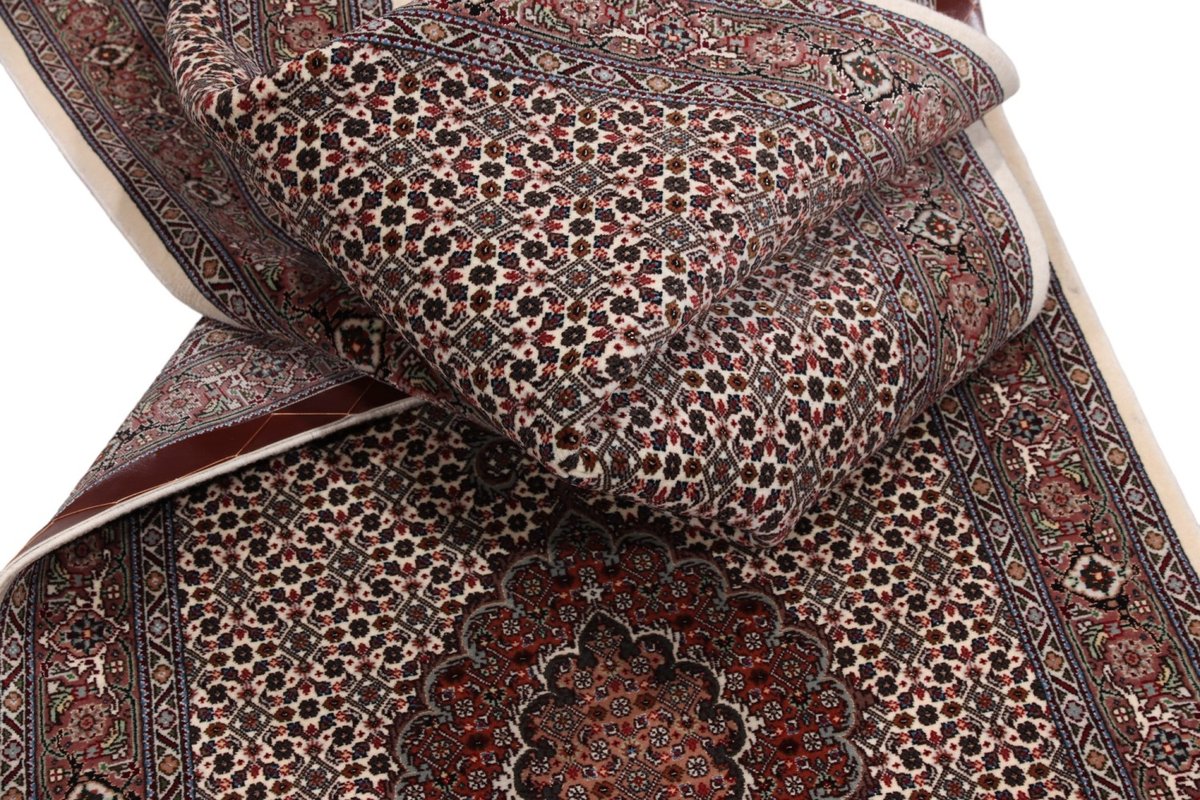 Für die besondere Eleganz des Täbriz-Flors sorgen hervorragende Materialien wie samtig anmutende Korkwolle und glänzende Seidenfäden. Die Knüpfqualität eines Täbriz-Teppichs lässt sich aus der angegebenen Raj-Zahl erschließen – je höher diese ausfällt, umso feiner ist die Knüpfdichte, die eine Million und mehr Knoten pro Quadratmeter erreichen kann. Bei besonders feingeknüpften Qualitäten kommt für die Kette statt des üblichen Baumwollgarns sogar Seide zum Einsatz.