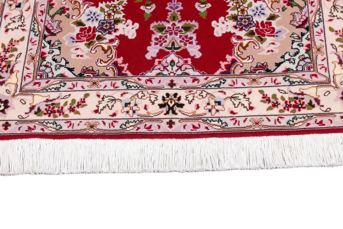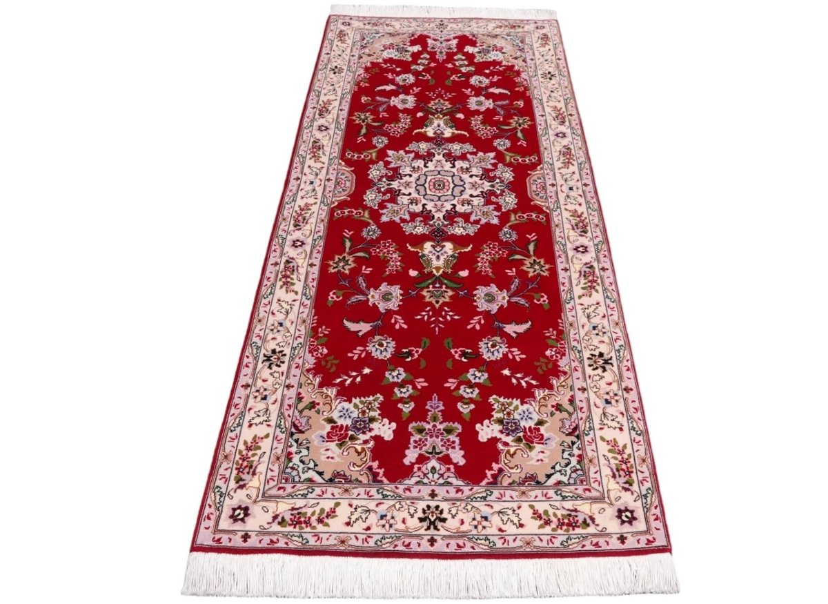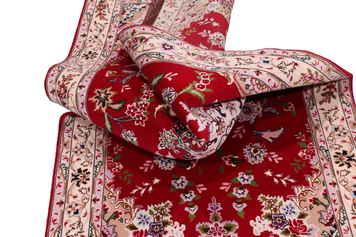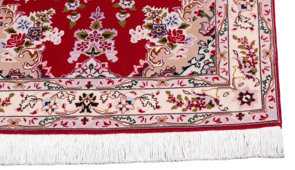 Für die besondere Eleganz des Täbriz-Flors sorgen hervorragende Materialien wie samtig anmutende Korkwolle und glänzende Seidenfäden. Die Knüpfqualität eines Täbriz-Teppichs lässt sich aus der angegebenen Raj-Zahl erschließen – je höher diese ausfällt, umso feiner ist die Knüpfdichte, die eine Million und mehr Knoten pro Quadratmeter erreichen kann. Bei besonders feingeknüpften Qualitäten kommt für die Kette statt des üblichen Baumwollgarns sogar Seide zum Einsatz.