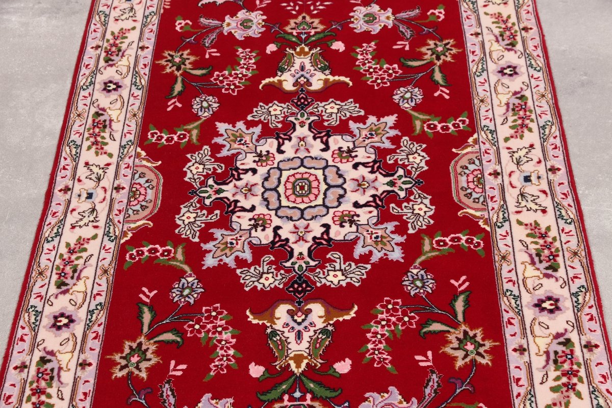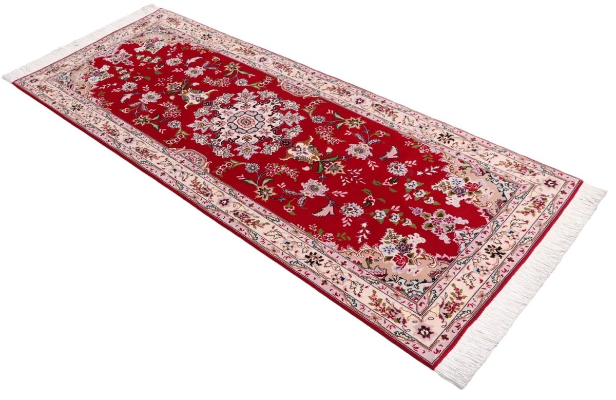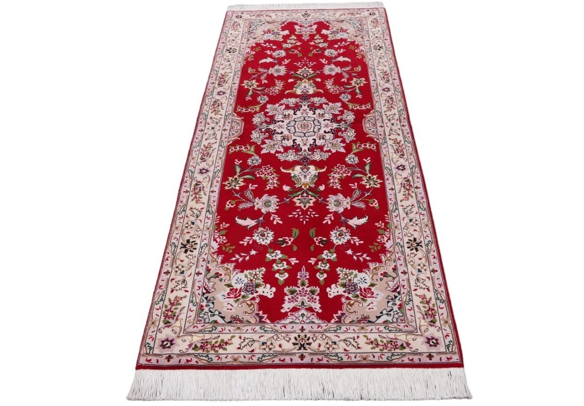 Für die besondere Eleganz des Täbriz-Flors sorgen hervorragende Materialien wie samtig anmutende Korkwolle und glänzende Seidenfäden. Die Knüpfqualität eines Täbriz-Teppichs lässt sich aus der angegebenen Raj-Zahl erschließen – je höher diese ausfällt, umso feiner ist die Knüpfdichte, die eine Million und mehr Knoten pro Quadratmeter erreichen kann. Bei besonders feingeknüpften Qualitäten kommt für die Kette statt des üblichen Baumwollgarns sogar Seide zum Einsatz.