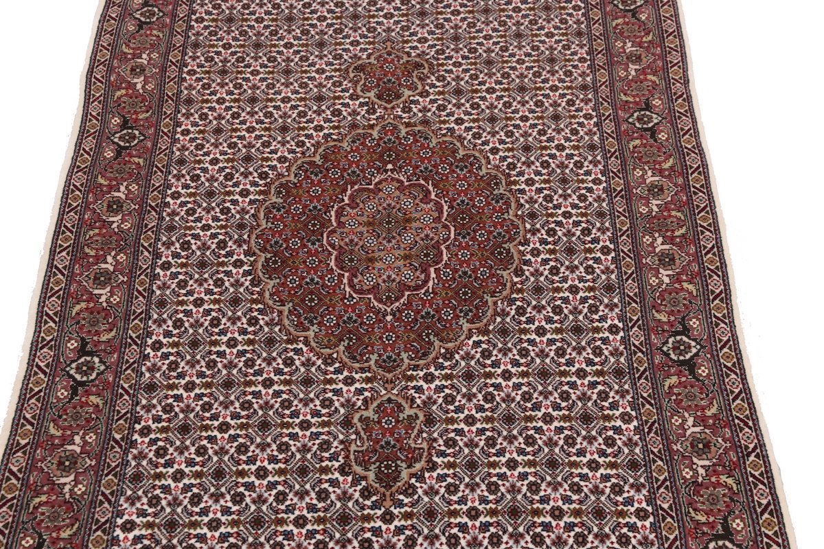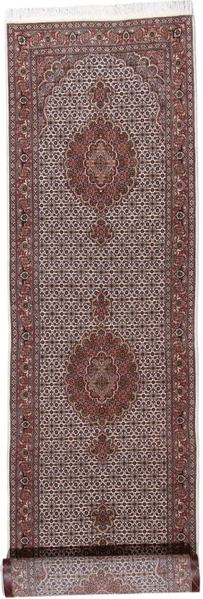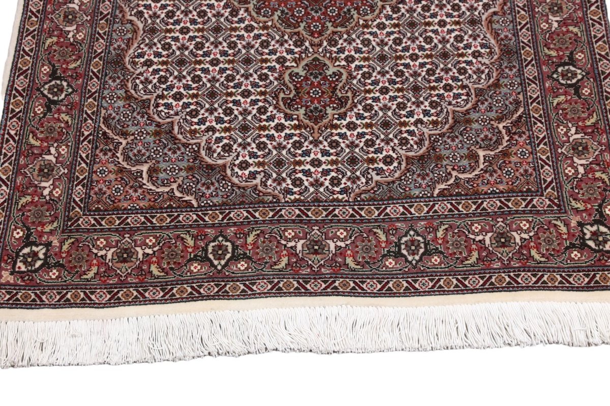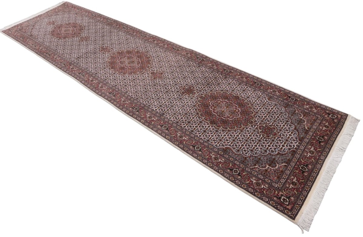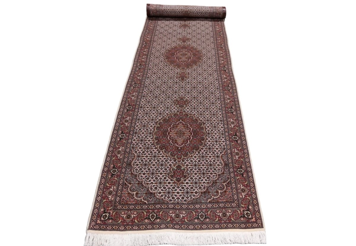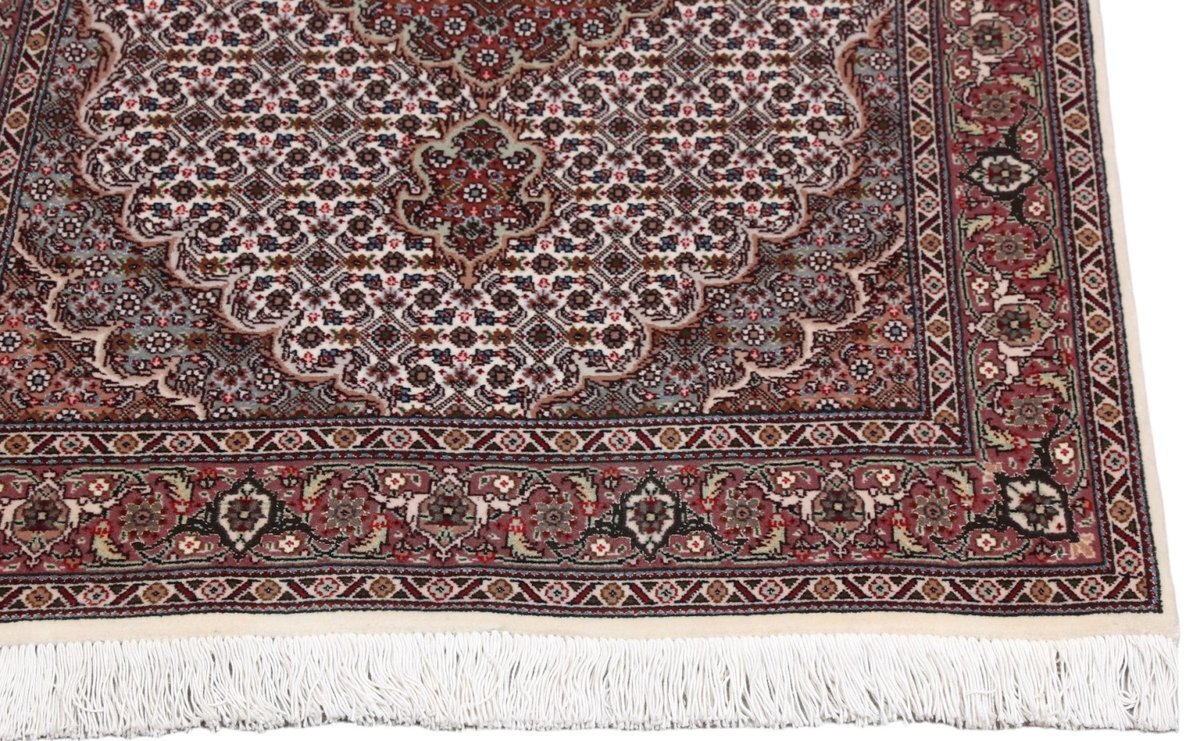 Für die besondere Eleganz des Täbriz-Flors sorgen hervorragende Materialien wie samtig anmutende Korkwolle und glänzende Seidenfäden. Die Knüpfqualität eines Täbriz-Teppichs lässt sich aus der angegebenen Raj-Zahl erschließen – je höher diese ausfällt, umso feiner ist die Knüpfdichte, die eine Million und mehr Knoten pro Quadratmeter erreichen kann. Bei besonders feingeknüpften Qualitäten kommt für die Kette statt des üblichen Baumwollgarns sogar Seide zum Einsatz.