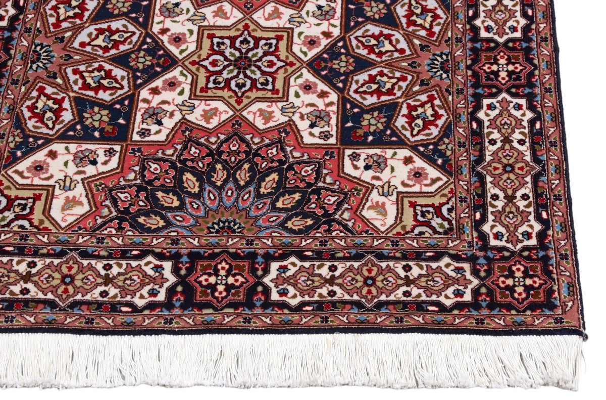 Für die besondere Eleganz des Täbriz-Flors sorgen hervorragende Materialien wie samtig anmutende Korkwolle und glänzende Seidenfäden. Die Knüpfqualität eines Täbriz-Teppichs lässt sich aus der angegebenen Raj-Zahl erschließen – je höher diese ausfällt, umso feiner ist die Knüpfdichte, die eine Million und mehr Knoten pro Quadratmeter erreichen kann. Bei besonders feingeknüpften Qualitäten kommt für die Kette statt des üblichen Baumwollgarns sogar Seide zum Einsatz.