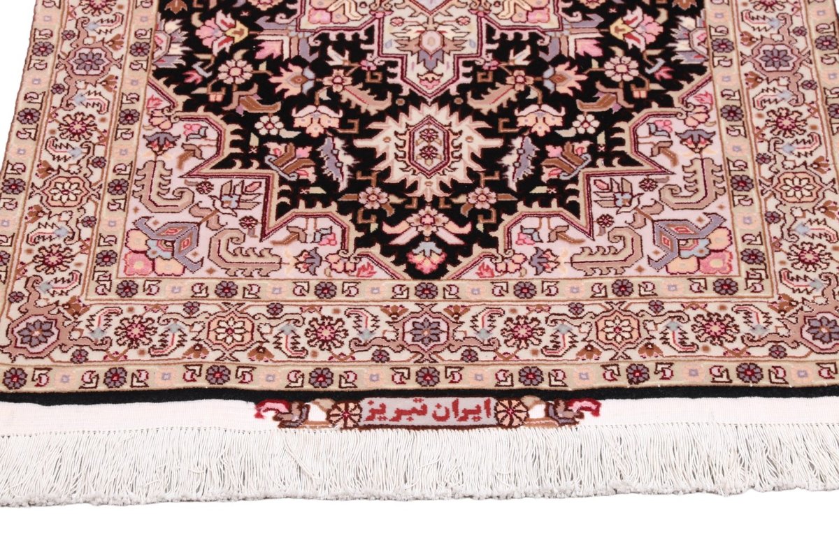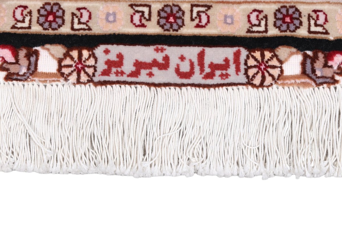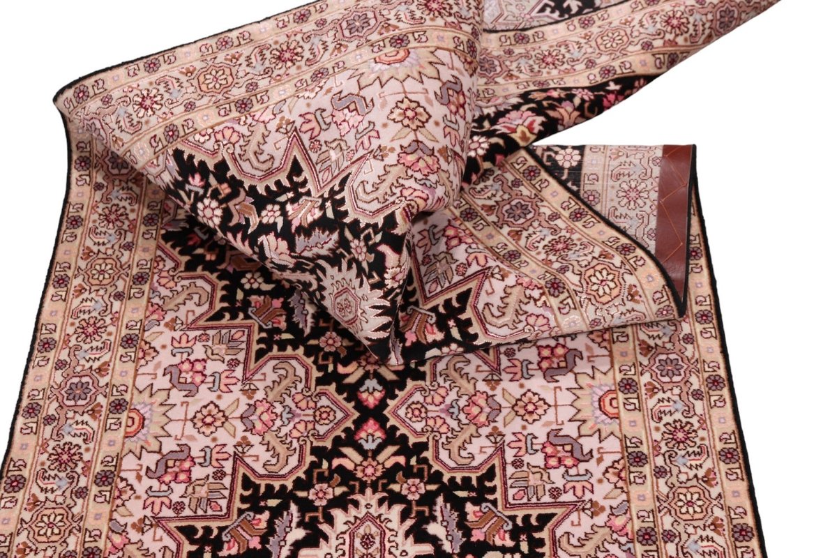 Für die besondere Eleganz des Täbriz-Flors sorgen hervorragende Materialien wie samtig anmutende Korkwolle und glänzende Seidenfäden. Die Knüpfqualität eines Täbriz-Teppichs lässt sich aus der angegebenen Raj-Zahl erschließen – je höher diese ausfällt, umso feiner ist die Knüpfdichte, die eine Million und mehr Knoten pro Quadratmeter erreichen kann. Bei besonders feingeknüpften Qualitäten kommt für die Kette statt des üblichen Baumwollgarns sogar Seide zum Einsatz.