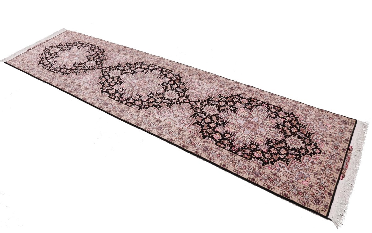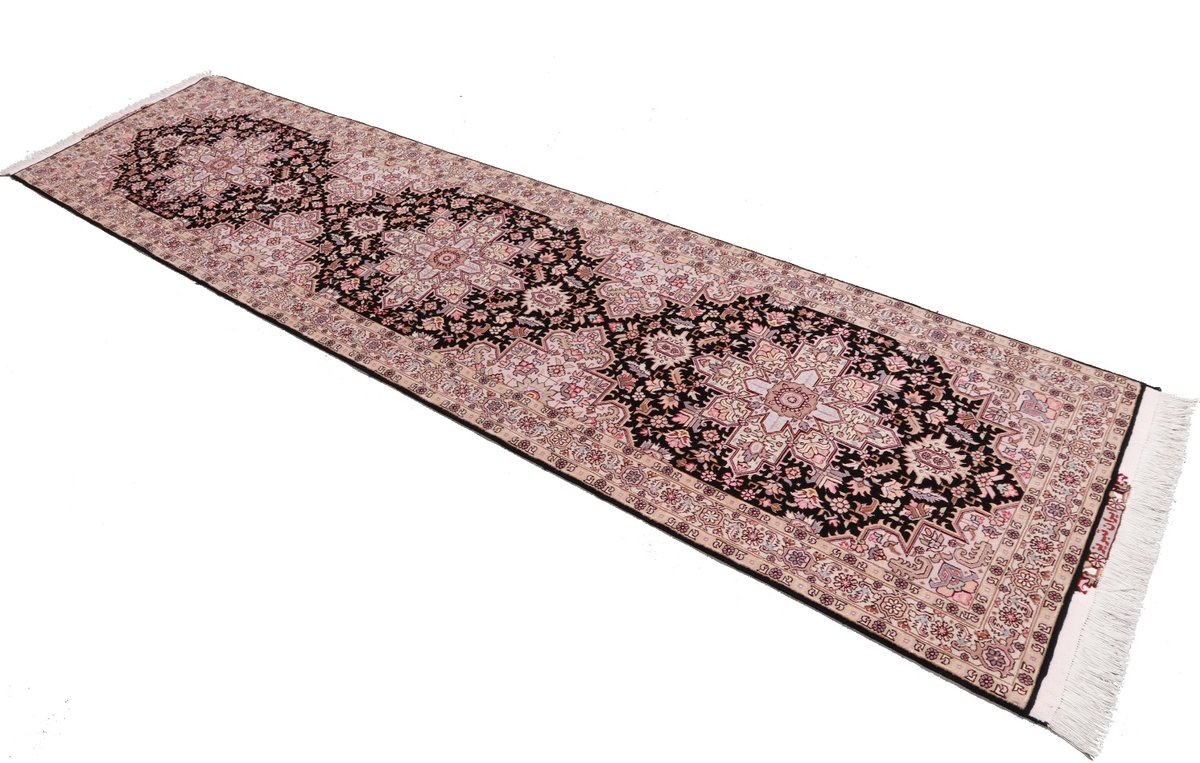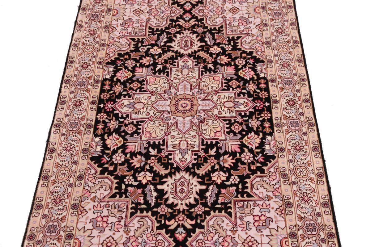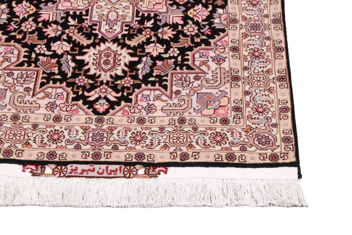 Für die besondere Eleganz des Täbriz-Flors sorgen hervorragende Materialien wie samtig anmutende Korkwolle und glänzende Seidenfäden. Die Knüpfqualität eines Täbriz-Teppichs lässt sich aus der angegebenen Raj-Zahl erschließen – je höher diese ausfällt, umso feiner ist die Knüpfdichte, die eine Million und mehr Knoten pro Quadratmeter erreichen kann. Bei besonders feingeknüpften Qualitäten kommt für die Kette statt des üblichen Baumwollgarns sogar Seide zum Einsatz.