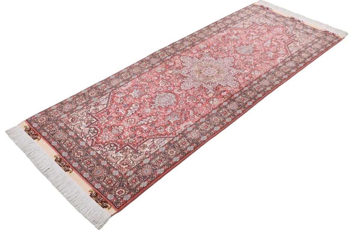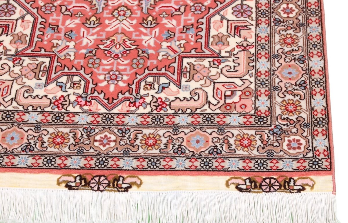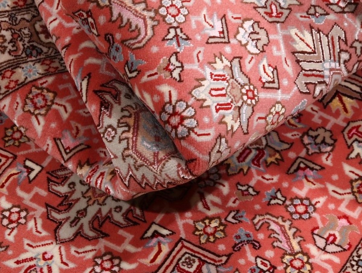 Für die besondere Eleganz des Täbriz-Flors sorgen hervorragende Materialien wie samtig anmutende Korkwolle und glänzende Seidenfäden. Die Knüpfqualität eines Täbriz-Teppichs lässt sich aus der angegebenen Raj-Zahl erschließen – je höher diese ausfällt, umso feiner ist die Knüpfdichte, die eine Million und mehr Knoten pro Quadratmeter erreichen kann. Bei besonders feingeknüpften Qualitäten kommt für die Kette statt des üblichen Baumwollgarns sogar Seide zum Einsatz.