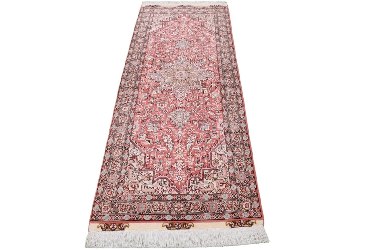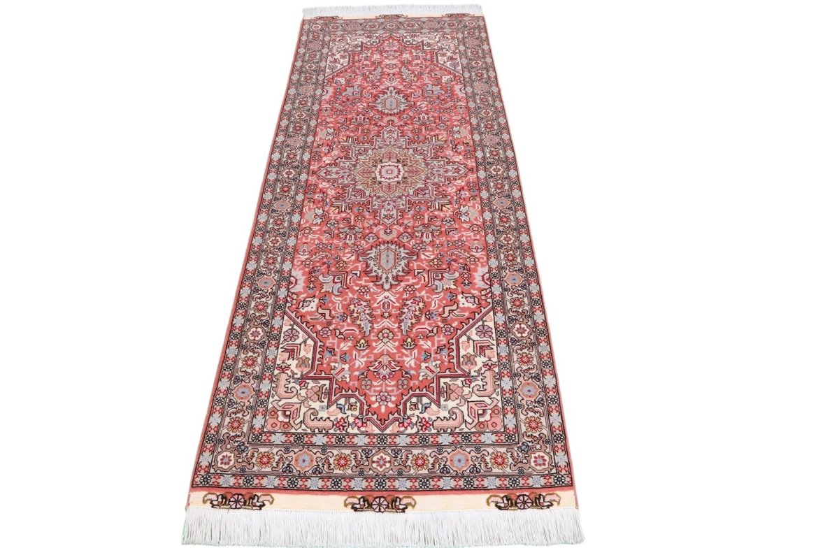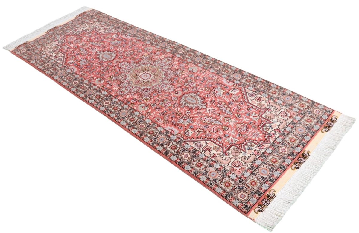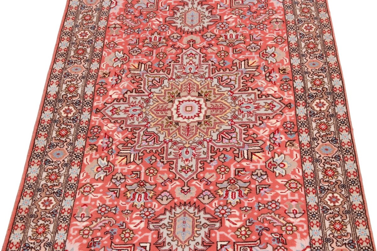 Für die besondere Eleganz des Täbriz-Flors sorgen hervorragende Materialien wie samtig anmutende Korkwolle und glänzende Seidenfäden. Die Knüpfqualität eines Täbriz-Teppichs lässt sich aus der angegebenen Raj-Zahl erschließen – je höher diese ausfällt, umso feiner ist die Knüpfdichte, die eine Million und mehr Knoten pro Quadratmeter erreichen kann. Bei besonders feingeknüpften Qualitäten kommt für die Kette statt des üblichen Baumwollgarns sogar Seide zum Einsatz.