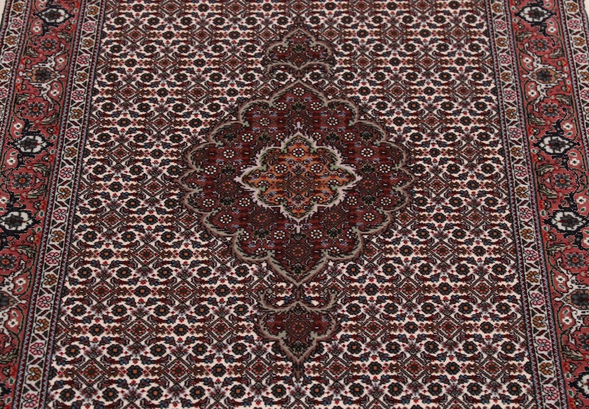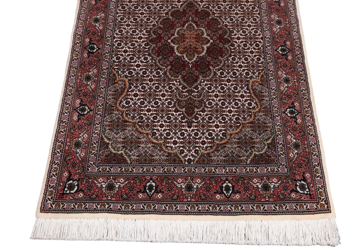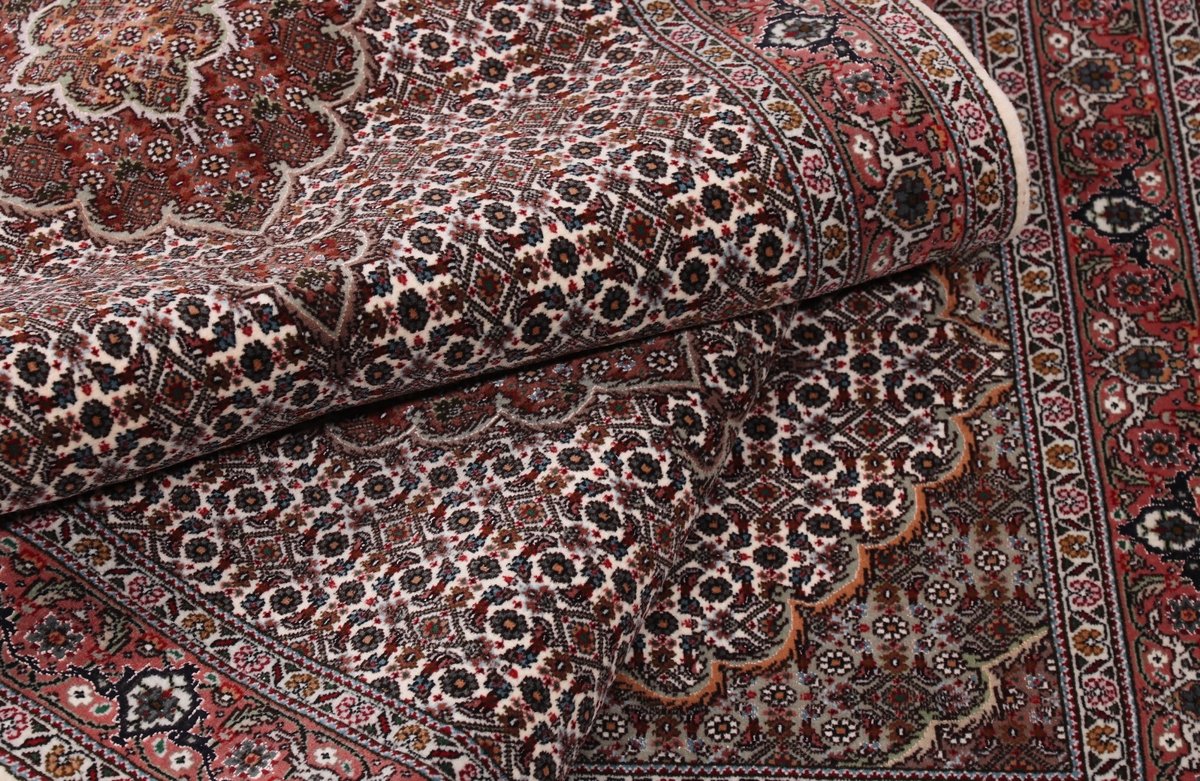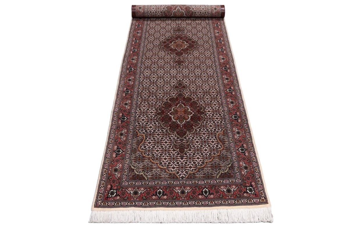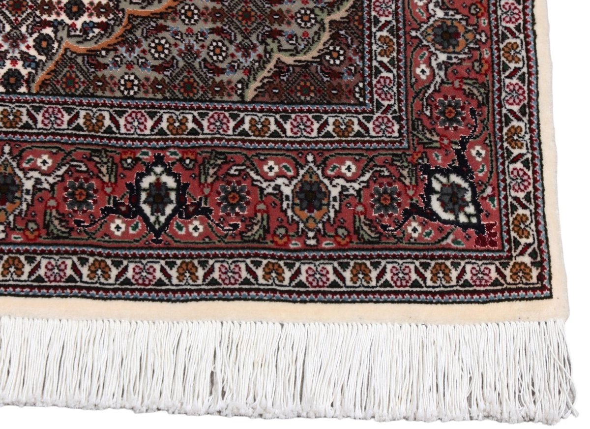 Für die besondere Eleganz des Täbriz-Flors sorgen hervorragende Materialien wie samtig anmutende Korkwolle und glänzende Seidenfäden. Die Knüpfqualität eines Täbriz-Teppichs lässt sich aus der angegebenen Raj-Zahl erschließen – je höher diese ausfällt, umso feiner ist die Knüpfdichte, die eine Million und mehr Knoten pro Quadratmeter erreichen kann. Bei besonders feingeknüpften Qualitäten kommt für die Kette statt des üblichen Baumwollgarns sogar Seide zum Einsatz.
