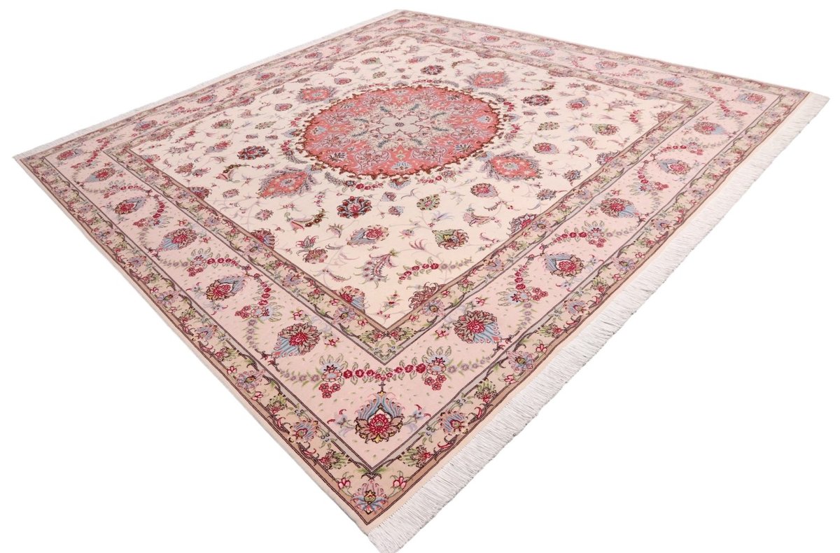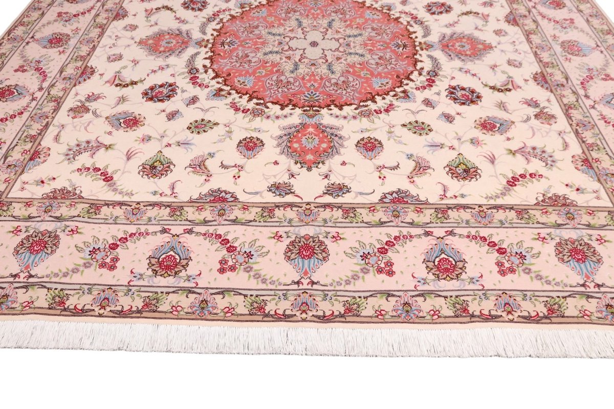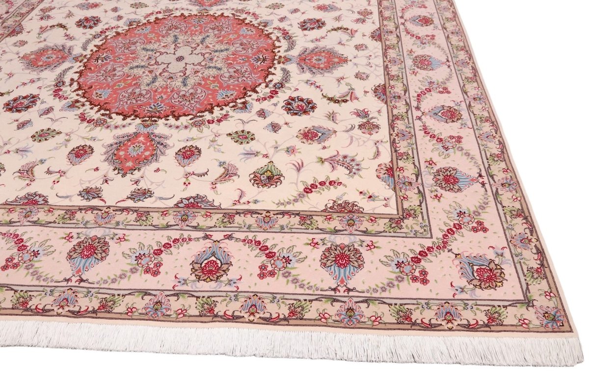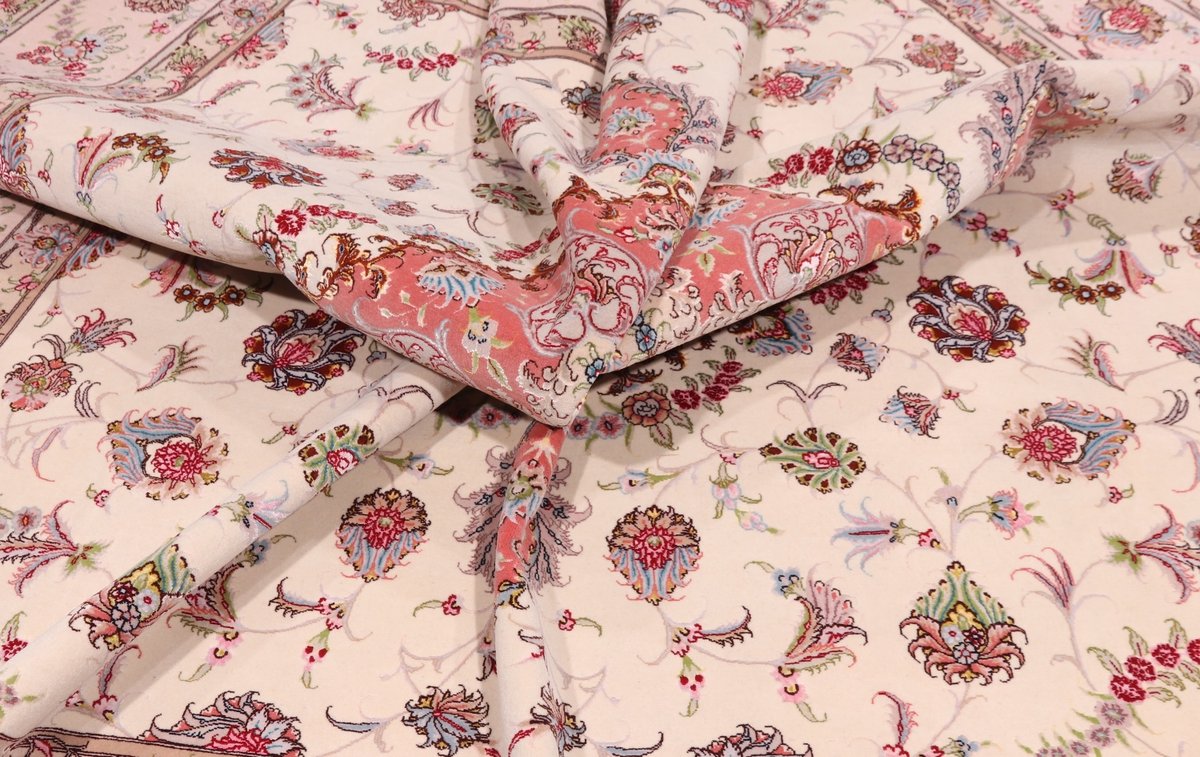 Für die besondere Eleganz des Täbriz-Flors sorgen hervorragende Materialien wie samtig anmutende Korkwolle und glänzende Seidenfäden. Die Knüpfqualität eines Täbriz-Teppichs lässt sich aus der angegebenen Raj-Zahl erschließen – je höher diese ausfällt, umso feiner ist die Knüpfdichte, die eine Million und mehr Knoten pro Quadratmeter erreichen kann. Bei besonders feingeknüpften Qualitäten kommt für die Kette statt des üblichen Baumwollgarns sogar Seide zum Einsatz.