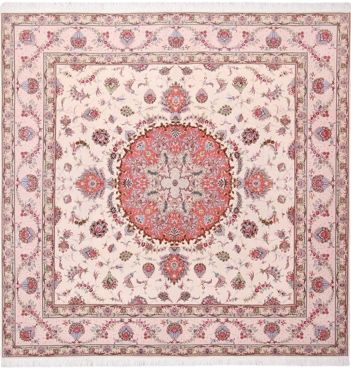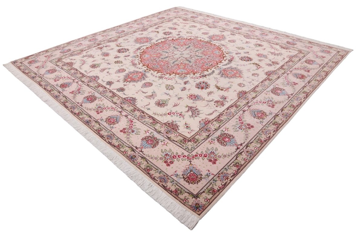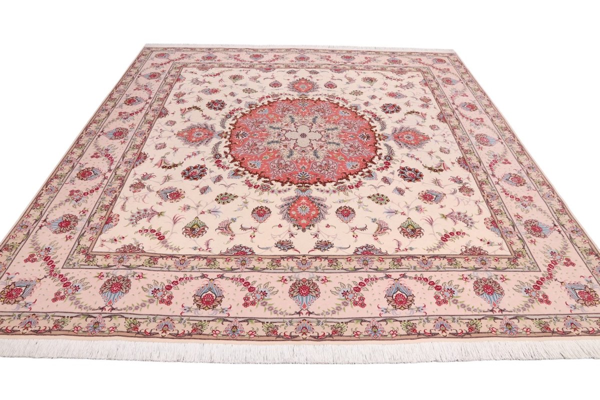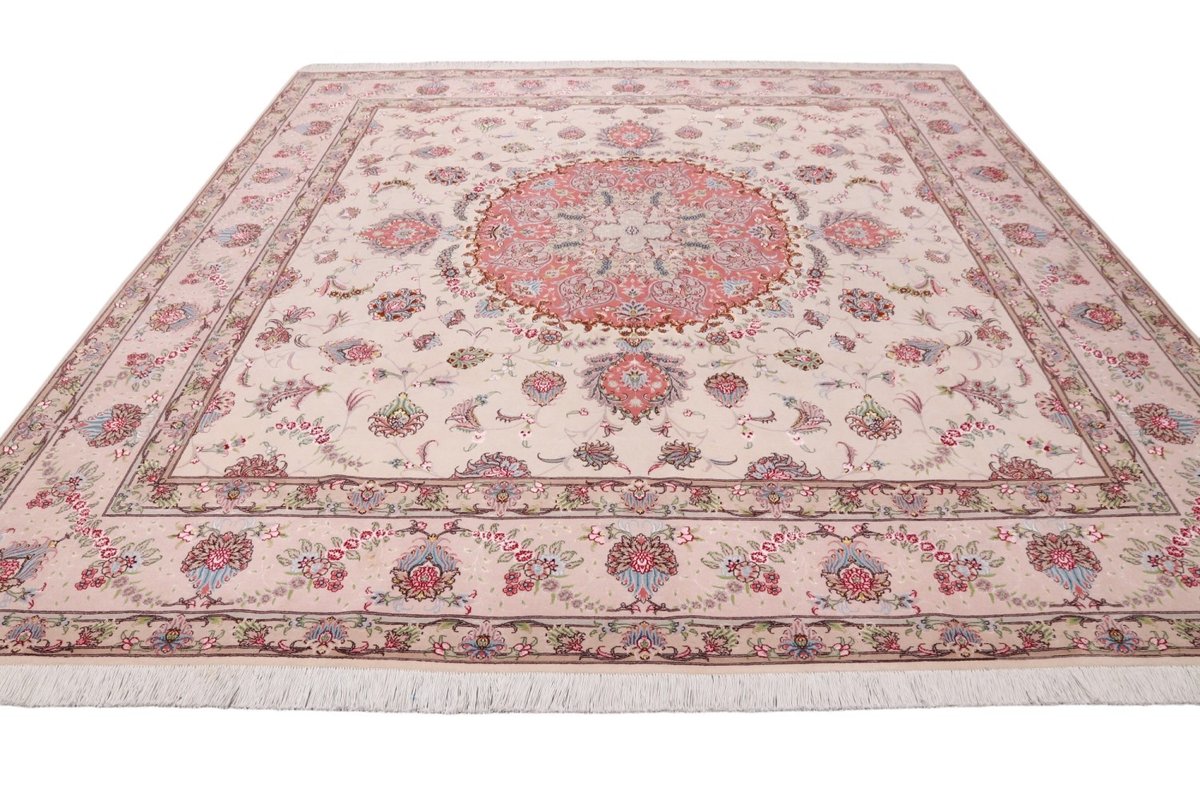 Für die besondere Eleganz des Täbriz-Flors sorgen hervorragende Materialien wie samtig anmutende Korkwolle und glänzende Seidenfäden. Die Knüpfqualität eines Täbriz-Teppichs lässt sich aus der angegebenen Raj-Zahl erschließen – je höher diese ausfällt, umso feiner ist die Knüpfdichte, die eine Million und mehr Knoten pro Quadratmeter erreichen kann. Bei besonders feingeknüpften Qualitäten kommt für die Kette statt des üblichen Baumwollgarns sogar Seide zum Einsatz.