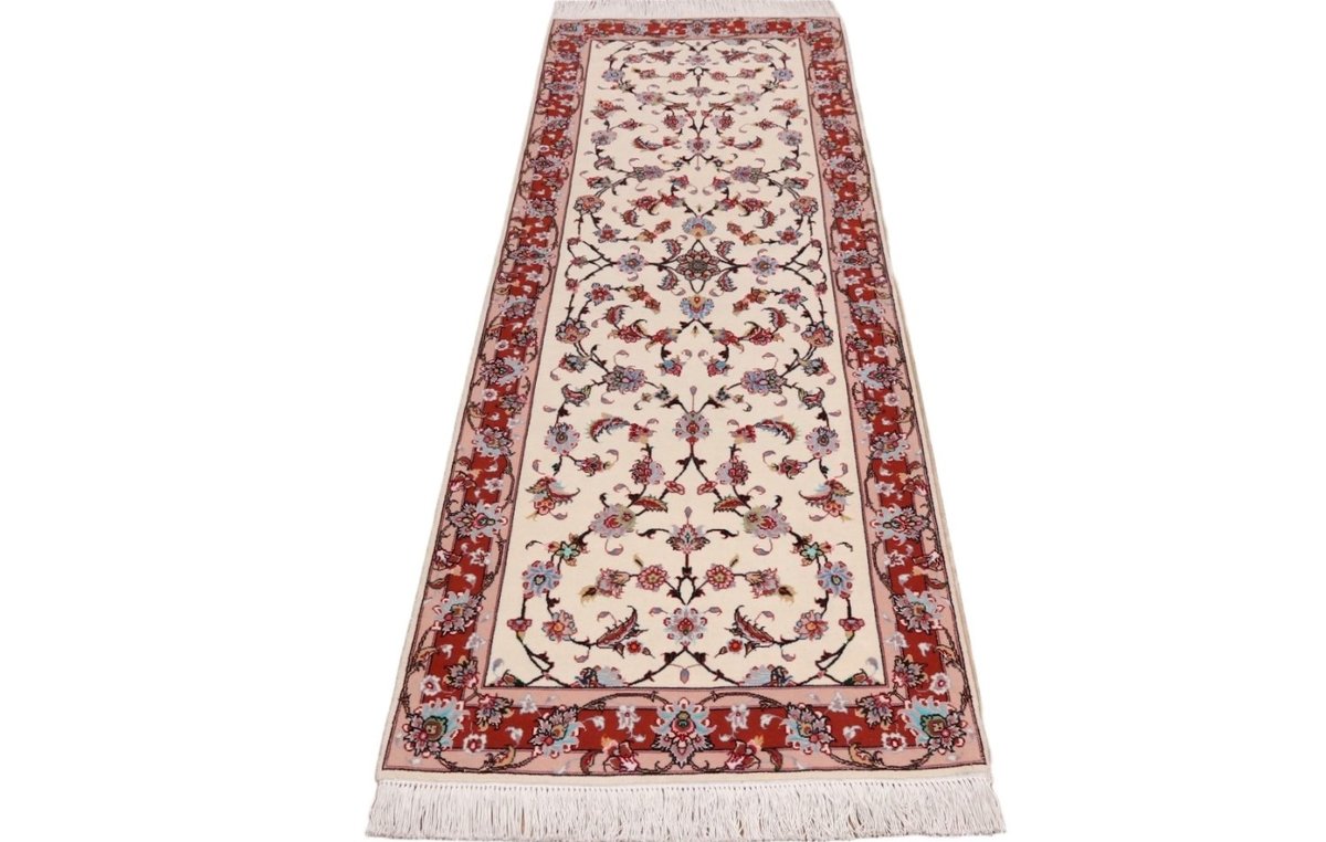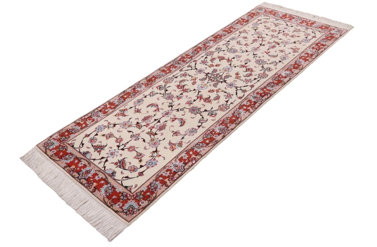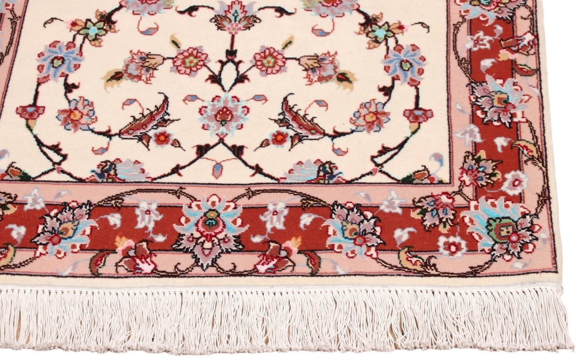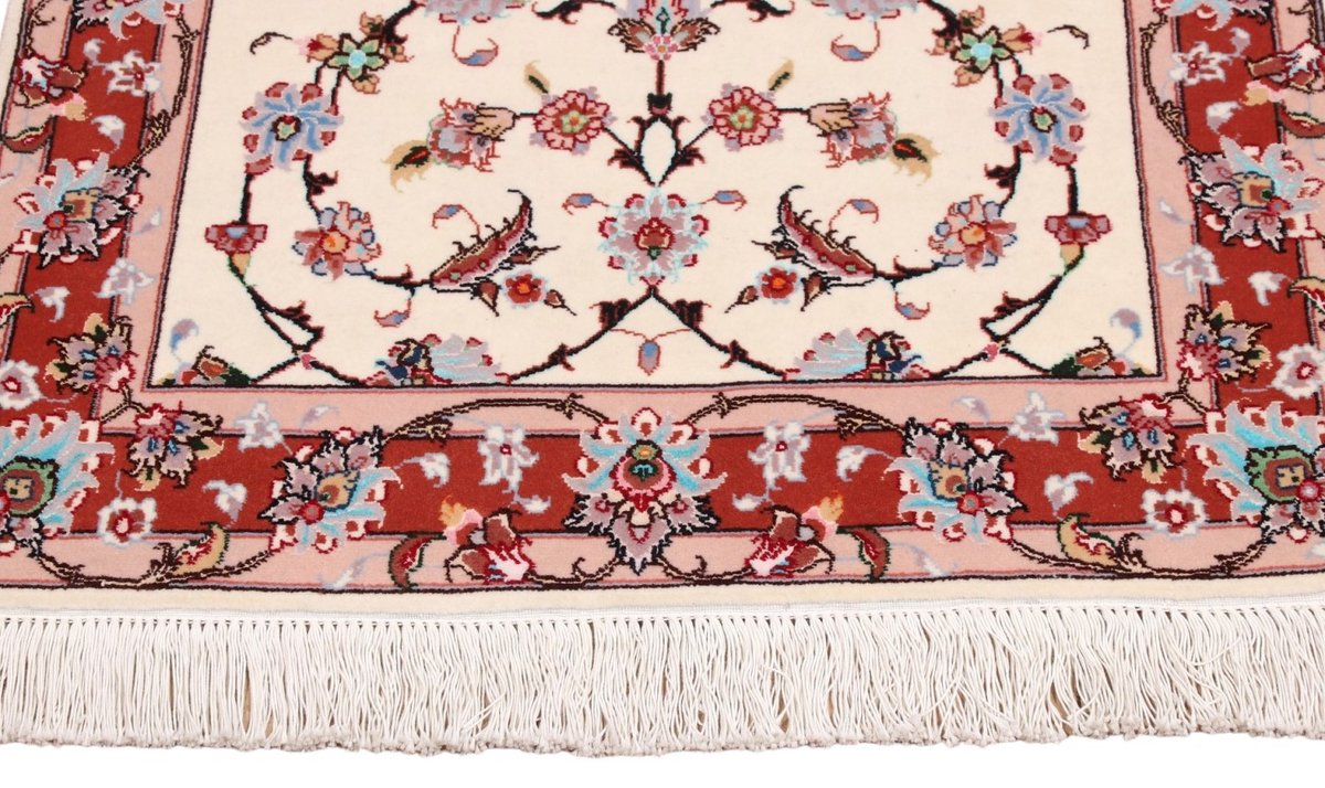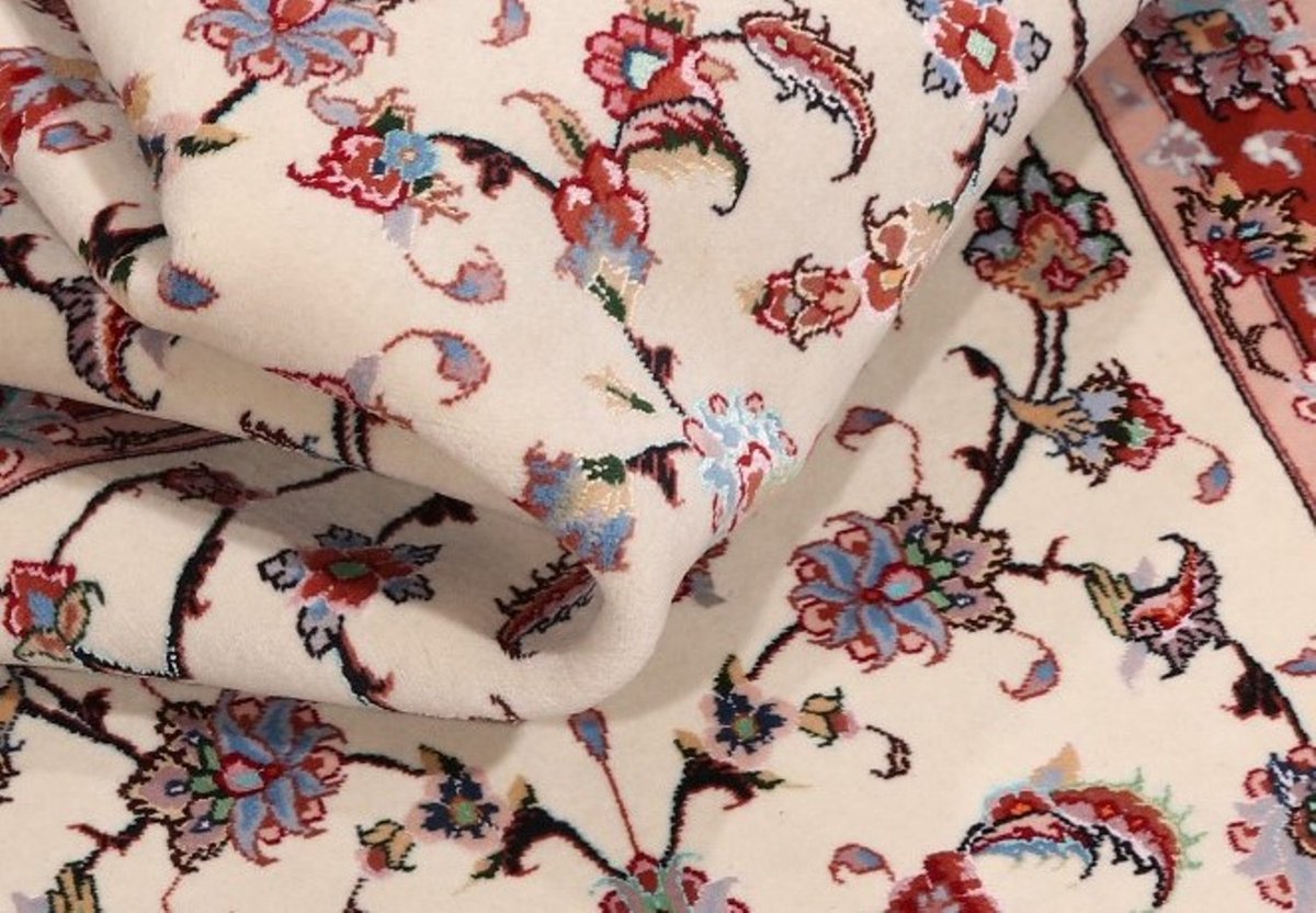 Für die besondere Eleganz des Täbriz-Flors sorgen hervorragende Materialien wie samtig anmutende Korkwolle und glänzende Seidenfäden. Die Knüpfqualität eines Täbriz-Teppichs lässt sich aus der angegebenen Raj-Zahl erschließen – je höher diese ausfällt, umso feiner ist die Knüpfdichte, die eine Million und mehr Knoten pro Quadratmeter erreichen kann. Bei besonders feingeknüpften Qualitäten kommt für die Kette statt des üblichen Baumwollgarns sogar Seide zum Einsatz.