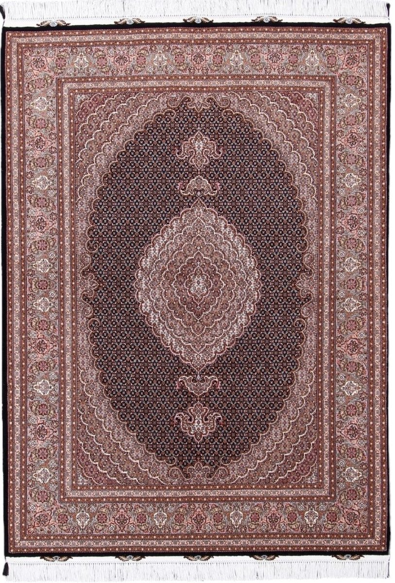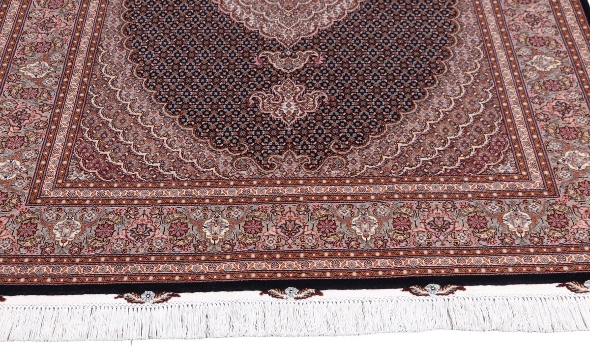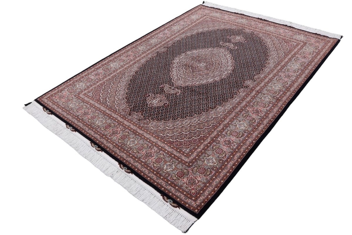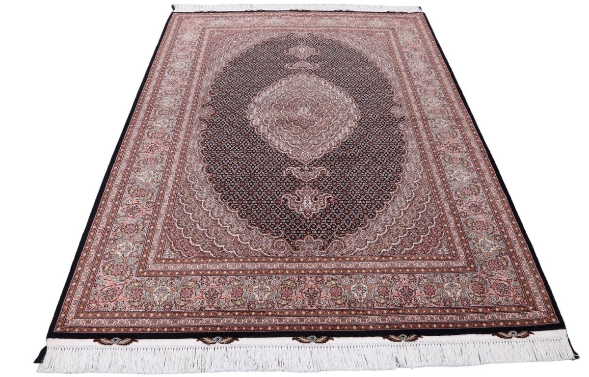 Für die besondere Eleganz des Täbriz-Flors sorgen hervorragende Materialien wie samtig anmutende Korkwolle und glänzende Seidenfäden. Die Knüpfqualität eines Täbriz-Teppichs lässt sich aus der angegebenen Raj-Zahl erschließen – je höher diese ausfällt, umso feiner ist die Knüpfdichte, die eine Million und mehr Knoten pro Quadratmeter erreichen kann. Bei besonders feingeknüpften Qualitäten kommt für die Kette statt des üblichen Baumwollgarns sogar Seide zum Einsatz.