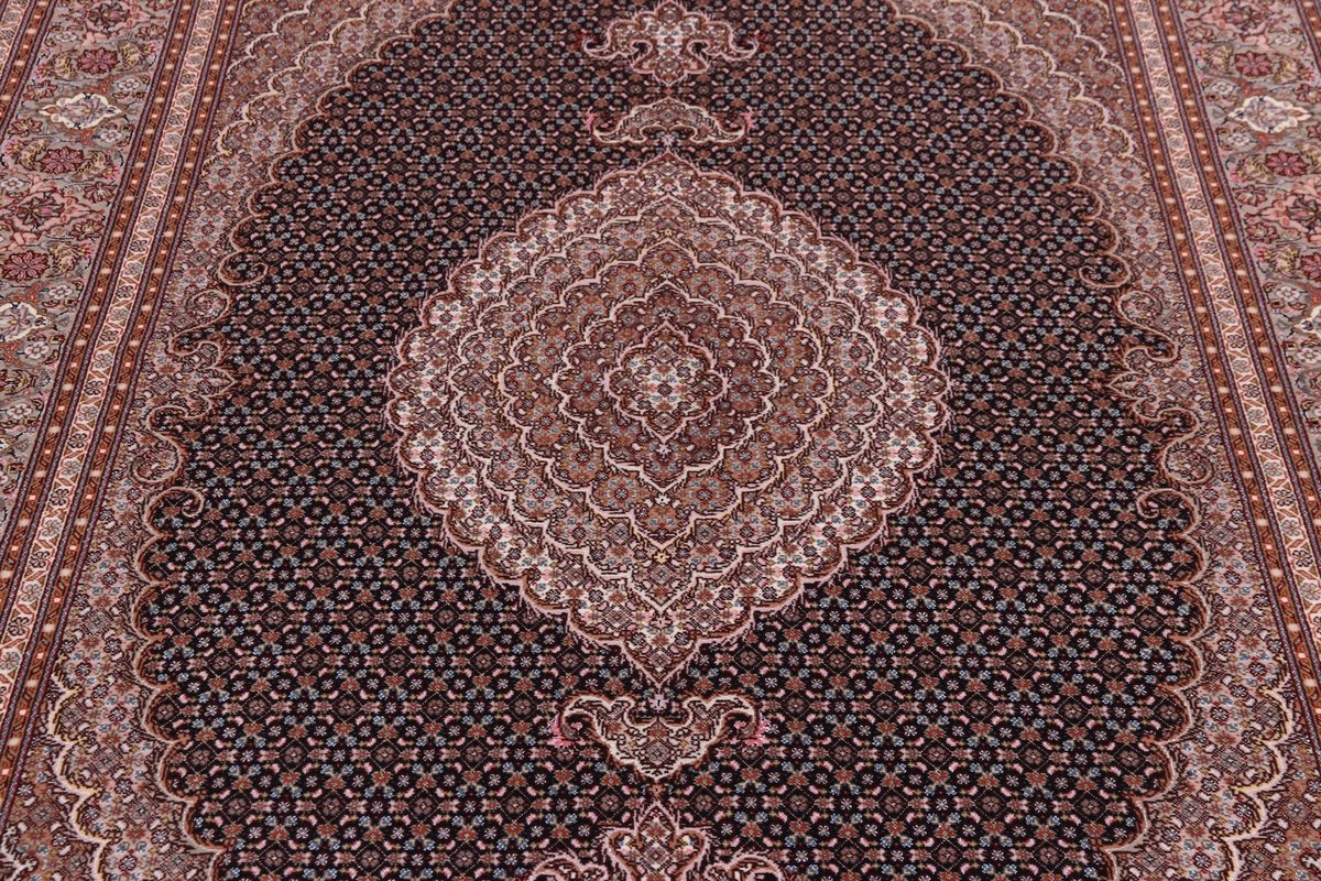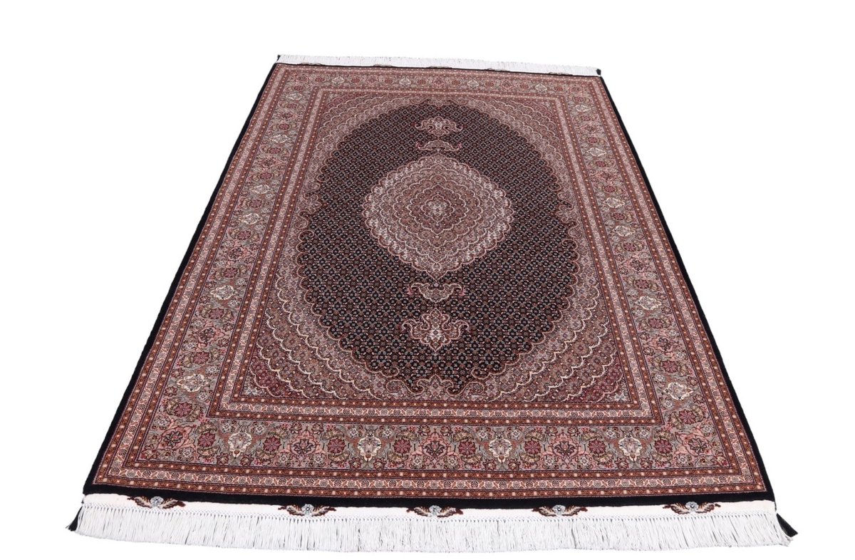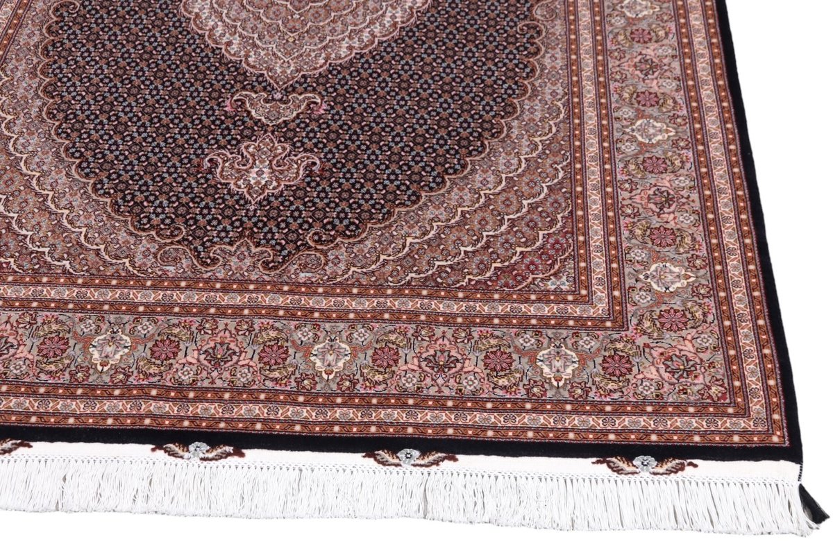 Für die besondere Eleganz des Täbriz-Flors sorgen hervorragende Materialien wie samtig anmutende Korkwolle und glänzende Seidenfäden. Die Knüpfqualität eines Täbriz-Teppichs lässt sich aus der angegebenen Raj-Zahl erschließen – je höher diese ausfällt, umso feiner ist die Knüpfdichte, die eine Million und mehr Knoten pro Quadratmeter erreichen kann. Bei besonders feingeknüpften Qualitäten kommt für die Kette statt des üblichen Baumwollgarns sogar Seide zum Einsatz.