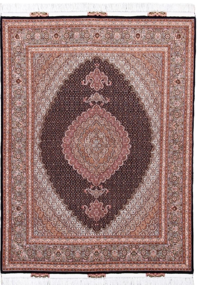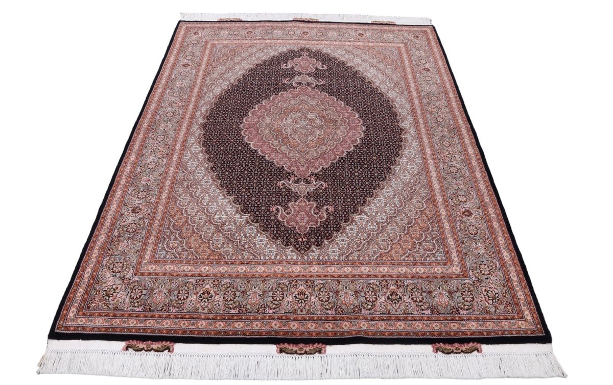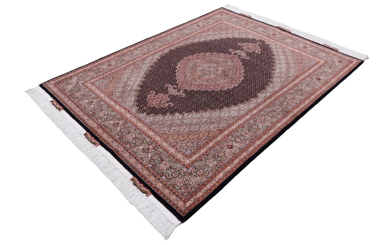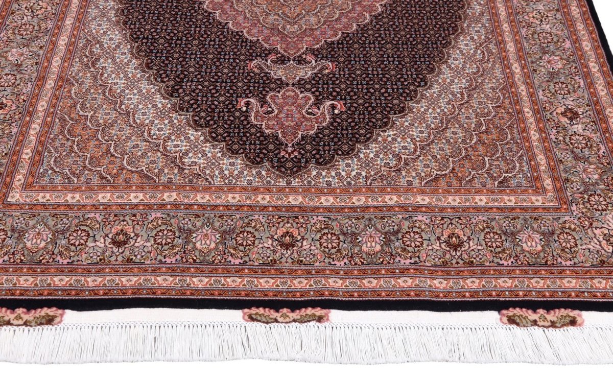 Für die besondere Eleganz des Täbriz-Flors sorgen hervorragende Materialien wie samtig anmutende Korkwolle und glänzende Seidenfäden. Die Knüpfqualität eines Täbriz-Teppichs lässt sich aus der angegebenen Raj-Zahl erschließen – je höher diese ausfällt, umso feiner ist die Knüpfdichte, die eine Million und mehr Knoten pro Quadratmeter erreichen kann. Bei besonders feingeknüpften Qualitäten kommt für die Kette statt des üblichen Baumwollgarns sogar Seide zum Einsatz.