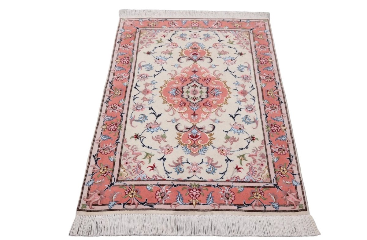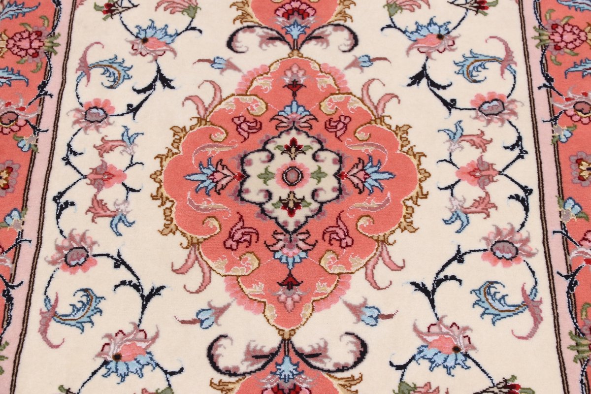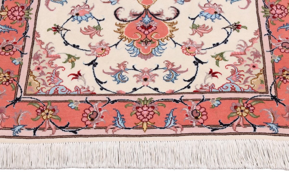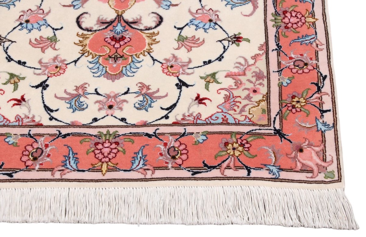 Für die besondere Eleganz des Täbriz-Flors sorgen hervorragende Materialien wie samtig anmutende Korkwolle und glänzende Seidenfäden. Die Knüpfqualität eines Täbriz-Teppichs lässt sich aus der angegebenen Raj-Zahl erschließen – je höher diese ausfällt, umso feiner ist die Knüpfdichte, die eine Million und mehr Knoten pro Quadratmeter erreichen kann. Bei besonders feingeknüpften Qualitäten kommt für die Kette statt des üblichen Baumwollgarns sogar Seide zum Einsatz.
