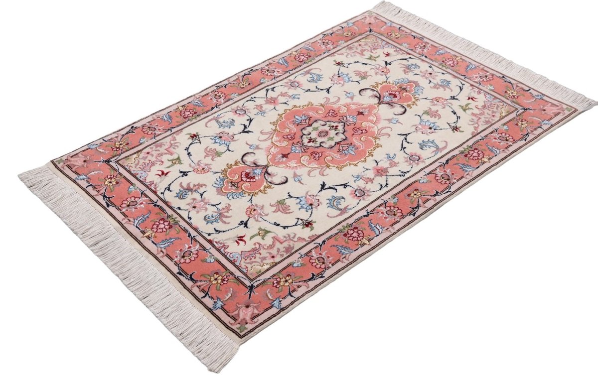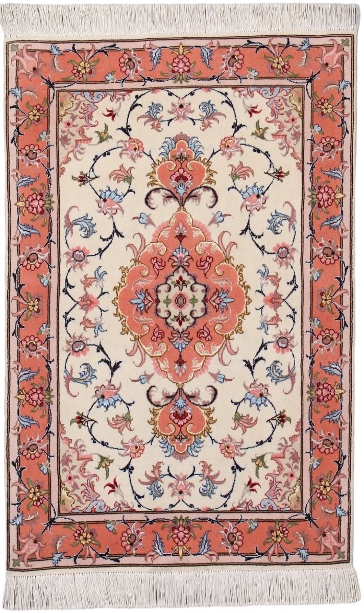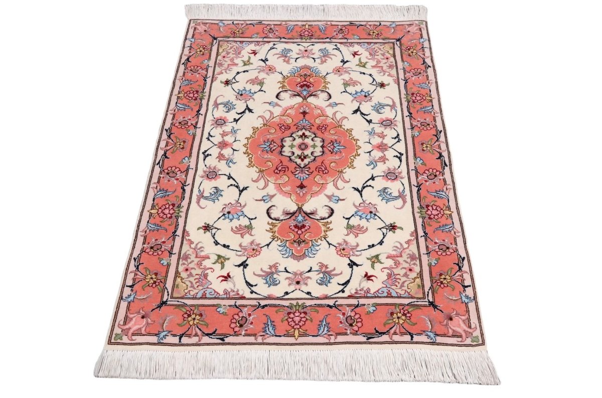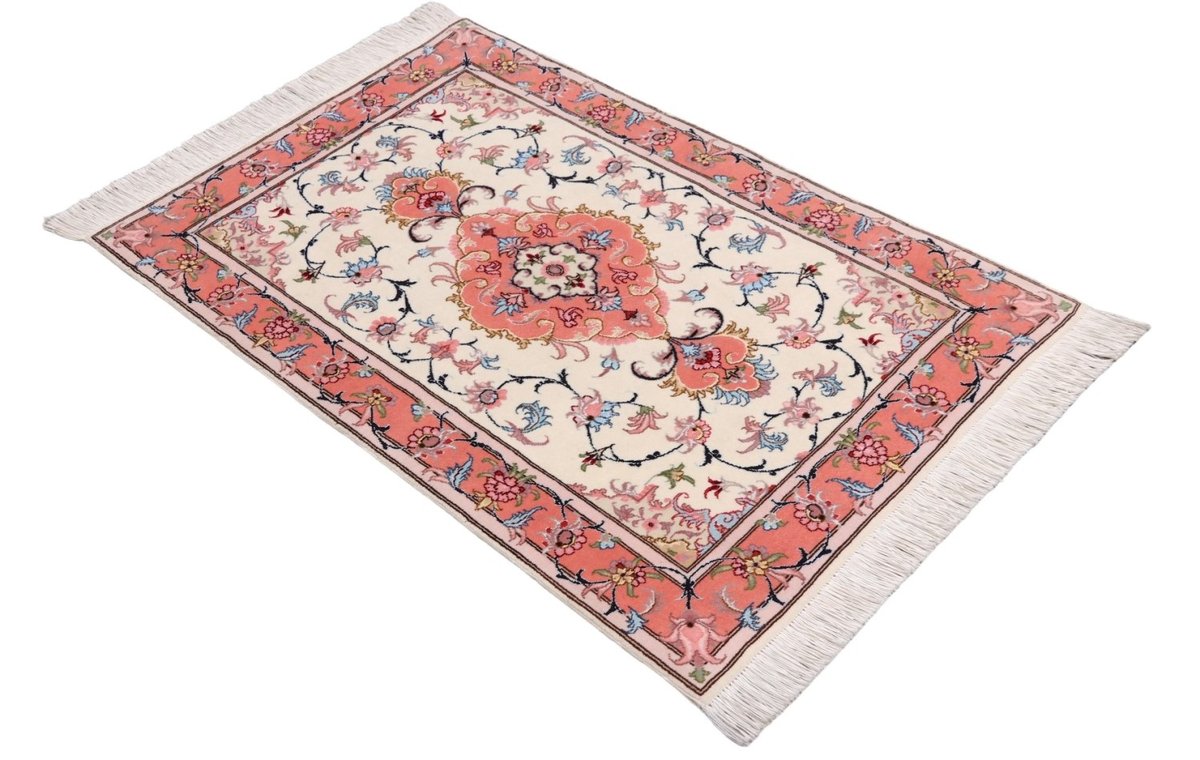 Für die besondere Eleganz des Täbriz-Flors sorgen hervorragende Materialien wie samtig anmutende Korkwolle und glänzende Seidenfäden. Die Knüpfqualität eines Täbriz-Teppichs lässt sich aus der angegebenen Raj-Zahl erschließen – je höher diese ausfällt, umso feiner ist die Knüpfdichte, die eine Million und mehr Knoten pro Quadratmeter erreichen kann. Bei besonders feingeknüpften Qualitäten kommt für die Kette statt des üblichen Baumwollgarns sogar Seide zum Einsatz.