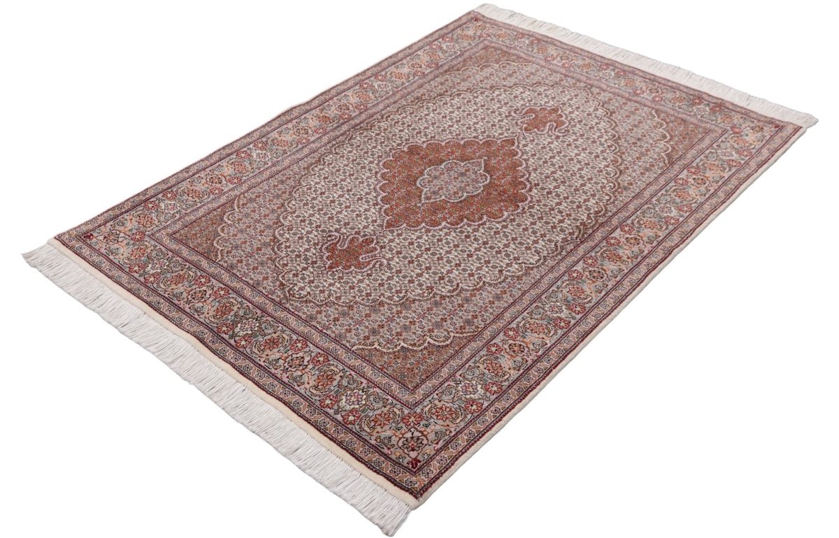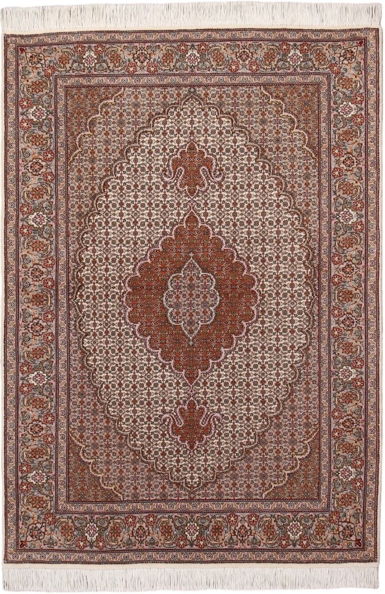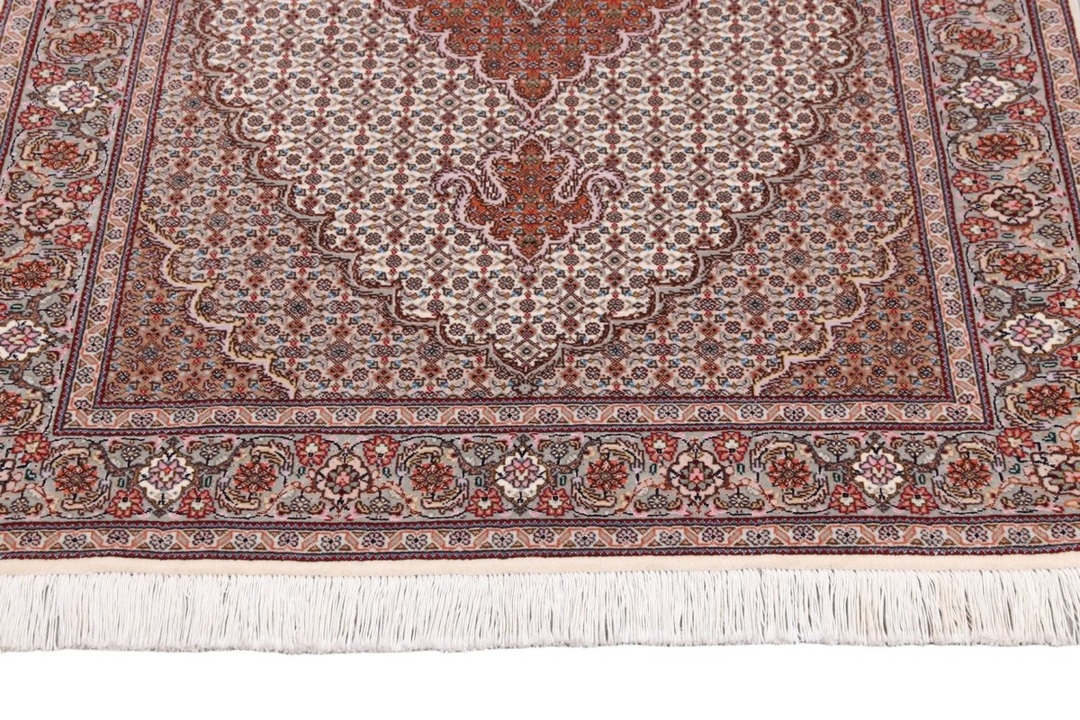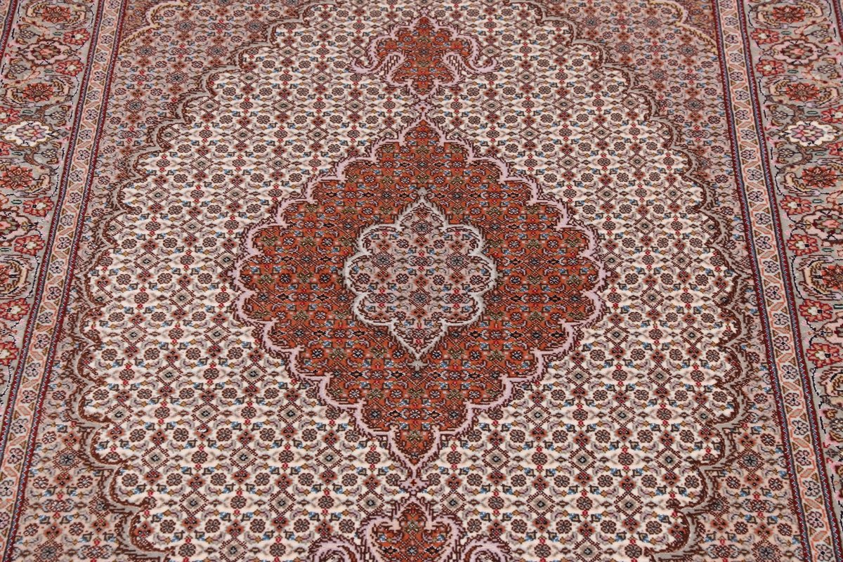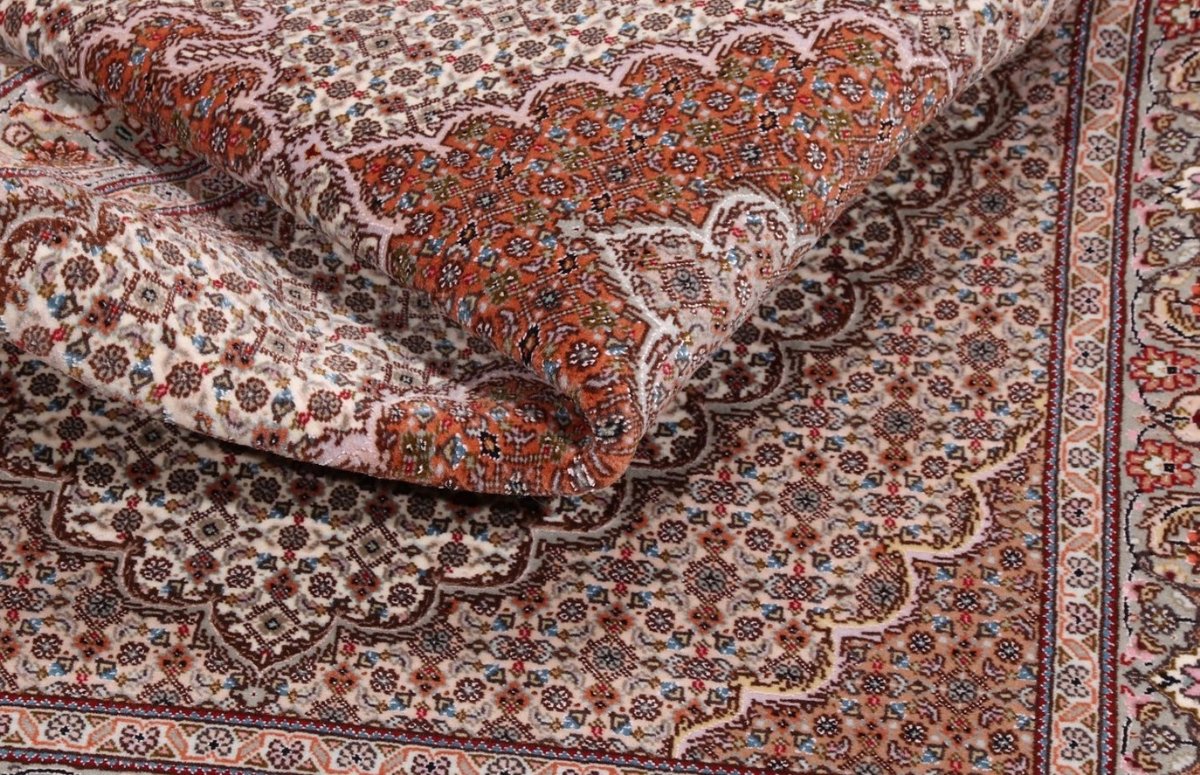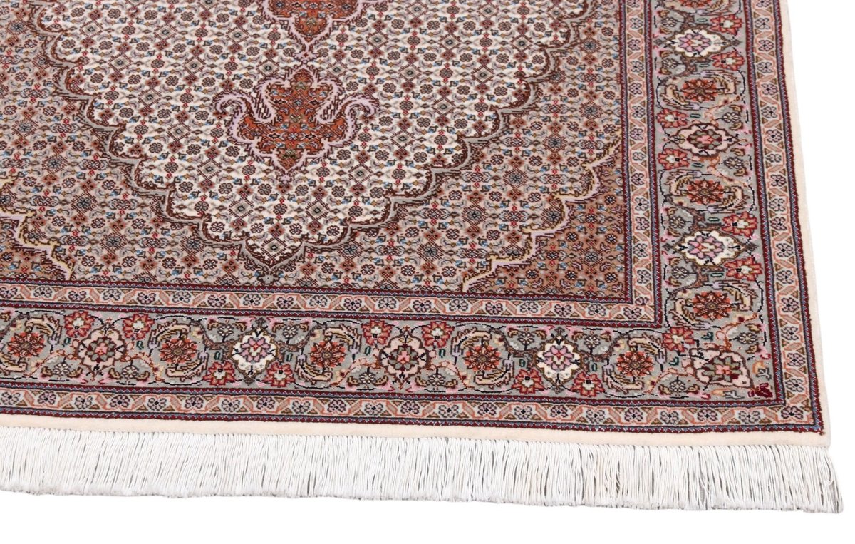 Für die besondere Eleganz des Täbriz-Flors sorgen hervorragende Materialien wie samtig anmutende Korkwolle und glänzende Seidenfäden. Die Knüpfqualität eines Täbriz-Teppichs lässt sich aus der angegebenen Raj-Zahl erschließen – je höher diese ausfällt, umso feiner ist die Knüpfdichte, die eine Million und mehr Knoten pro Quadratmeter erreichen kann. Bei besonders feingeknüpften Qualitäten kommt für die Kette statt des üblichen Baumwollgarns sogar Seide zum Einsatz.